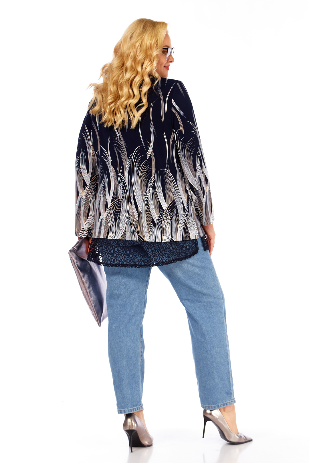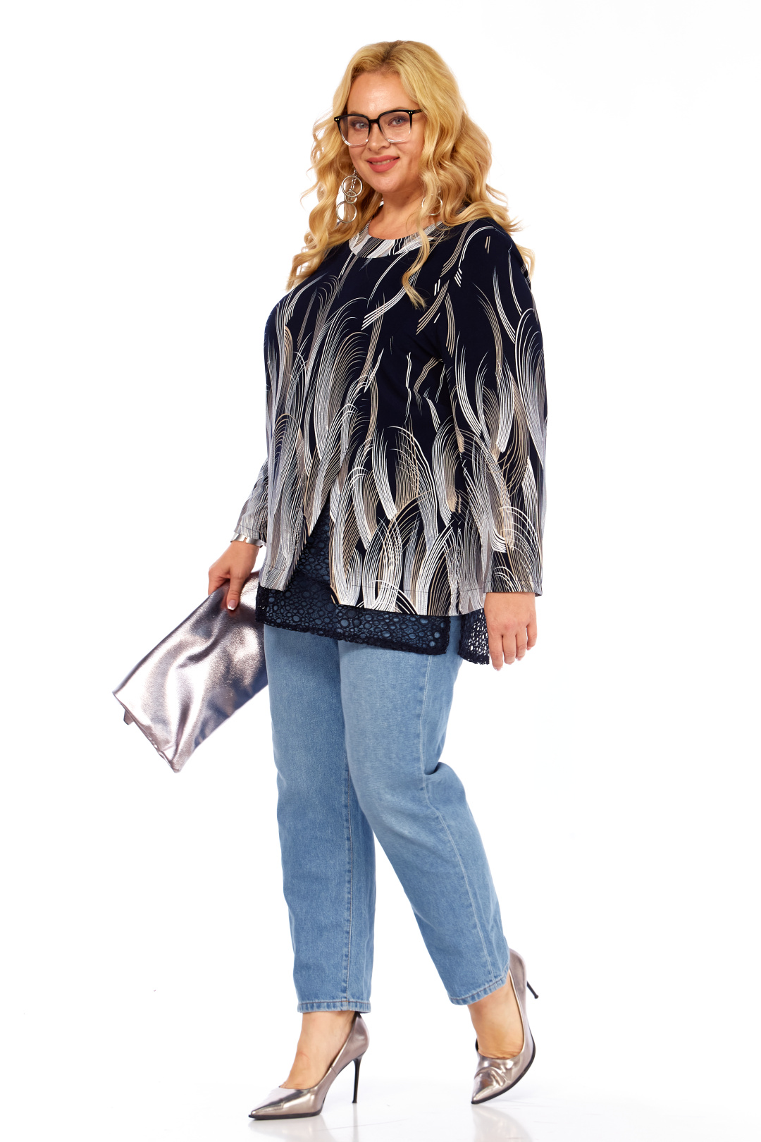 Модель имеет свободный крой оверсайз, который обеспечивает идеальную посадку на фигуру Plus Size (от 54 до 64), скрывая нежелательные объемы и гарантируя полную свободу движений. Блуза оснащена длинным втачным рукавом и классическим круглым вырезом горловины. Для дополнительного совершенства силуэта предусмотрены мягкие подплечники из тонкого поролона, которые аккуратно приподнимают линию плеч.