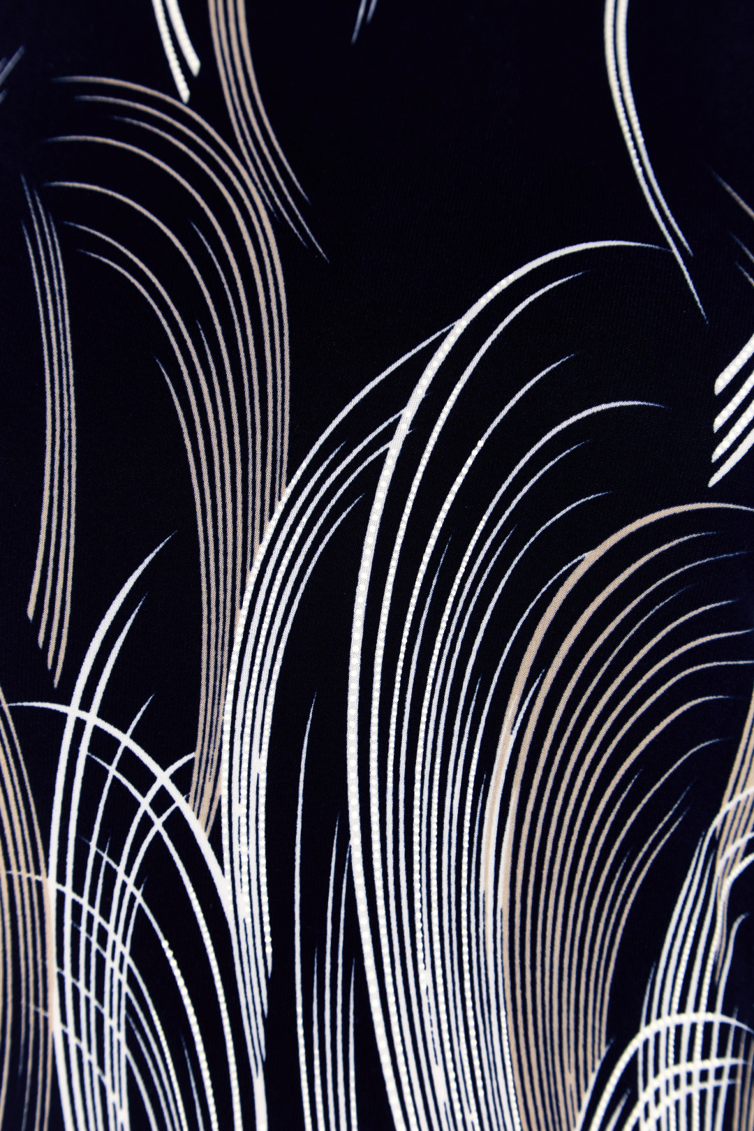 Насыщенный тёмно-синий фон выступает идеальной основой для динамичного графического принта. Узор представляет собой множество тонких, изогнутых вертикальных линий – своего рода "росчерков пера" или "космических траекторий". Цветовая палитра принта – изысканное сочетание белых, серебристо-серых и бежево-золотистых оттенков. Этот рисунок создаёт визуально вытягивающий и стройнящий эффект, придает образу выразительность и движение.