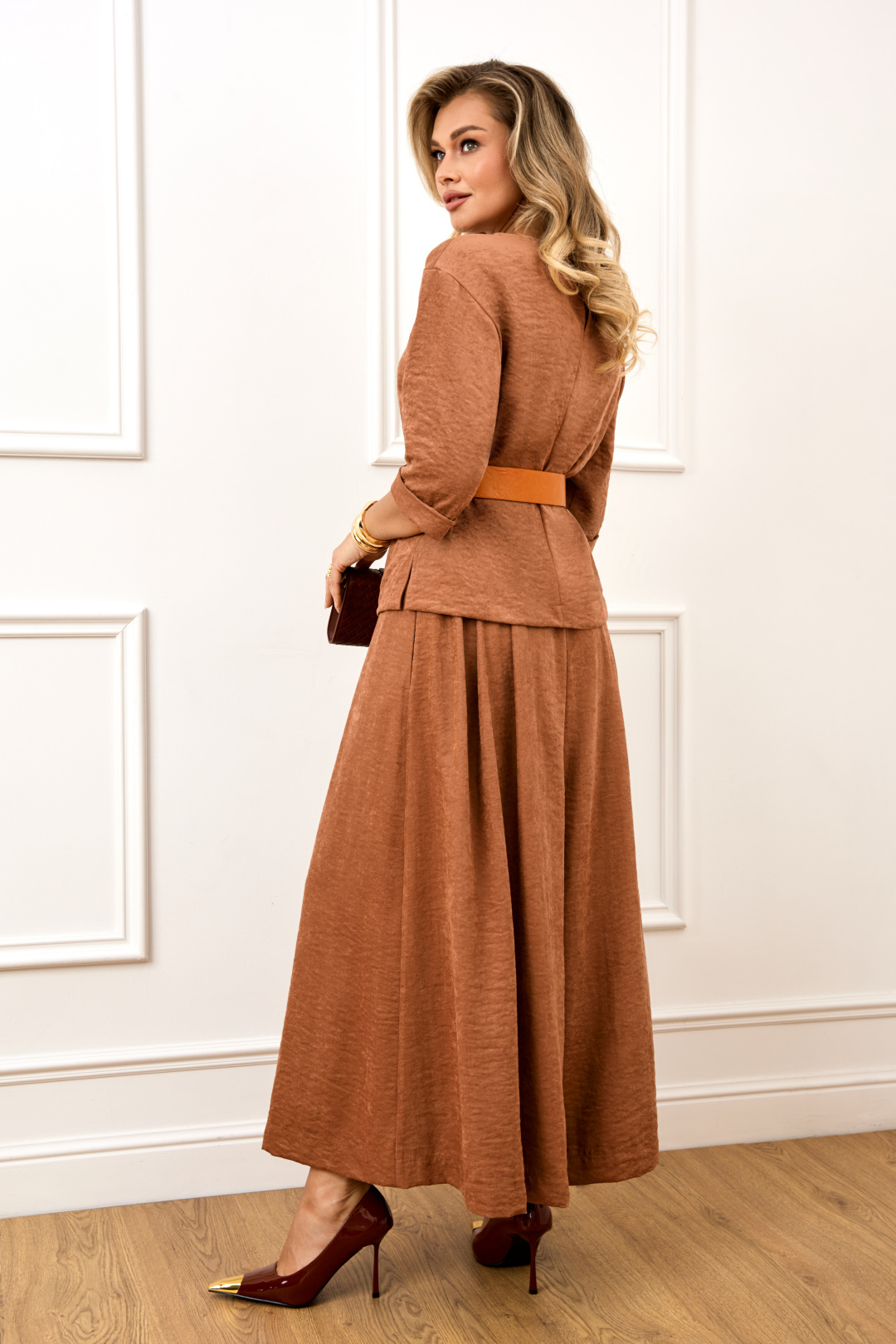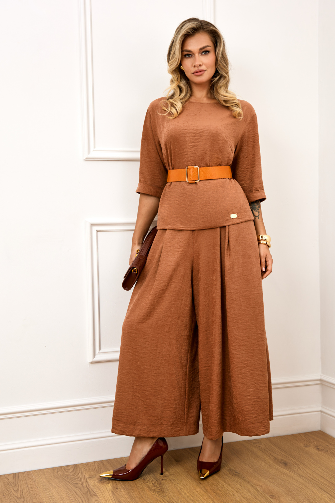 Стильный женский комплект, состоит из блузы и брюк-юбки. Блуза прямого силуэта с эффектом жатки, что придаёт изделию особый стиль. Блуза с нагрудными выточками, рукав длиной ¾, с манжетой, по бокам с небольшими разрезами (разрез 9 см). Перед блузки декорирован пришивной дизайнерской нашивкой. Брюки-юбка прямые, со складками по переду и спинке с эффектом жатки. Брюки-юбка на поясе, по бокам с резинкой, по спинке с застежкой на потайную молнию и пуговицу. В комплекте идет съемный кожаный пояс.