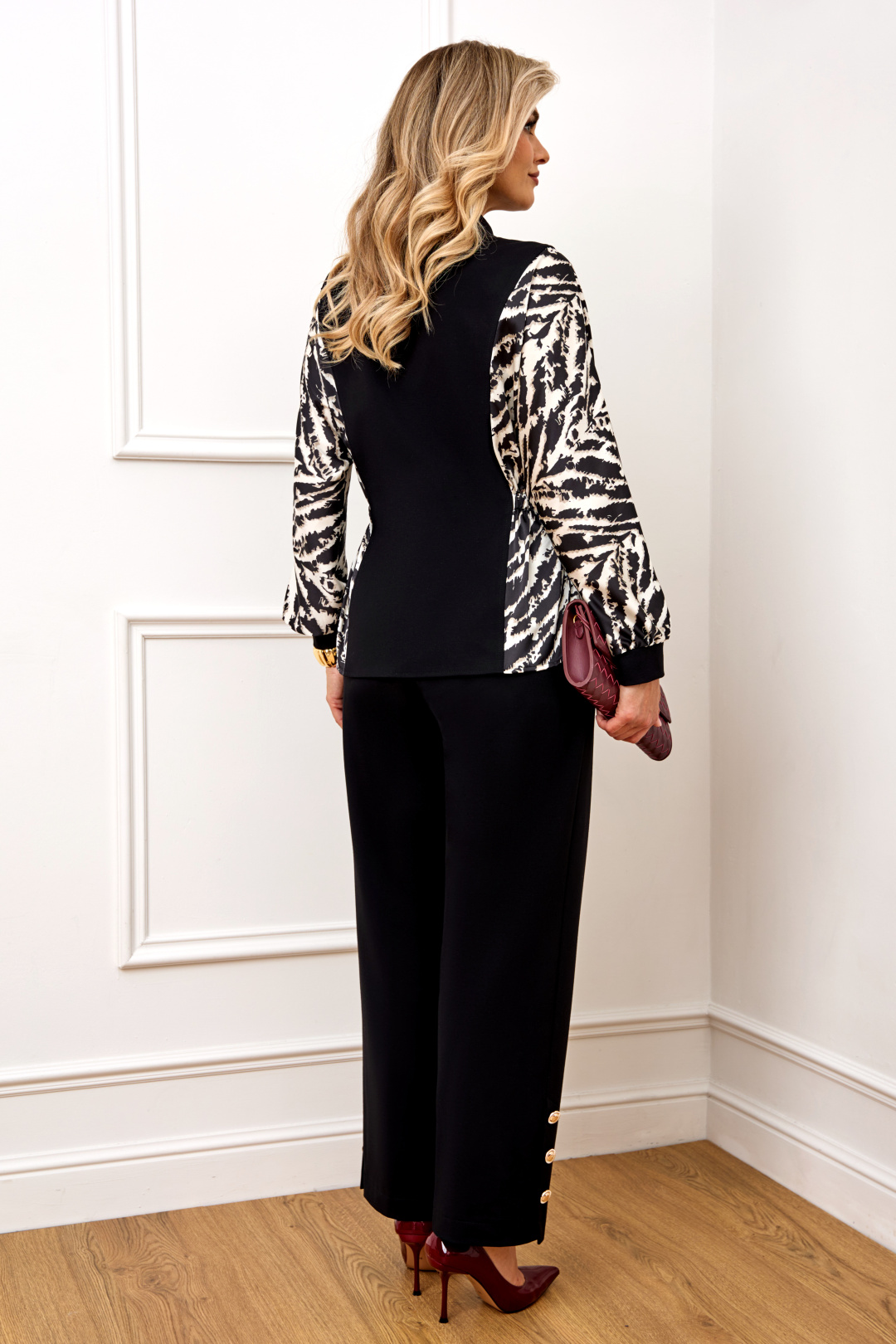 Стильный комплект, состоит из блузы и брюк. Блуза полуприлегающего силуэта, выполнена из высококачественной трикотажной ткани, рукав и бочек выполнены из атласной ткани с модным дизайнерским принтом. Блуза с горловиной стойкой и застёжкой по переду на пуговицы. Рукав полной длины, выполнен в стиле летучая мышь, с манжетой из однотонного трикотажа. На талии по бокам блуза с резинкой. Все элементы блузы создают неповторимый образ, модель невероятно стройнит. Брюки выполнены из высококачественного трикотажа, на поясе, по спинке на резинке, по переду с застежкой на пуговицу и молнию. В боковых швах брюк функциональные карманы. По бокам брюк снизу шлица, декорированная пришивными пуговицами.