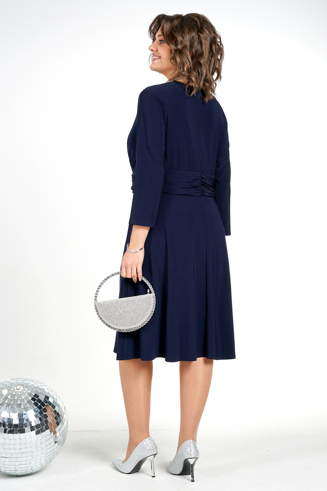 Платье полуприлегающего верху силуэта с расширением книзу, отрезное по линии талии, с притачным задрапированным поясом, по переду декорированный пришивным украшением. Лиф на подкладке.