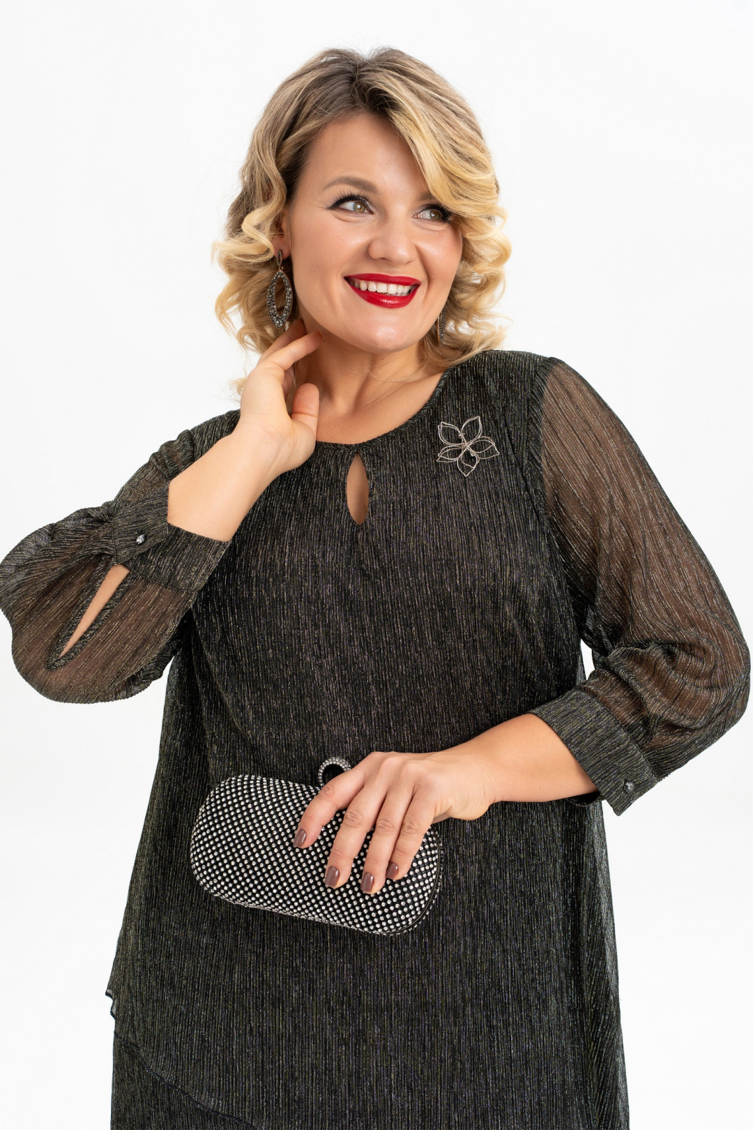 Это итальянское платье- имитация костюма нарядного стиля больших размеров станет отличным выбором для тех, кто ценит элегантность и стиль. Платье сочетает в себе комфорт и долговечность. Ткань "плиссе" придает изделию оригинальную рельефную текстуру, которая делает его особенно привлекательным. Основная особенность этого платья — силуэт в виде трапеции, который подходит для разных типов фигур, а также каплевидный декор по горловине полочки. Длина юбки — миди. Платье предназначено для женщин плюс сайз и станет идеальным выбором для вечерних мероприятий, новогодних праздников, свадеб или юбилеев. Благодаря универсальному дизайну ее можно сочетать с различными нарядами. Это отличный подарок для жены, мамы, сестры или девушки. Платье украшено брошей-цветком и съемным поясом, которая добавляет элегантности и шарма, и ее можно заменить на другие аксессуары, адаптируя наряд под разные события и настроения. Легкая трикотажная подкладка делает его еще более комфортным, а рукава 3/4 и рубашечный манжет с застежкой на петлю и пуговицу делают платье подходящим для большинства женщин. Выбирая это платье больших размеров , Вы получаете не только стильное и элегантное платье, но и качественное удобное изделие, которое скрывает все неровности фигуры и будет Вашим верным спутником на любых праздниках .