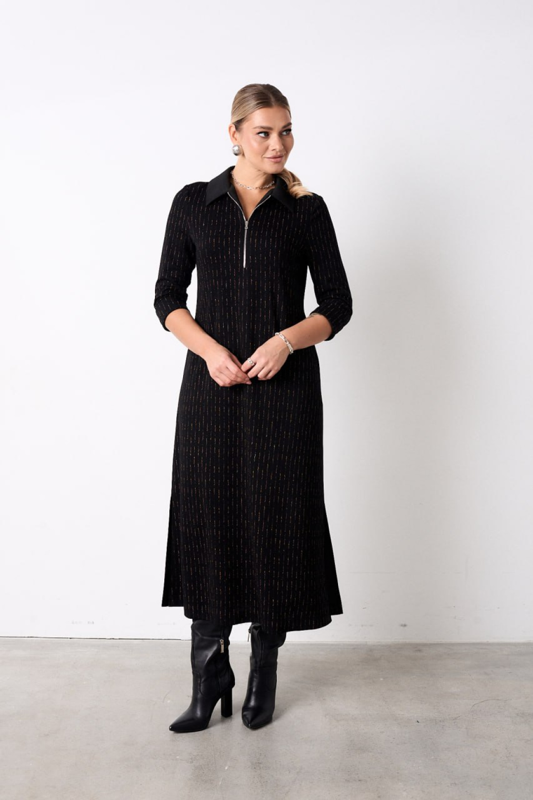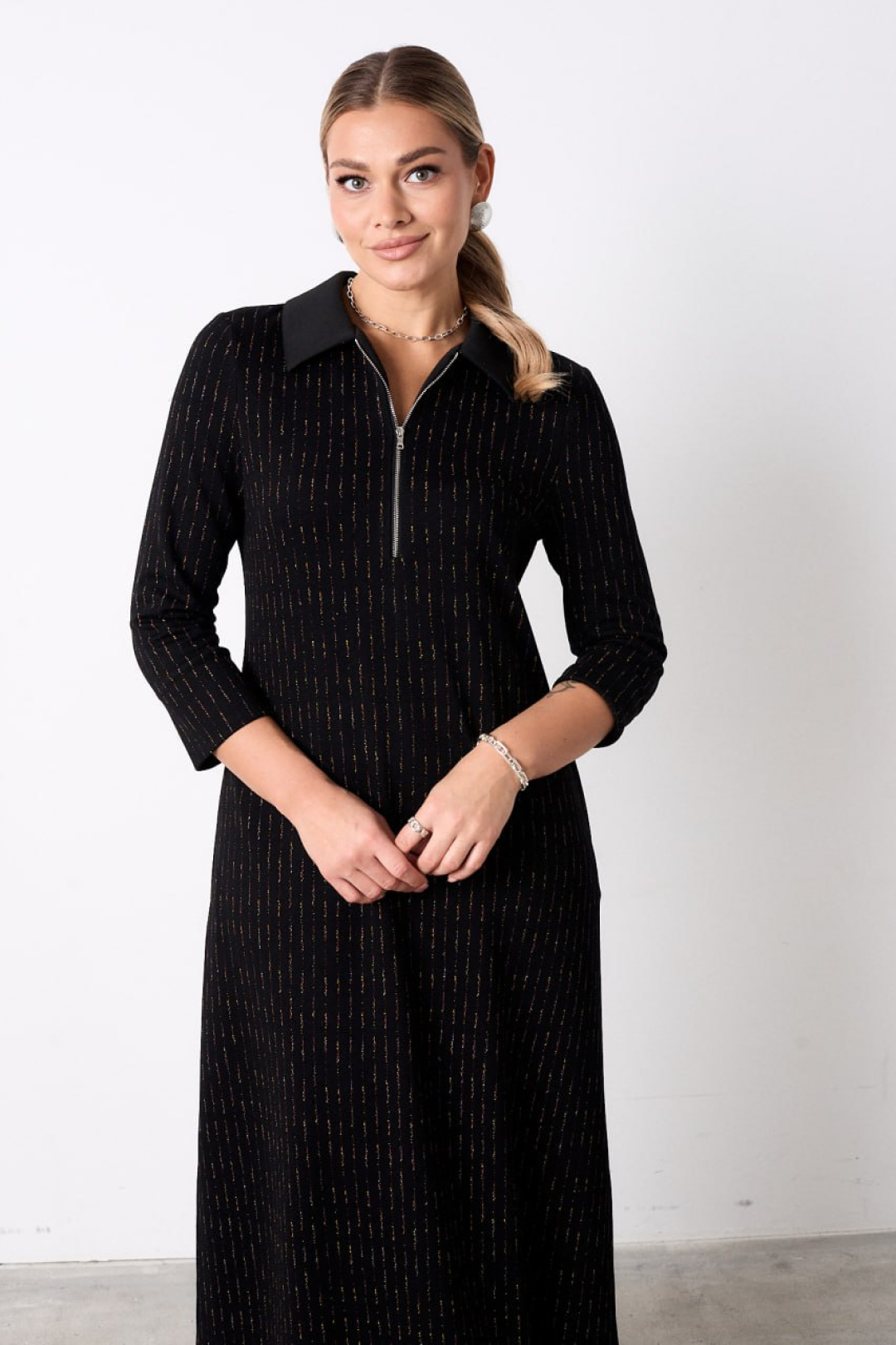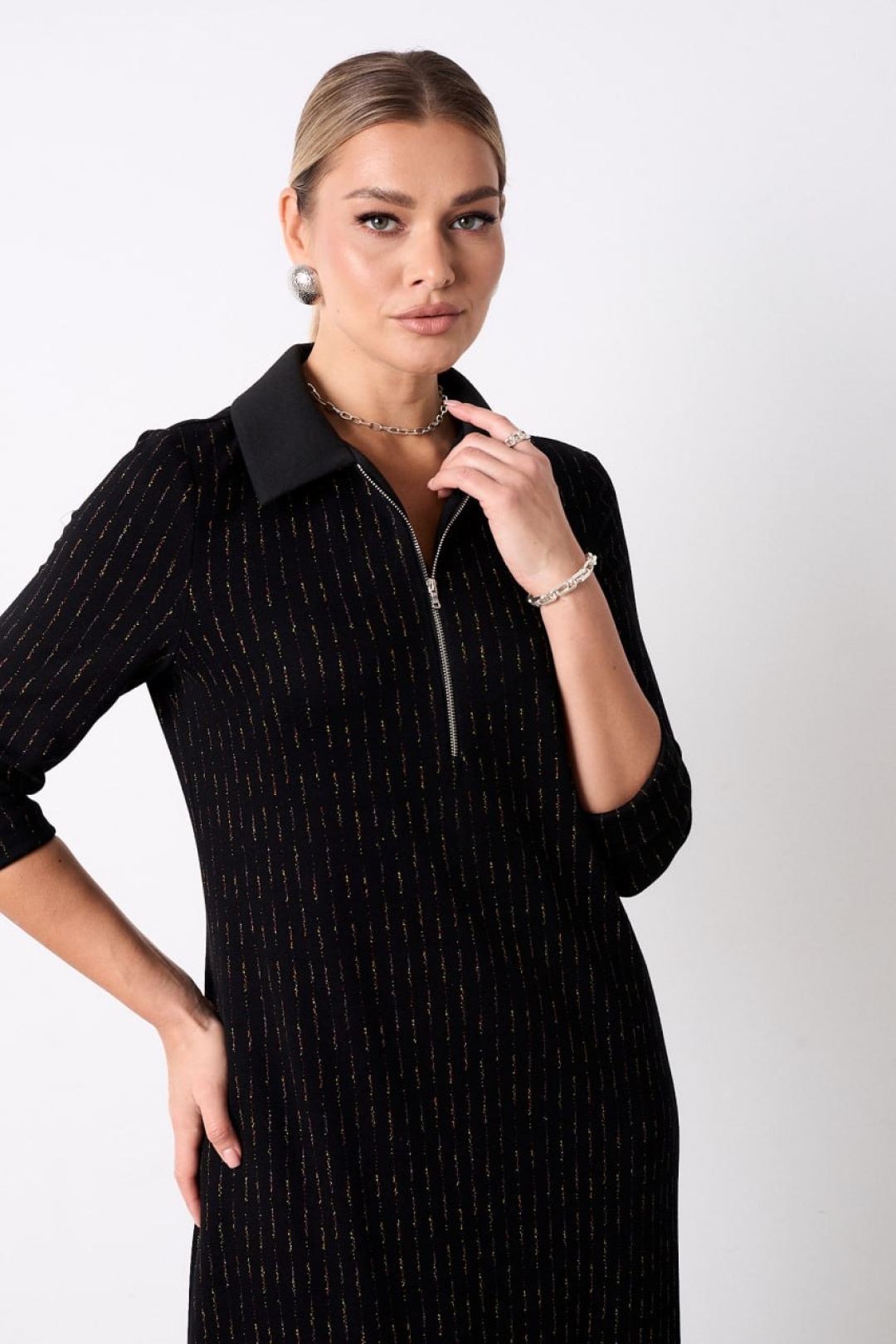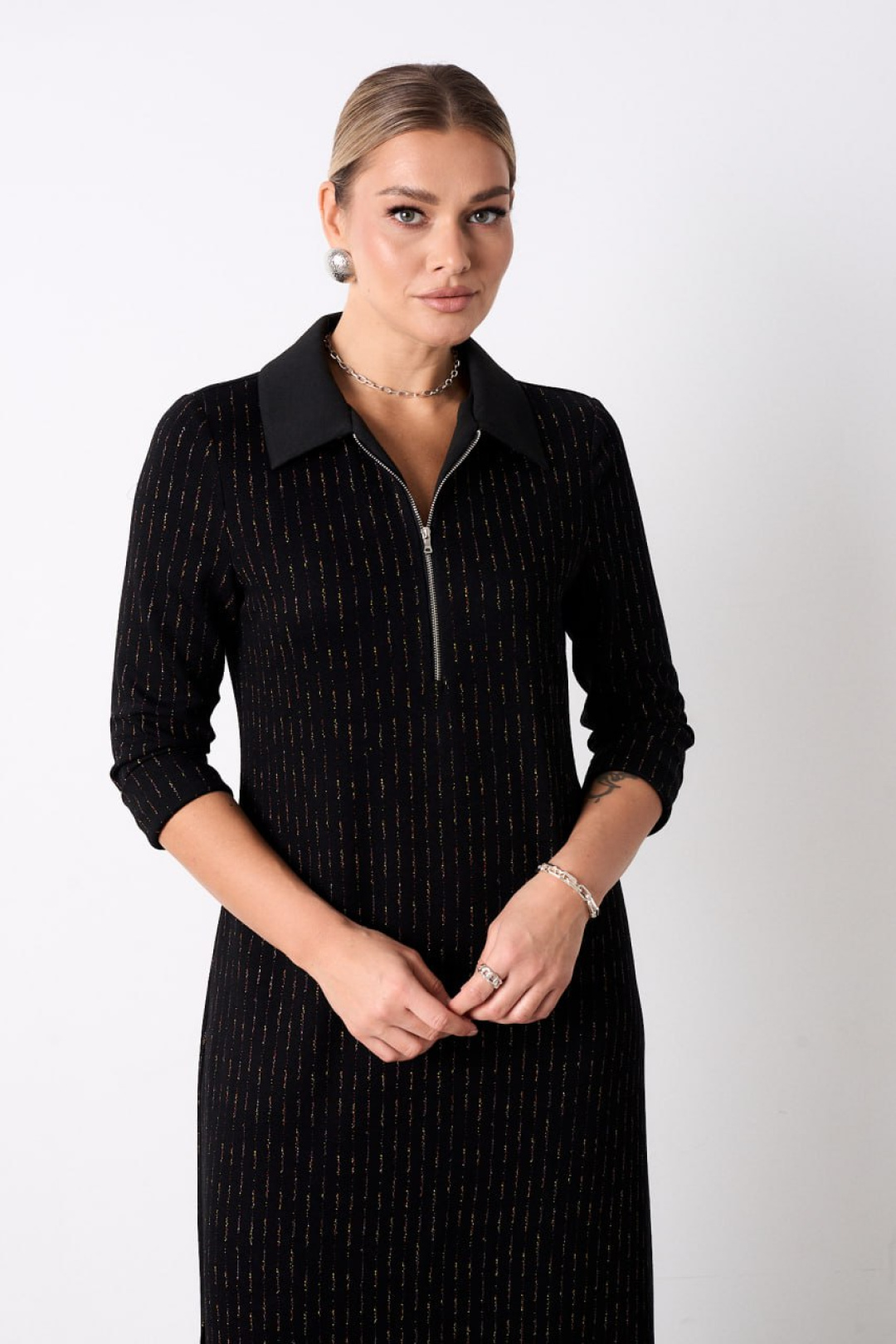 Платье женское полуприлегающего силуэта из мягкого трикотажа. Платье длиной миди, в боковых швах обработаны разрезы. Воротник рубашечный из отделочной однотонной ткани, по полочке вставлена тесьма-молния благодаря чему платье комфортно одевать. В боковых швах обработаны карманы. Рукав втачной длинной ¾, по низу обработана притачная манжета.