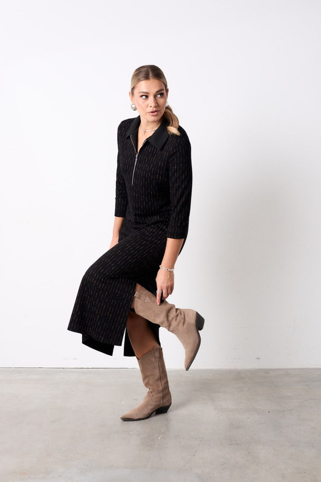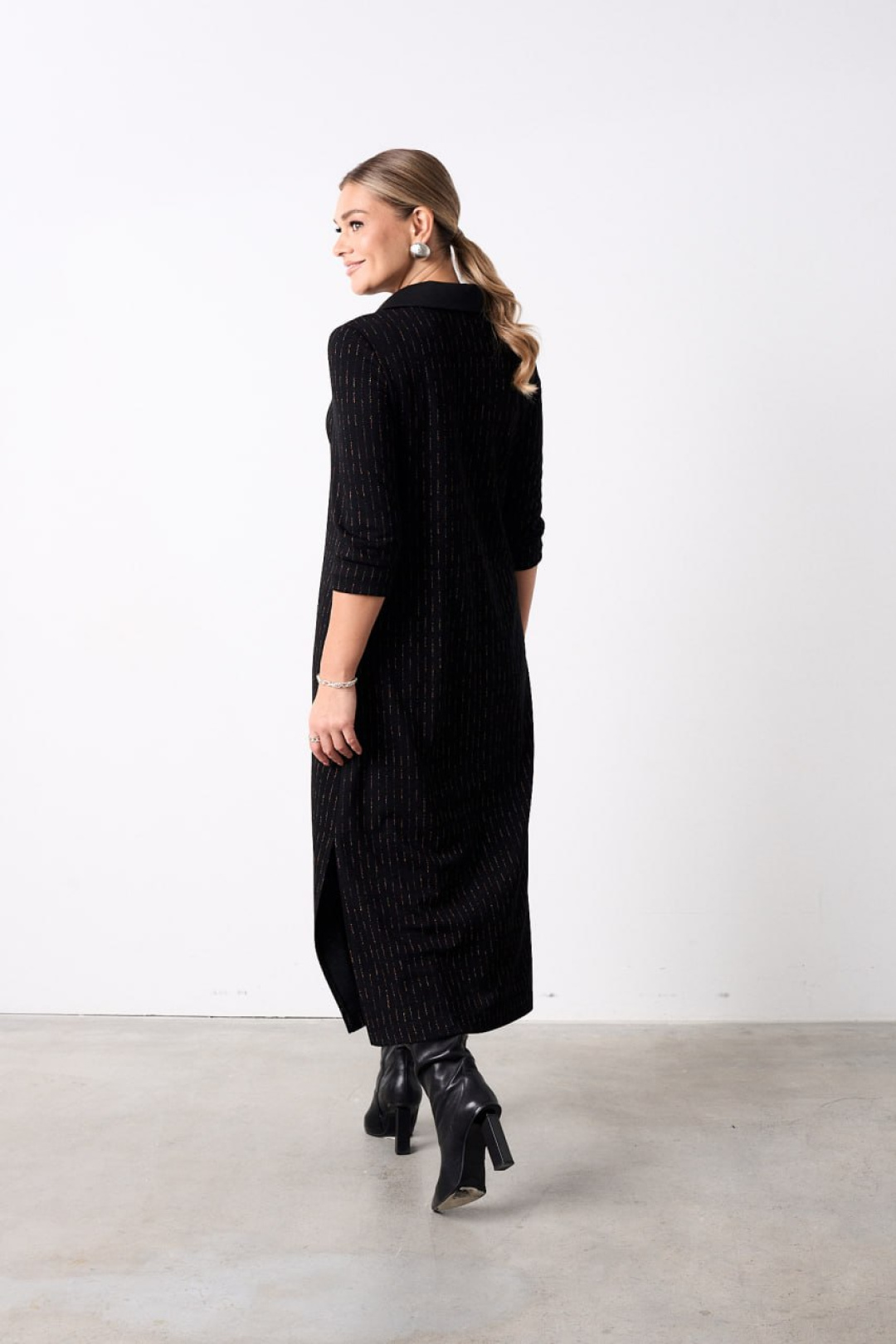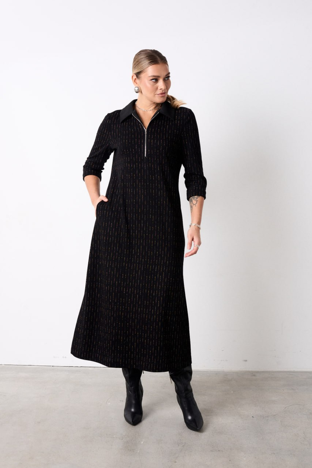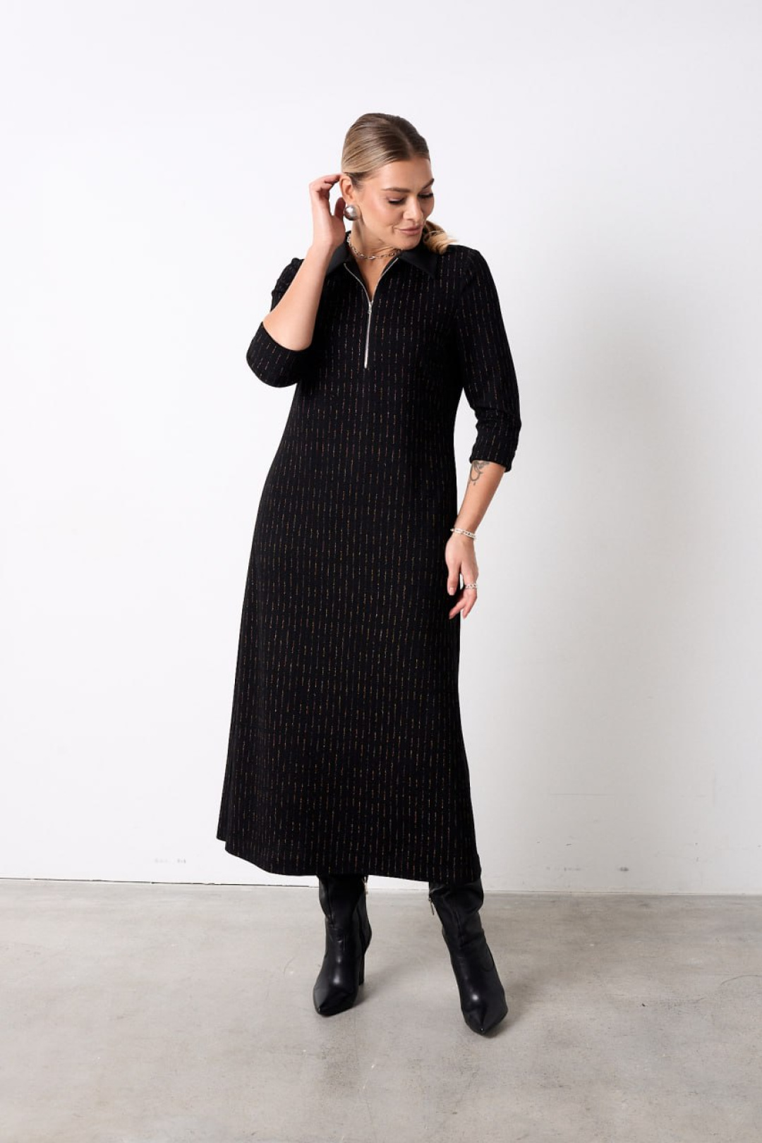 Платье женское полуприлегающего силуэта из мягкого трикотажа. Платье длиной миди, в боковых швах обработаны разрезы. Воротник рубашечный из отделочной однотонной ткани, по полочке вставлена тесьма-молния благодаря чему платье комфортно одевать. В боковых швах обработаны карманы. Рукав втачной длинной ¾, по низу обработана притачная манжета.