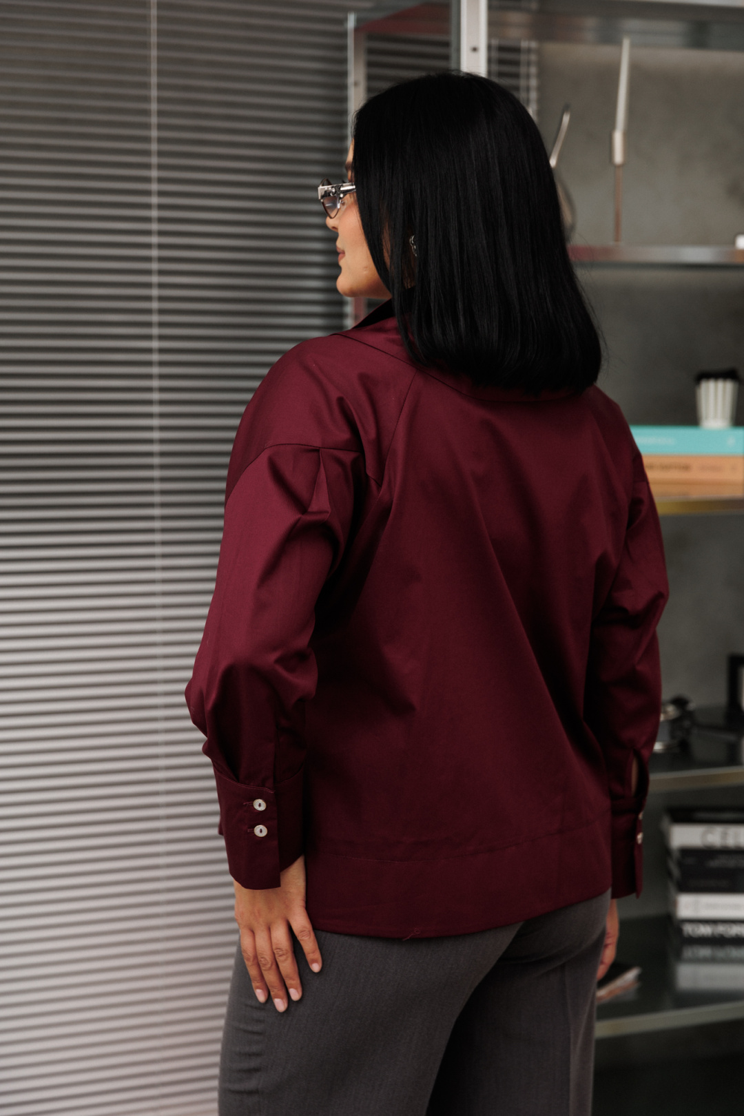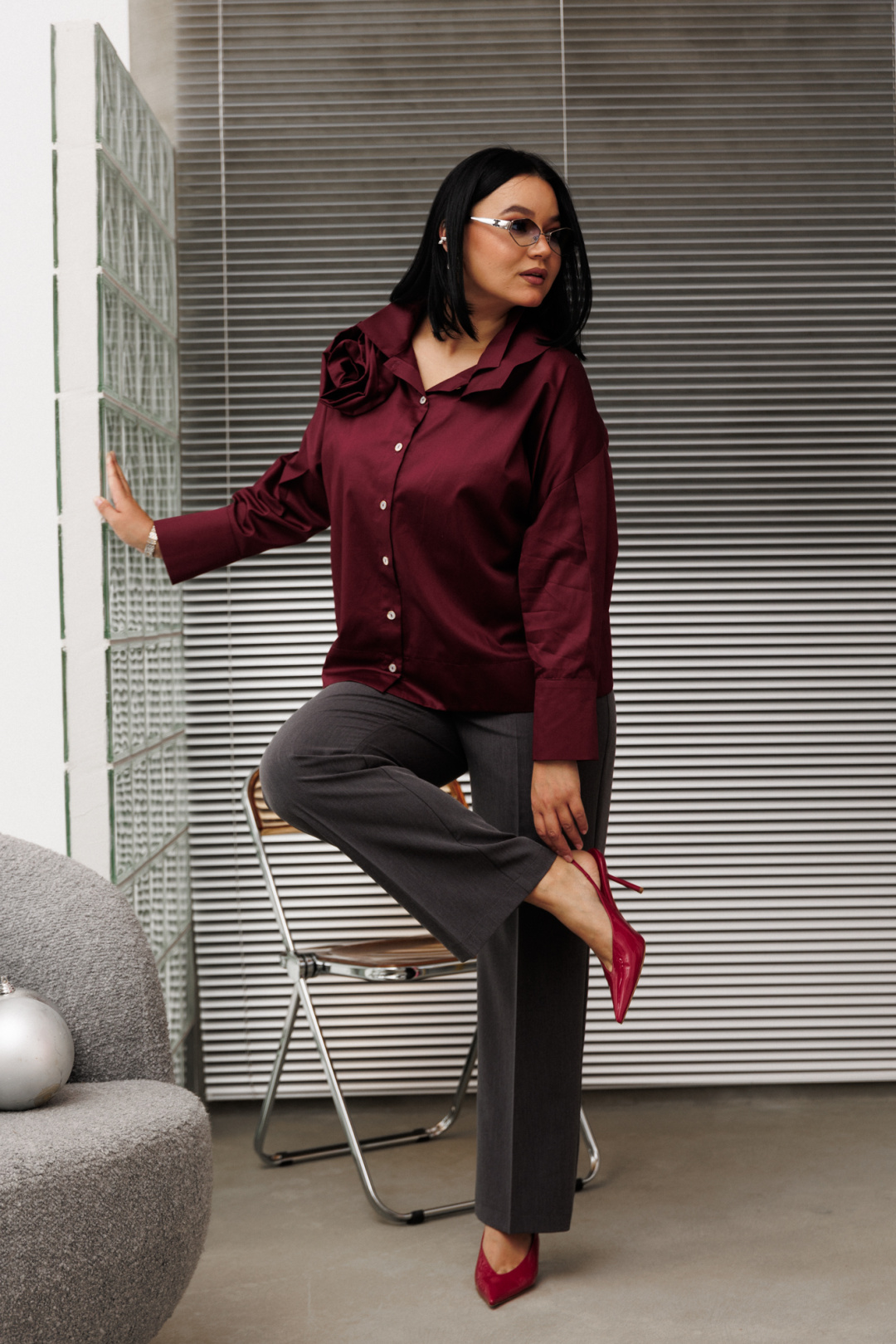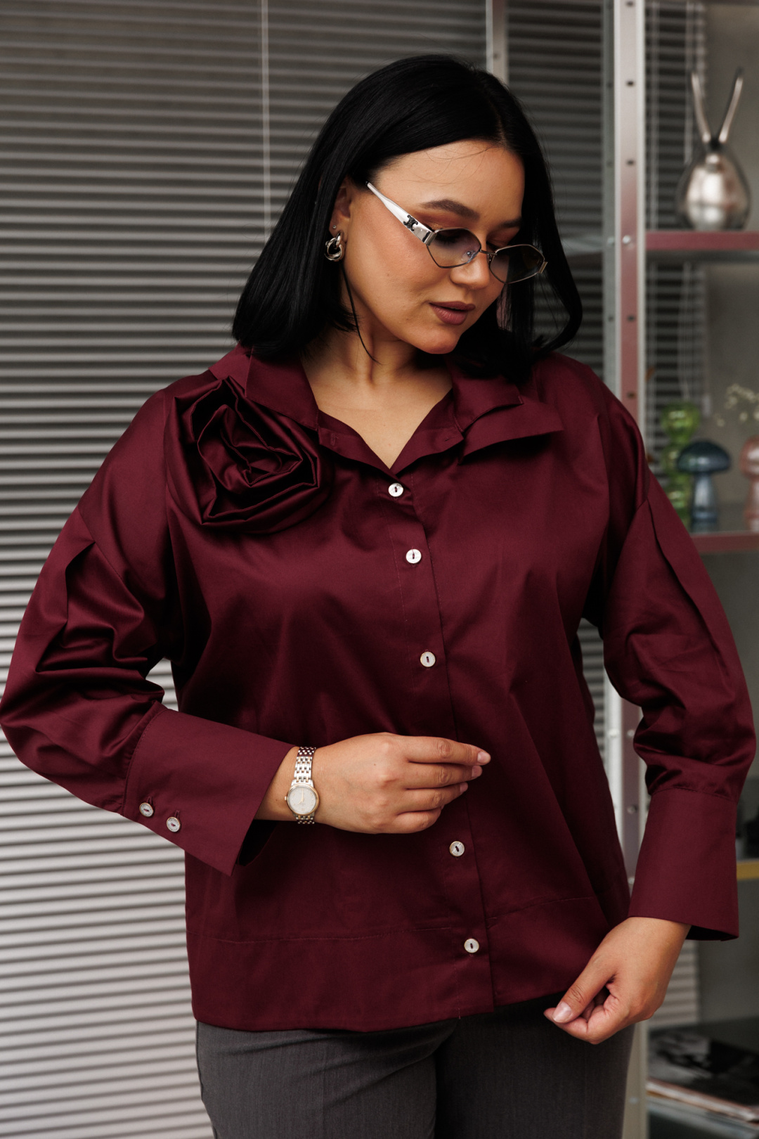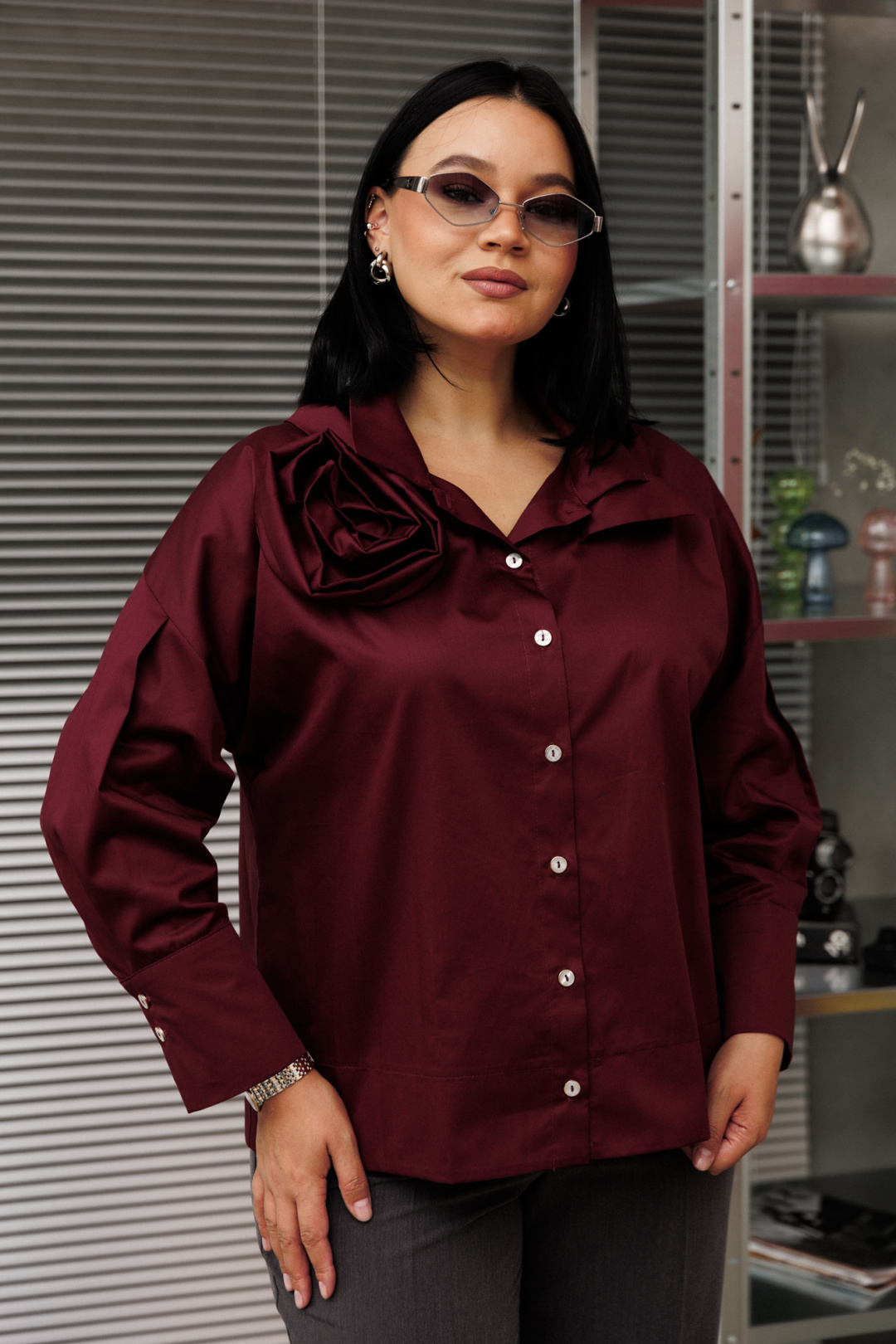 Блузка женская с акцентным декором полуприлегающего силуэта. Рукав "летучая мышь" с подрезом по линии проймы и односторонними складками и манжетой. Застежка- планка на петли и пуговицы. Воротник стояче-отложной. В качестве декора - дополнительный воротник, плавно переходящий в цветок. Благодаря своему крою станет базовой вещью в вашем гардеробе. Легко сочетается с любыми брюками, юбками, платьями и джинсами. Позволит создать большое количество образов для офиса, прогулок, праздничных мероприятий. Длина блузки (50-54)- 58см, (56-60)-61 см . Длина рукава от горловины с манжетой (50-54)-68см, (56-60)-70см.