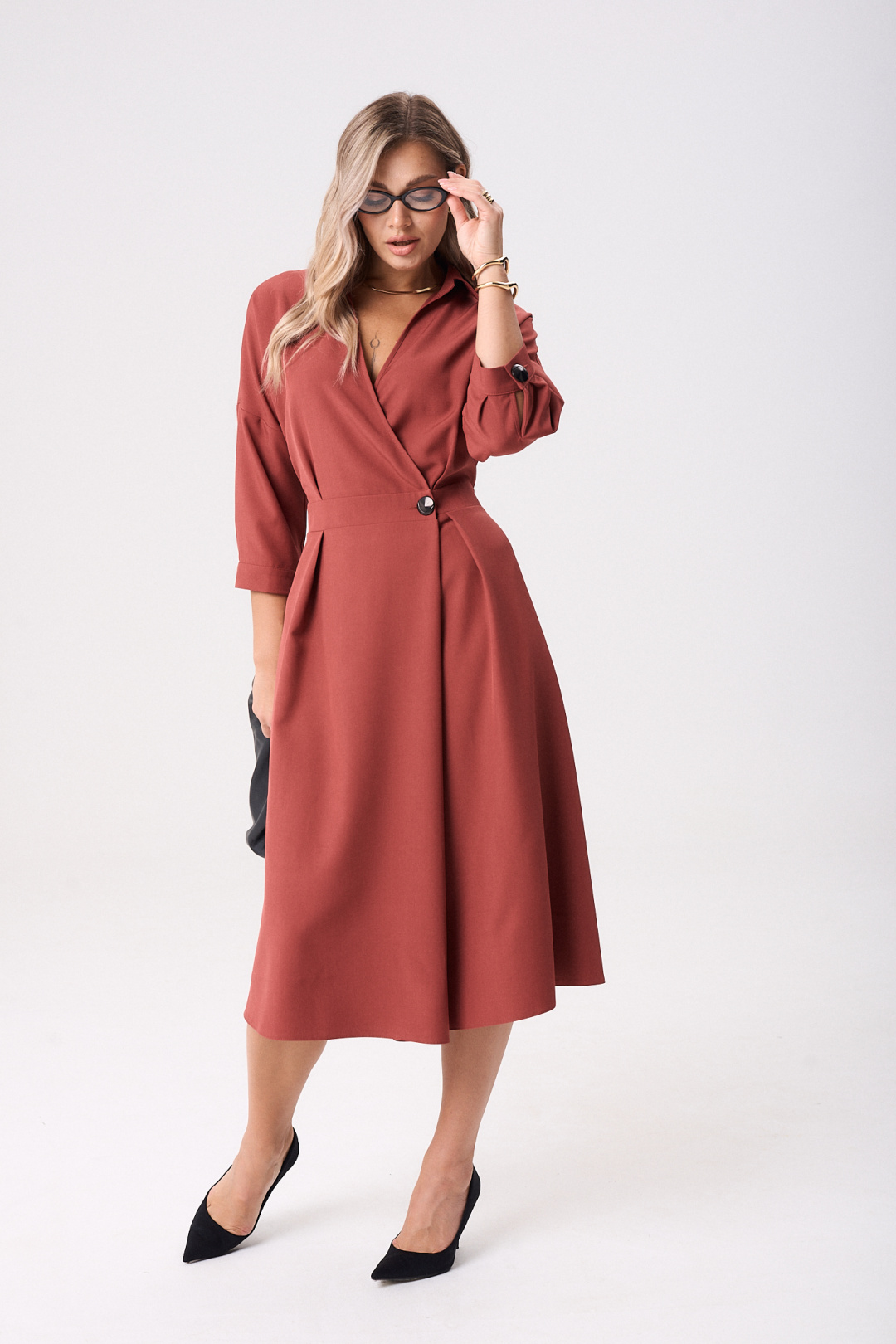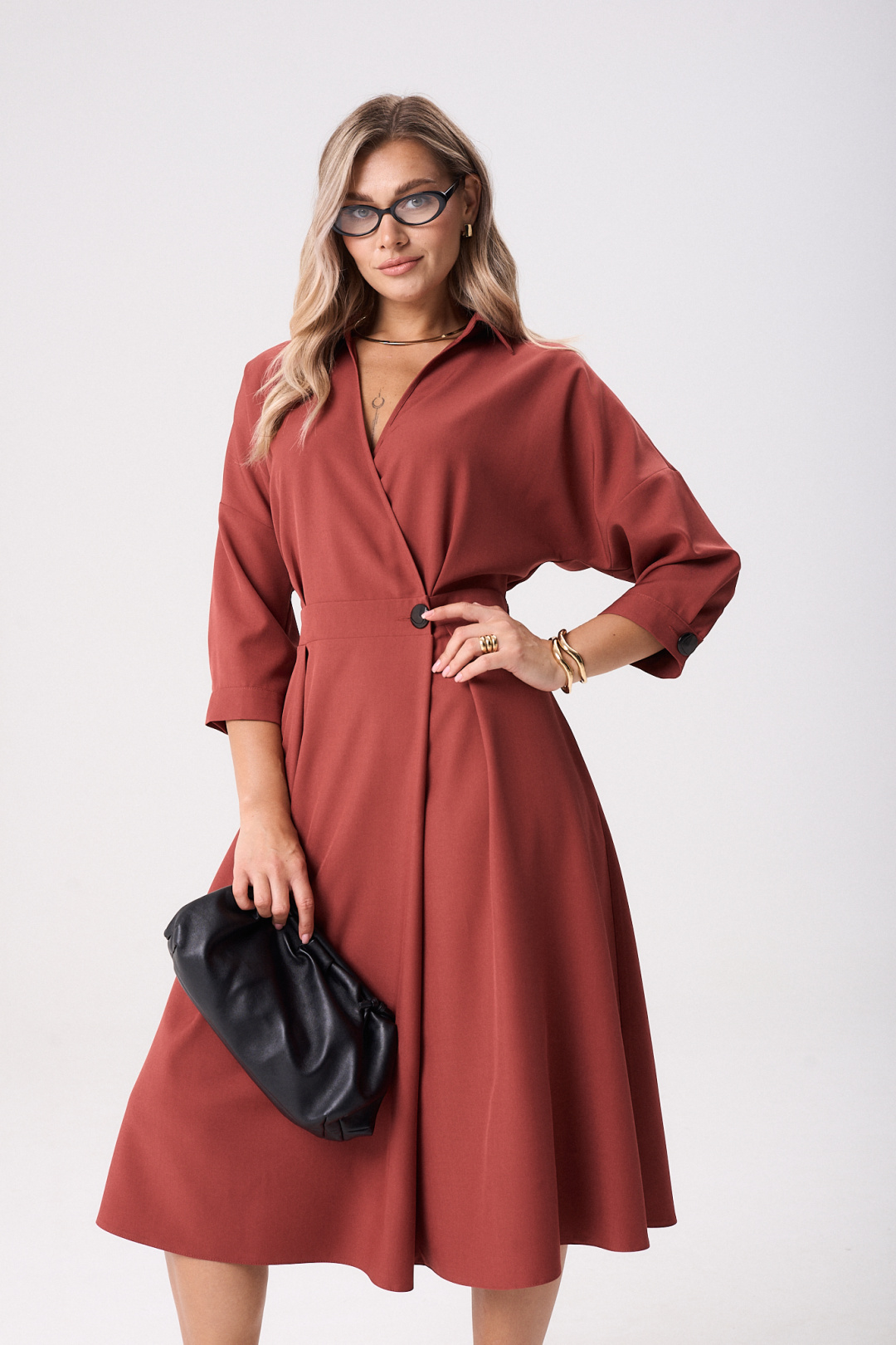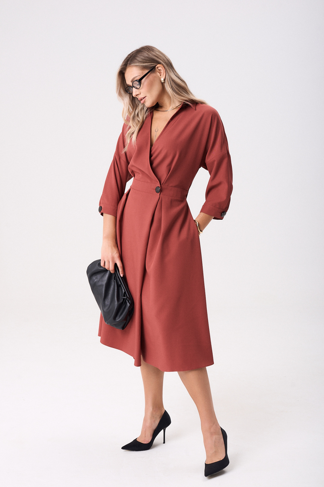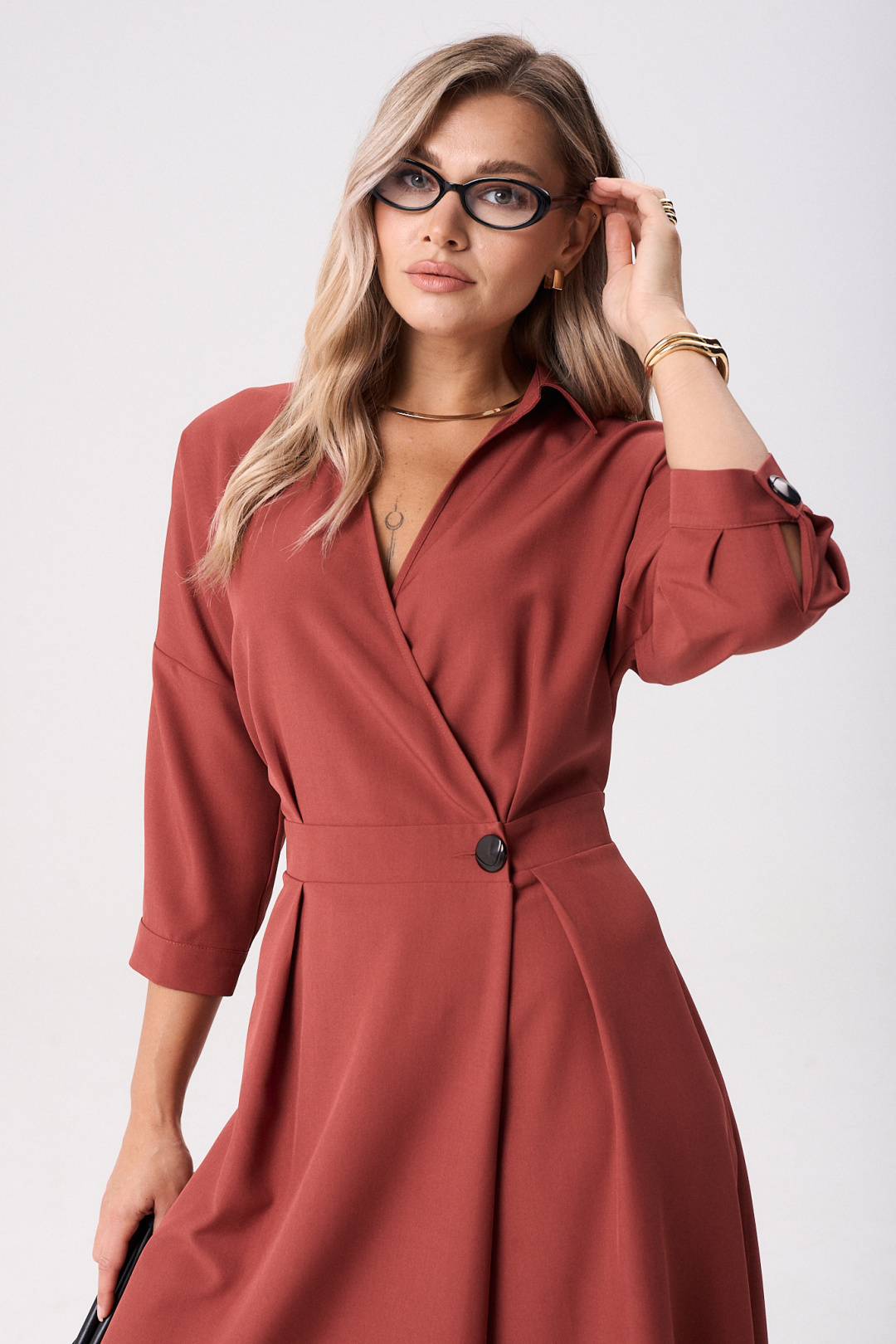 Элегантное женское платье из костюмной ткани необычного кроя станет изюминкой вашего гардероба. Платье полуприлегающего силуэта, отрезное по линии талии со спущенным плечом. Рукав 3/4 длиный на отрезной манжете. По полочке идут защипы-складки в верхней и нижней частях, запах - на петли и пуговицы по подрезу. По нижней части платья запах идет в виде складки. По спинке кокетка со складкой, по подрезу вставлена резинка. Юбка-полусолнце с односторонними складками по полочке, по бокам карманы. По горловине воротник на отрезной стойке. Платье будет идеально смотреться с туфлями, ботинкаи и сапогами. Длина по спинке: 117см. Длина рукава с манжето 29см.