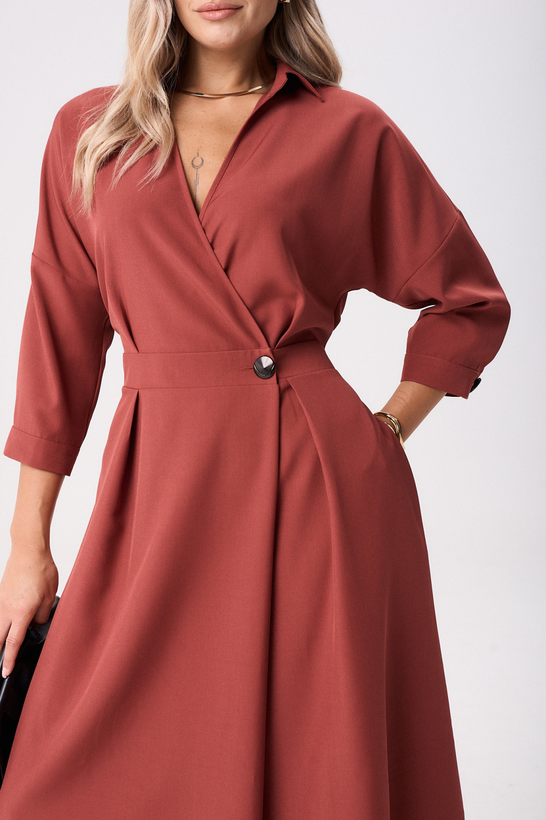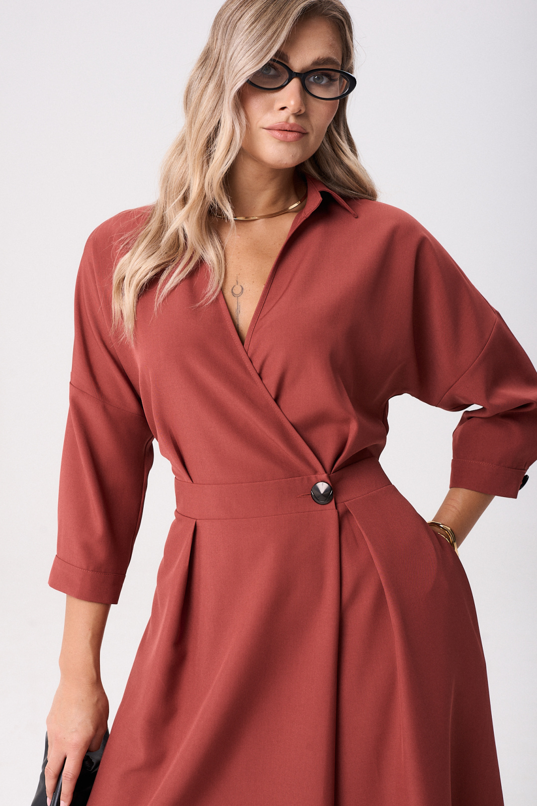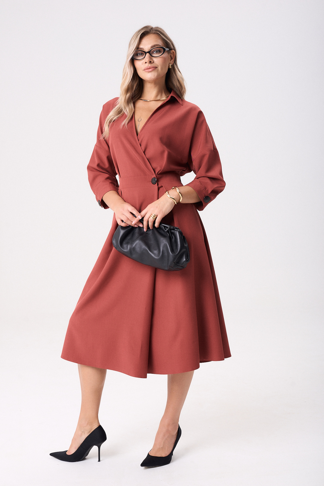 Элегантное женское платье из костюмной ткани необычного кроя станет изюминкой вашего гардероба. Платье полуприлегающего силуэта, отрезное по линии талии со спущенным плечом. Рукав 3/4 длиный на отрезной манжете. По полочке идут защипы-складки в верхней и нижней частях, запах - на петли и пуговицы по подрезу. По нижней части платья запах идет в виде складки. По спинке кокетка со складкой, по подрезу вставлена резинка. Юбка-полусолнце с односторонними складками по полочке, по бокам карманы. По горловине воротник на отрезной стойке. Платье будет идеально смотреться с туфлями, ботинкаи и сапогами. Длина по спинке: 117см. Длина рукава с манжето 29см.