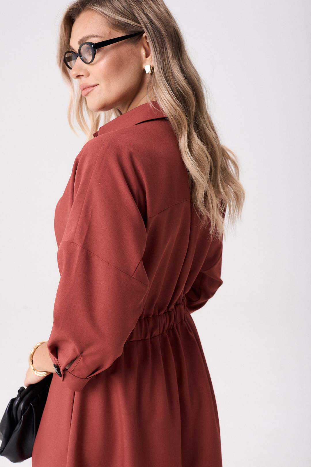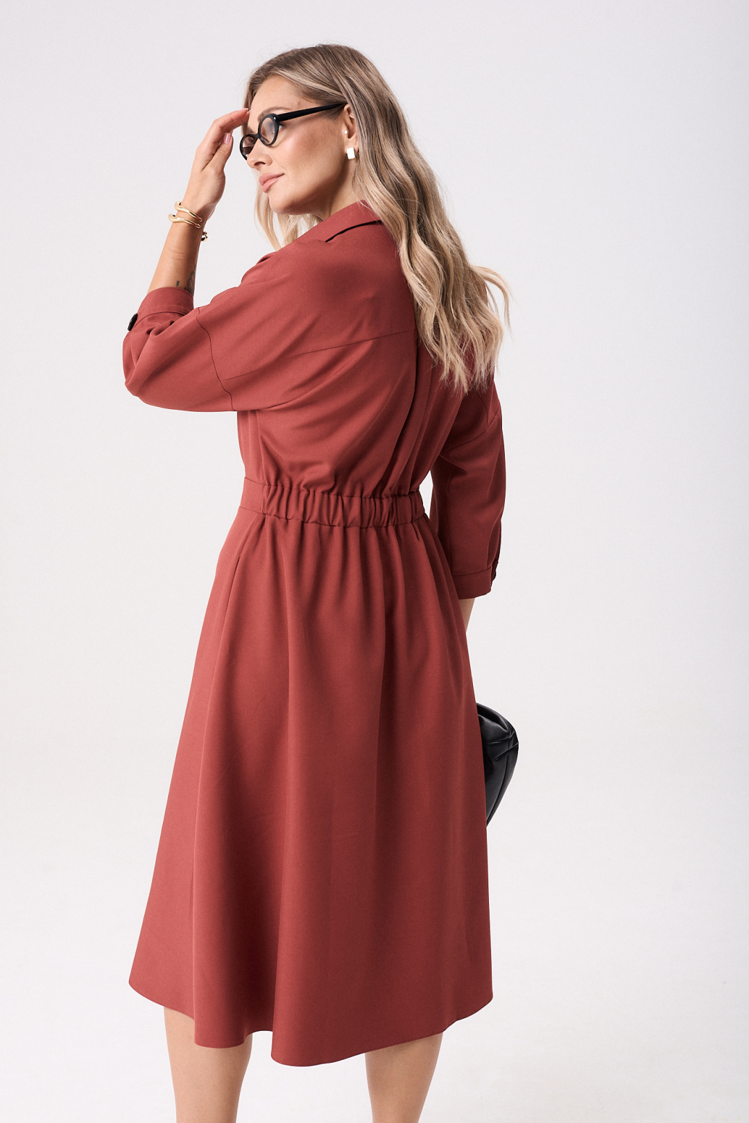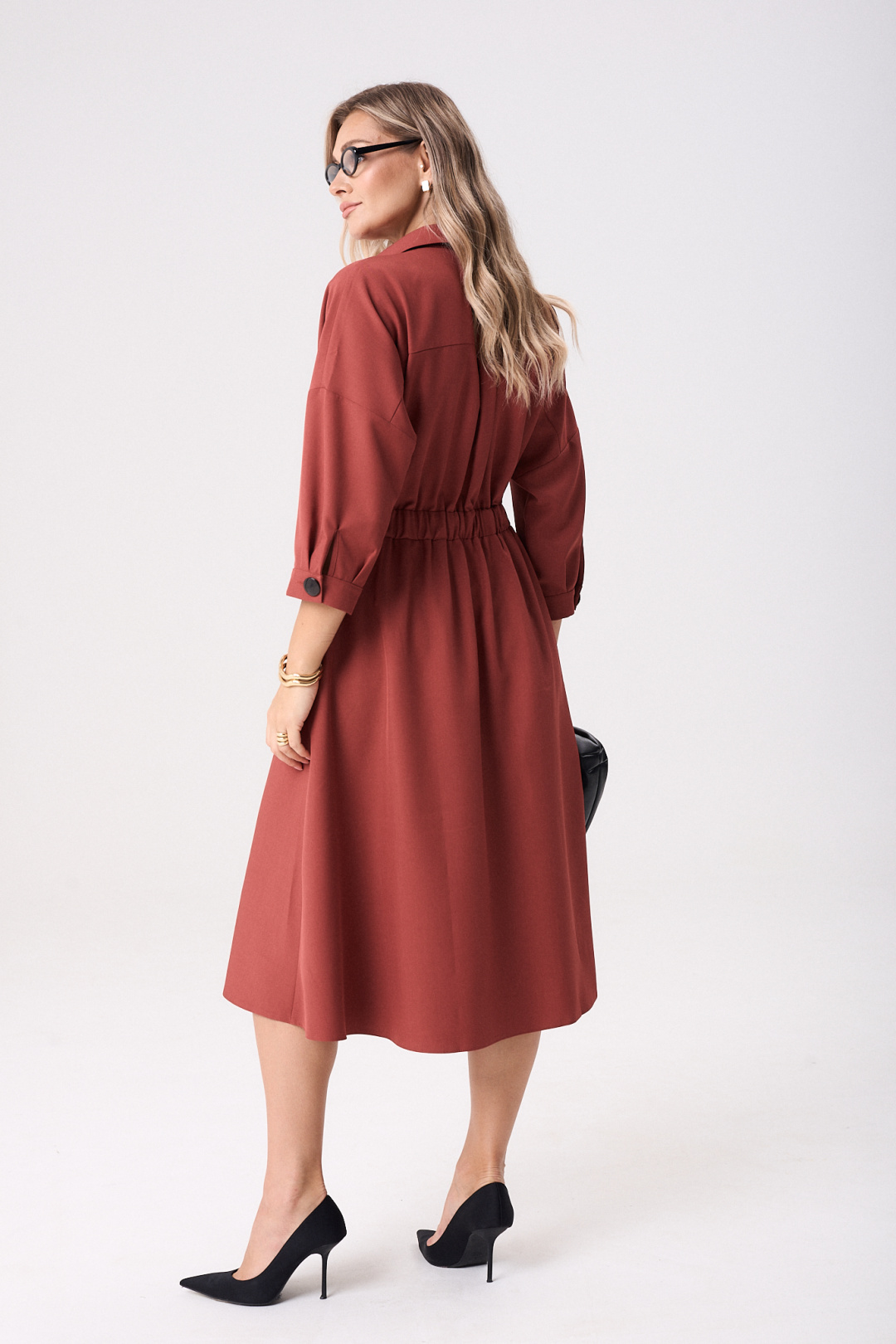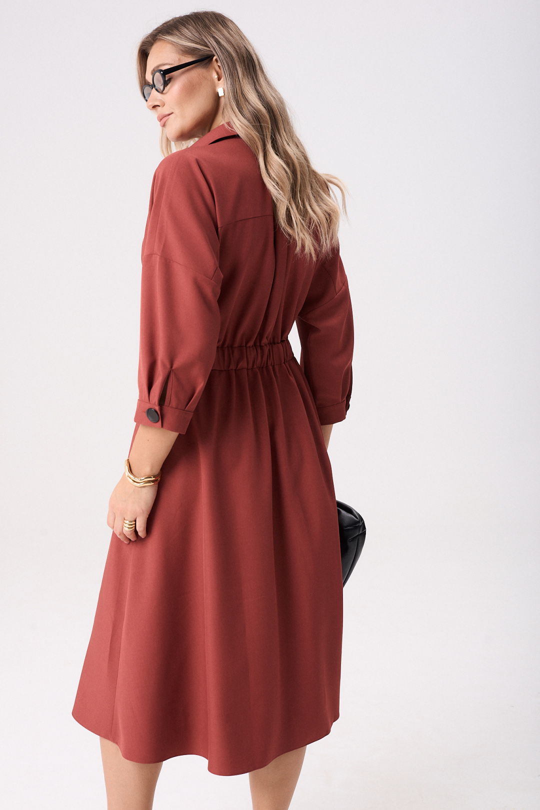 Элегантное женское платье из костюмной ткани необычного кроя станет изюминкой вашего гардероба. Платье полуприлегающего силуэта, отрезное по линии талии со спущенным плечом. Рукав 3/4 длиный на отрезной манжете. По полочке идут защипы-складки в верхней и нижней частях, запах - на петли и пуговицы по подрезу. По нижней части платья запах идет в виде складки. По спинке кокетка со складкой, по подрезу вставлена резинка. Юбка-полусолнце с односторонними складками по полочке, по бокам карманы. По горловине воротник на отрезной стойке. Платье будет идеально смотреться с туфлями, ботинкаи и сапогами. Длина по спинке: 117см. Длина рукава с манжето 29см.