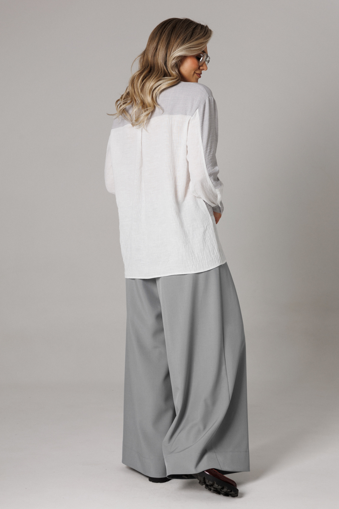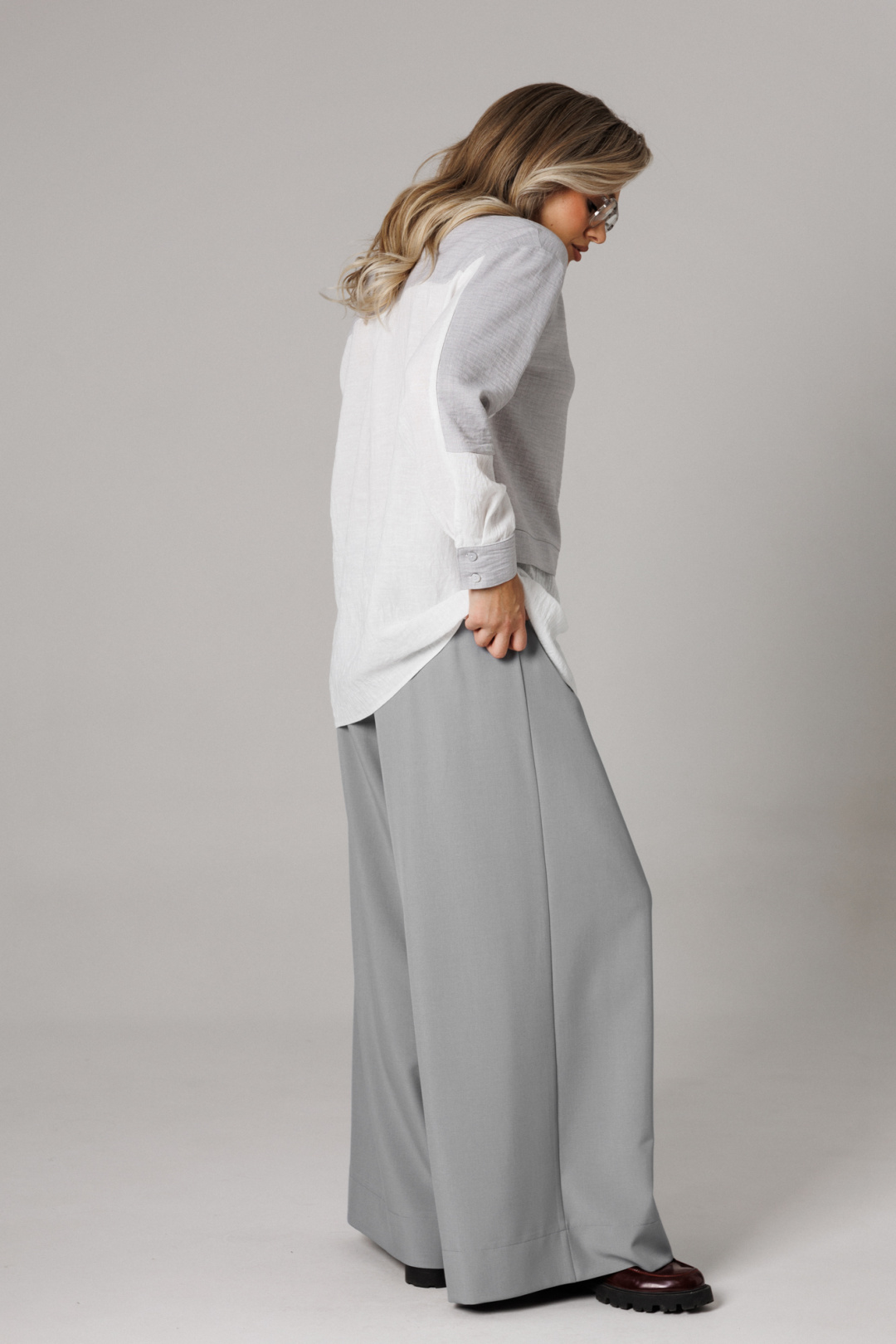 Комплект из костюмной ткани создан для тех, кто ценит комфорт и элегантность в каждой детали. В комплект входит блузка и штаны палаццо. Оверсайз крой придаёт костюму особый шарм и дает свободу движений. Высокая посадка и резинка по поясу подчёркивает талию и делает силуэт более изящным. Благодаря свободному крою костюм подойдёт для разных типов фигуры. Он подчеркнёт вашу индивидупльность. Блузка прямого силуэта, застежка на планку и пуговицы. Воротник на отрезной стойке. По полочке идет ассиметричный подрез со вставками из 2-х видов однотона и разрезом. Плечо спущенное, рукав длинный со вставками, на манжете. По спинке идет кокетка и встречная складка. Брюки полаццо , прямые с односторонней складкой и запахом по центру. По низу брюк широкая подгибка. Пояс на резинке . В качестве декора- брендированная металлическая нашивка по подрезу полочки. Длина по спинке (50-54) - 74 см, (56-60) - 76 см. Длина рукава (с манжетой): (50-54) - 57 см, (56-60)-59см. Длина брюк: (50-54) - 97 см, (56-60) - 98см