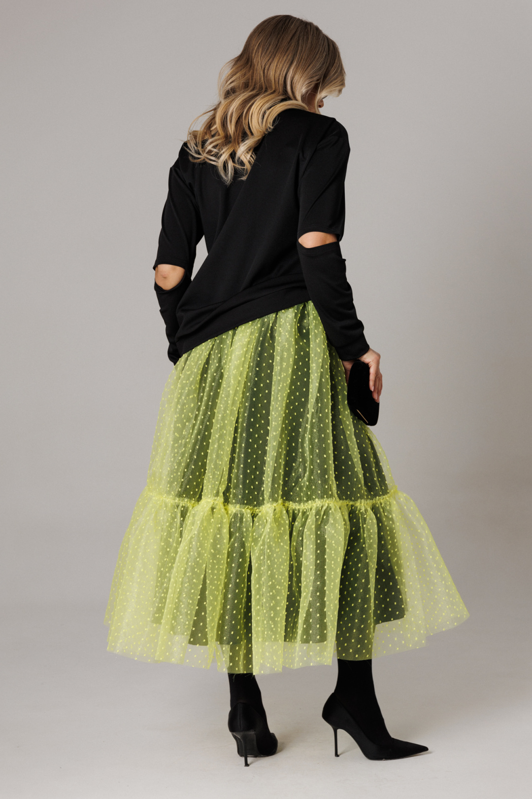 Оригинальный женский комплект от бренда Anastasia, идеальный для любого случая. Этот костюм сочетает в себе элегантность и комфорт, что делает его подходящим как для повседневной носки, так и для праздничных мероприятий. Джемпер оверсайз из трикотажного полотна. Прямого силуэта со спущенным плечом. Воротник-стойка. По рукаву идет подрез с разрезом. Низ рукава и низ джемпера - на манжете. Джемпер лекго сочетается с любыми низами: брюки, джинсы, юбка. Юбка макси из 2-х видов ткани: верх с отрезным валаном из органзы, подкладка юбка солце из шифона. Пояс на декоративной резинке. Фасон универсален, а использование резинки на поясе повышает комфортность носки, позволяя юбке адаптироваться под индивидуальные особенности фигуры. Юбку легко сочетать с различными верхами: топ, блузка, футболка, кружевной жакет, свитер или жакет из тексиля - все это позволит создавать различные образы на разные случаи. Длина по спинке 68см. Длина рукава (с манжетой): 60см. Длина юбки: 90 см
