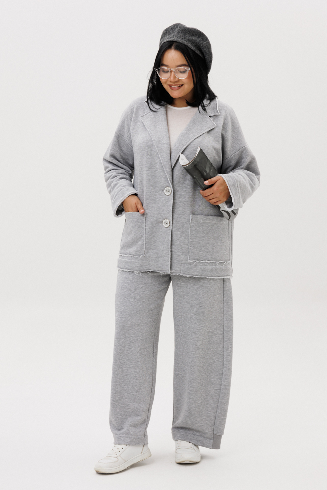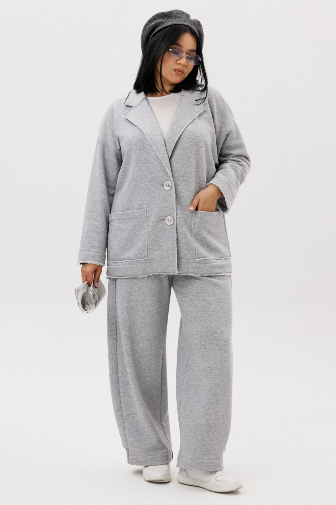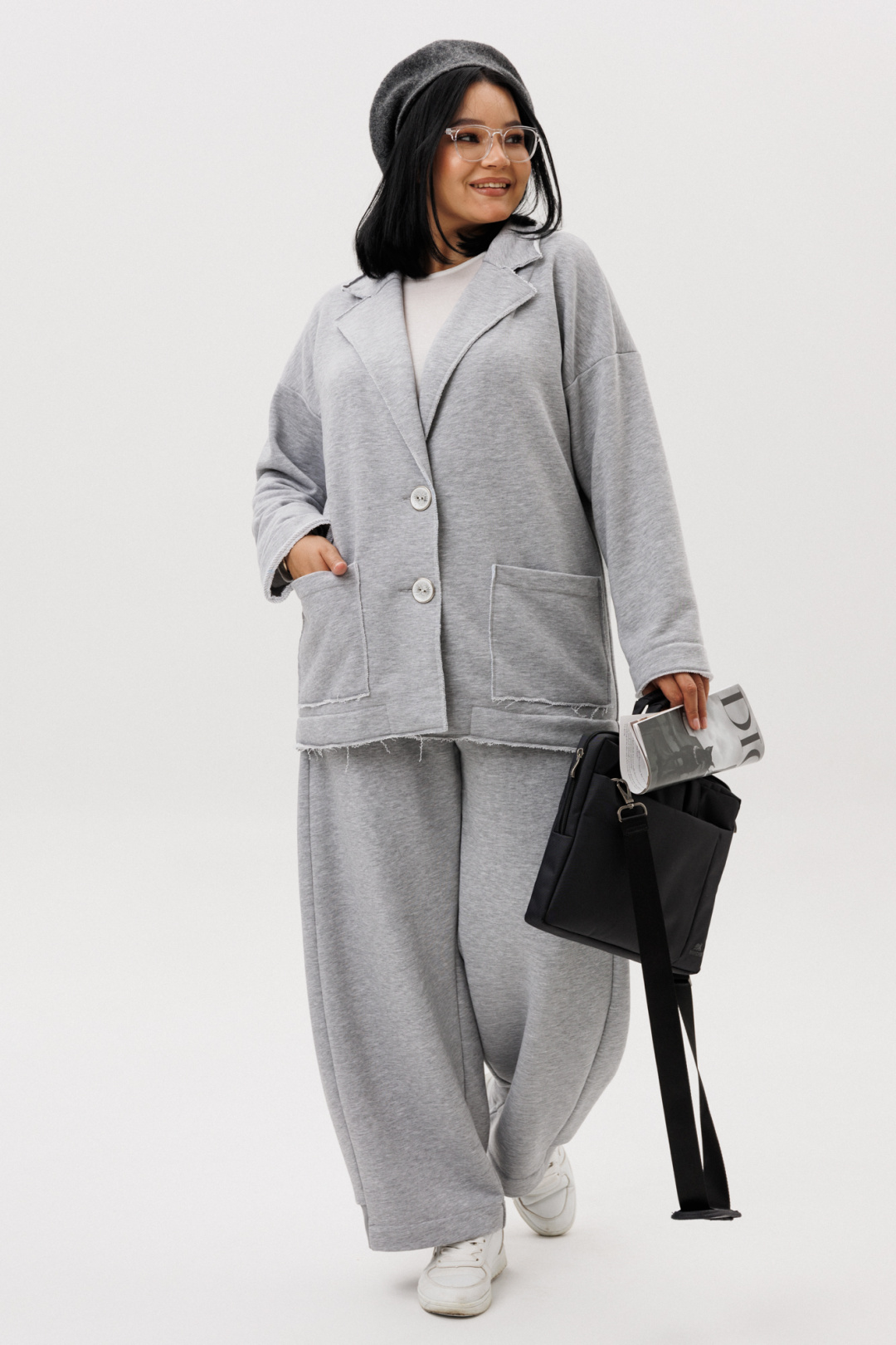Костюм женский кэжуал (casual) из трикотажного материала трехнитка свободного кроя, который создает расслабленный силуэт -это отличный выбор для активных и стильных деушек и женщин, которые ценят моду и комфорт! Жакет со спущенным плечом. Воротник пиджачного типа, по полочке идут накладные карманы. Жакет без подкладки, мягкий и легкий. Края борта воротника, низов и карманов не обработаны. Застежка на петли и пуговицы. Выполнен в крое Oversize свободной формы и посадкой по фигуре. Если хотите силуэтную посадку, выбирайте на размер меньше. Если хотите посадку свободнее - заказывайте свой размер.