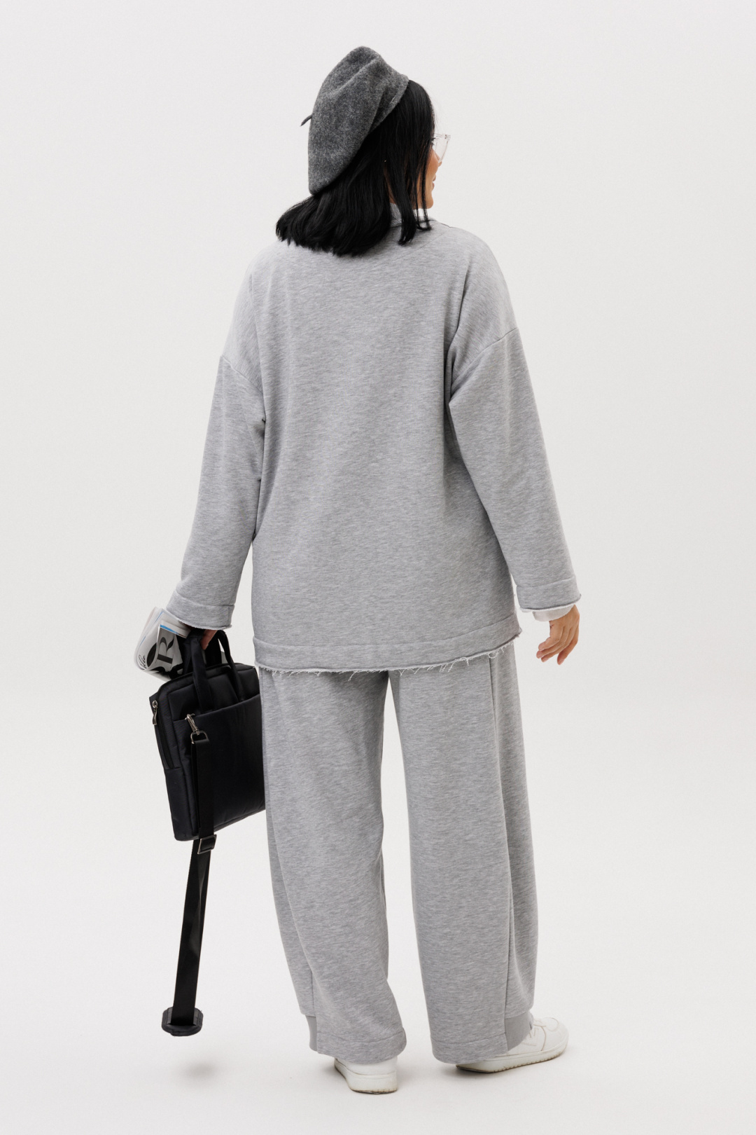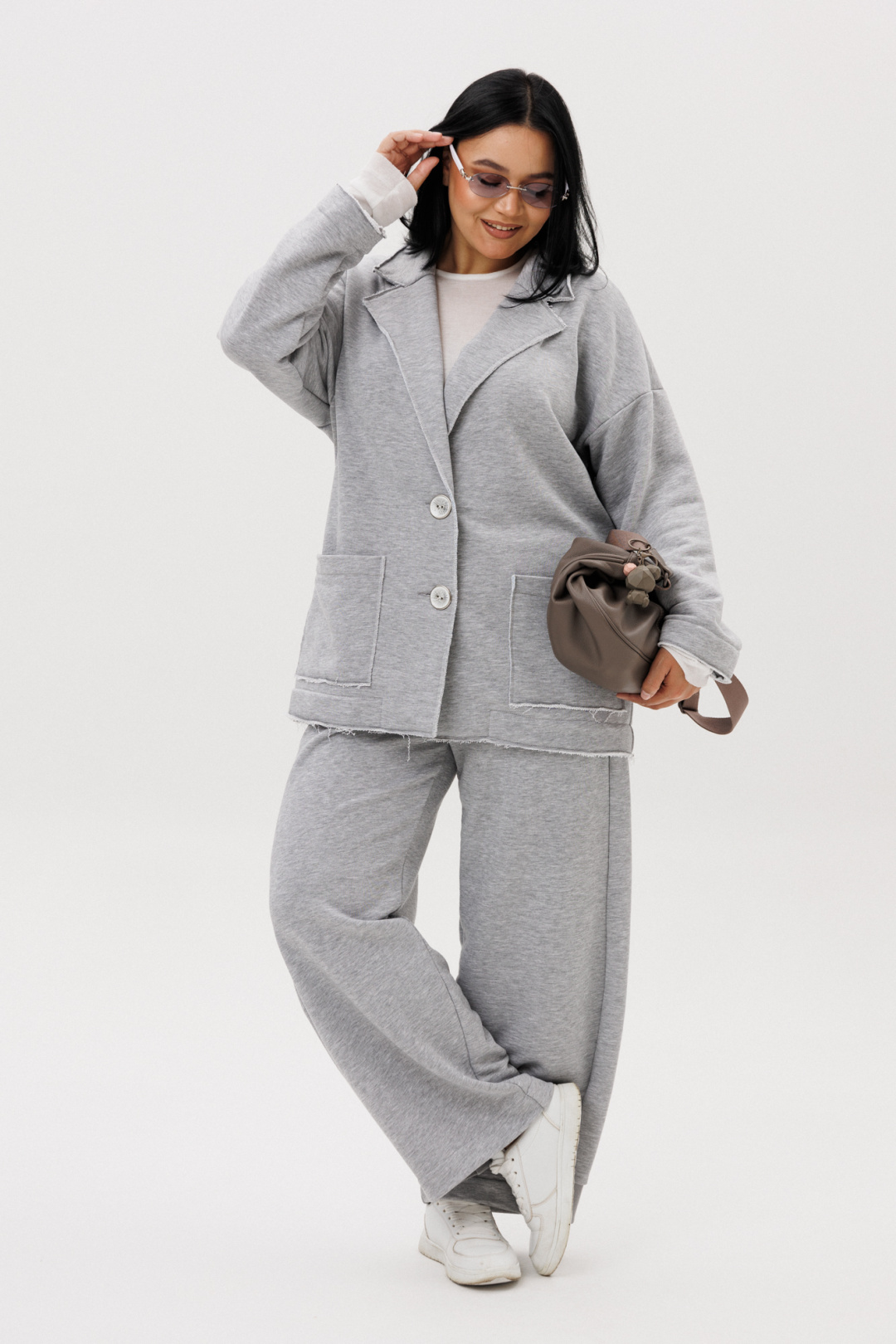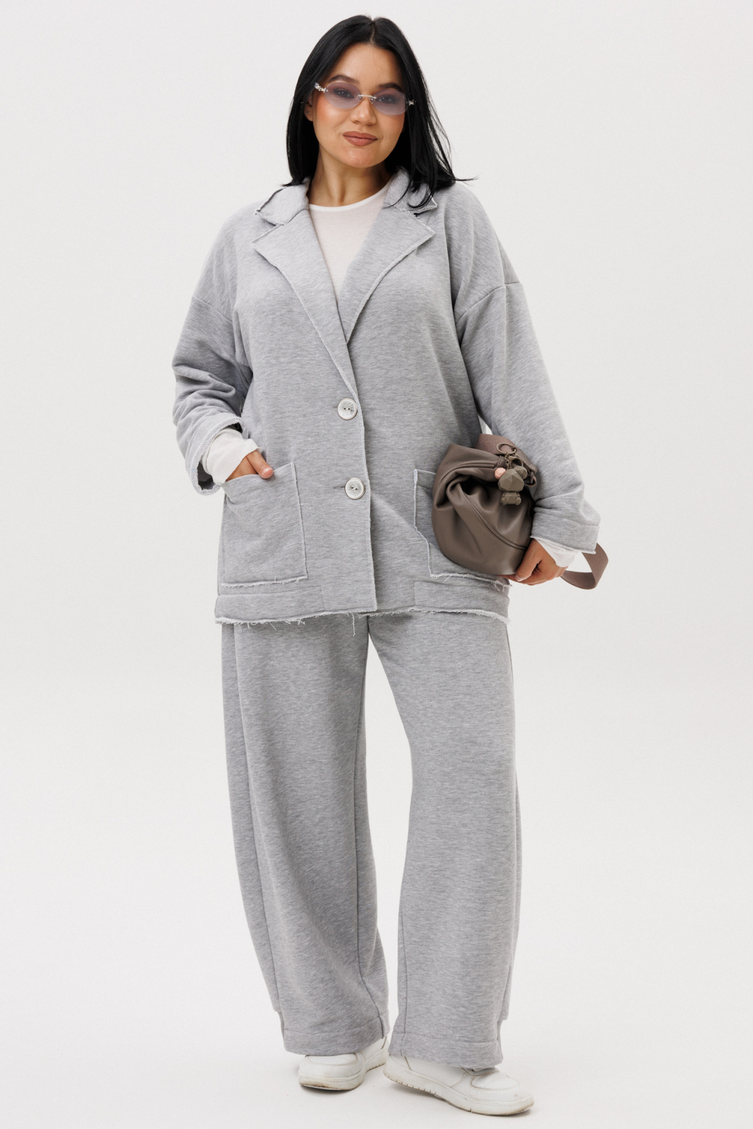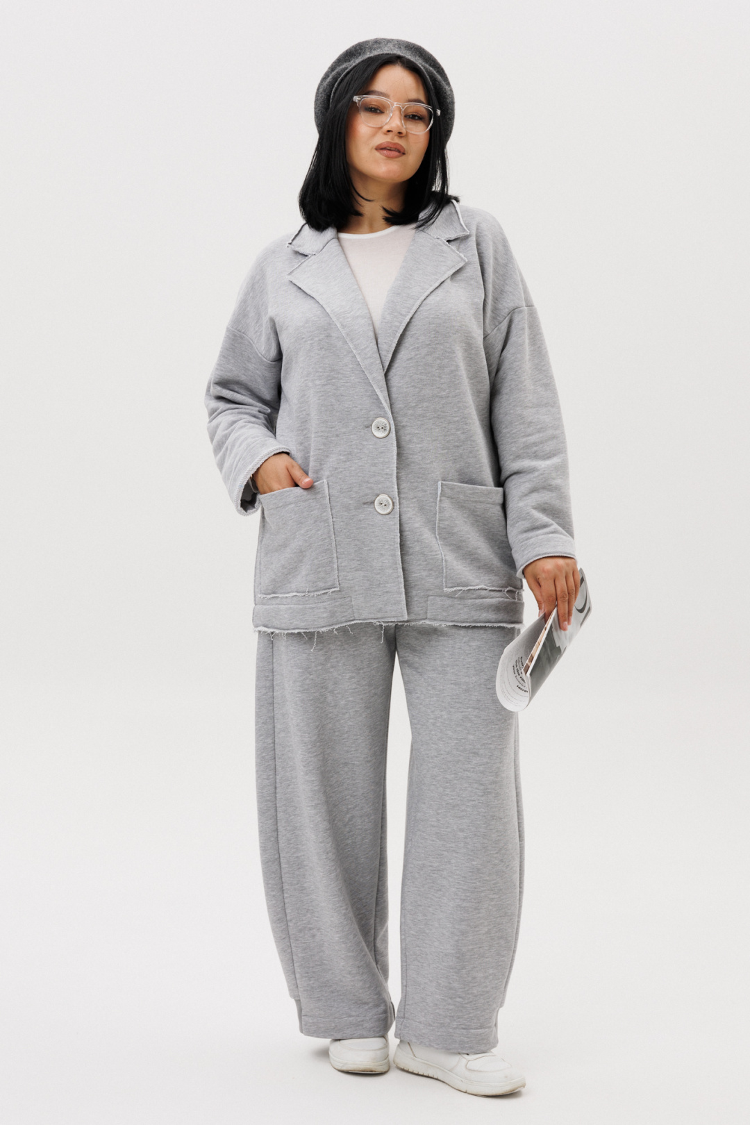 Костюм женский кэжуал (casual) из трикотажного материала трехнитка свободного кроя, который создает расслабленный силуэт -это отличный выбор для активных и стильных деушек и женщин, которые ценят моду и комфорт! Жакет со спущенным плечом. Воротник пиджачного типа, по полочке идут накладные карманы. Жакет без подкладки, мягкий и легкий. Края борта воротника, низов и карманов не обработаны. Застежка на петли и пуговицы. Выполнен в крое Oversize свободной формы и посадкой по фигуре. Если хотите силуэтную посадку, выбирайте на размер меньше. Если хотите посадку свободнее - заказывайте свой размер.