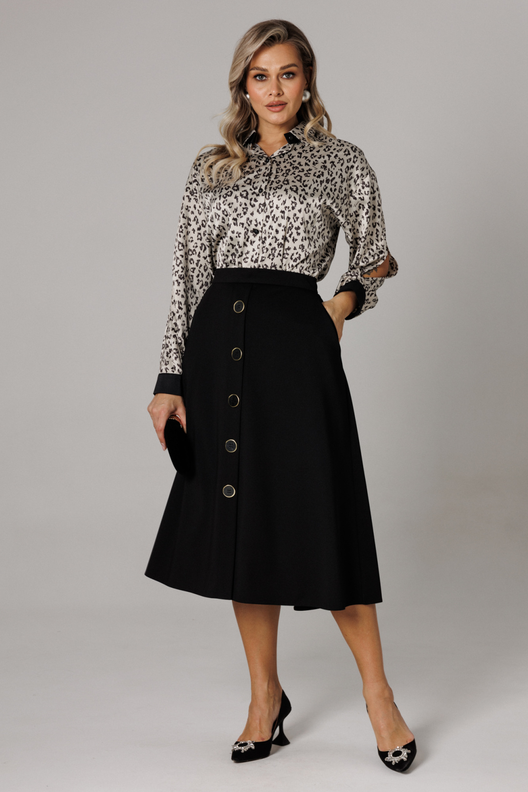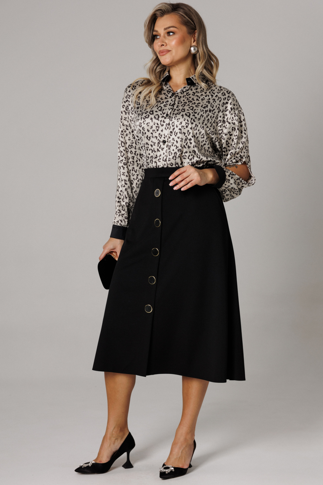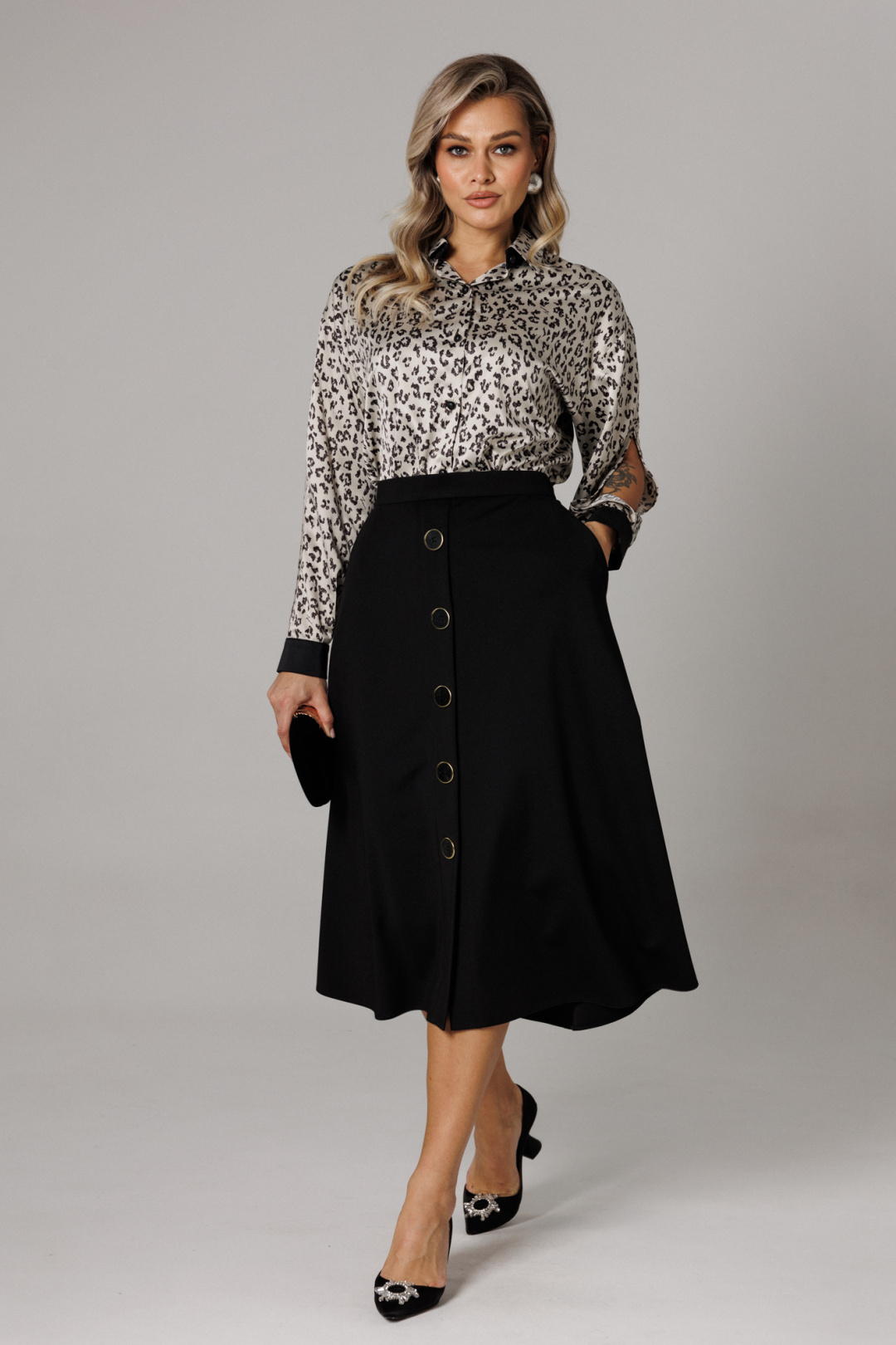 Оригинальный комплект женский 2-х пердментый (блузка, юбка) от бренда Anastasia, идеальный для любого случая. Этот комплект сочетает в себе элегантность и комфорт, что делает его подходящим как для повседновной носки, так и для праздничных мероприятий. Блузка из атласной ткани прямого силуэта со спущенным плечом. По бокам закругленные разрезы. Рукав с запахом и разрезом, на манжете. Застежка – планка на петли и пуговицы. Воротник на отрезной стойке. Стойка и манжета из отделочной ткани. По спинке идет отрезная кокетка. Такой женский офисный стиль можно носить, сочетая с другими вещами гардероба, создавая новые образы. Ткань атласная качественная и очень комфортная. Юбка А-силуэта, длинна миди. По передней части идет застежка-обманка с пуговицами. По бокам карманы. По спинке средний шов, переходящий в застежку молнию. Пояс отрезной . Длина по спинке: (48-52)-70 см, (54-58)-72 см. Длина рукава с манжетой: (48-52)-55 см, (54-58)-57 см. Длина юбки: (48-58)-80 см