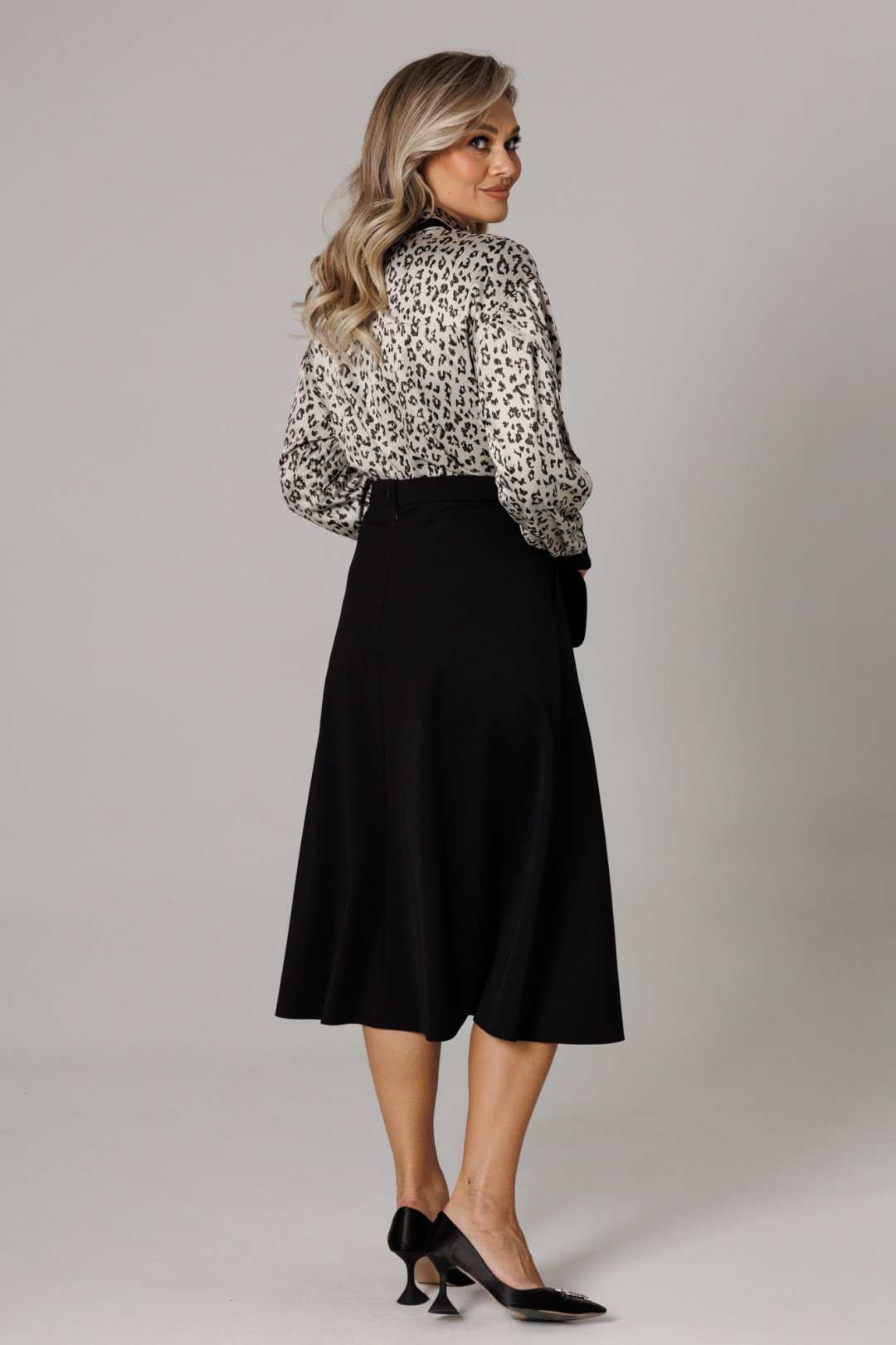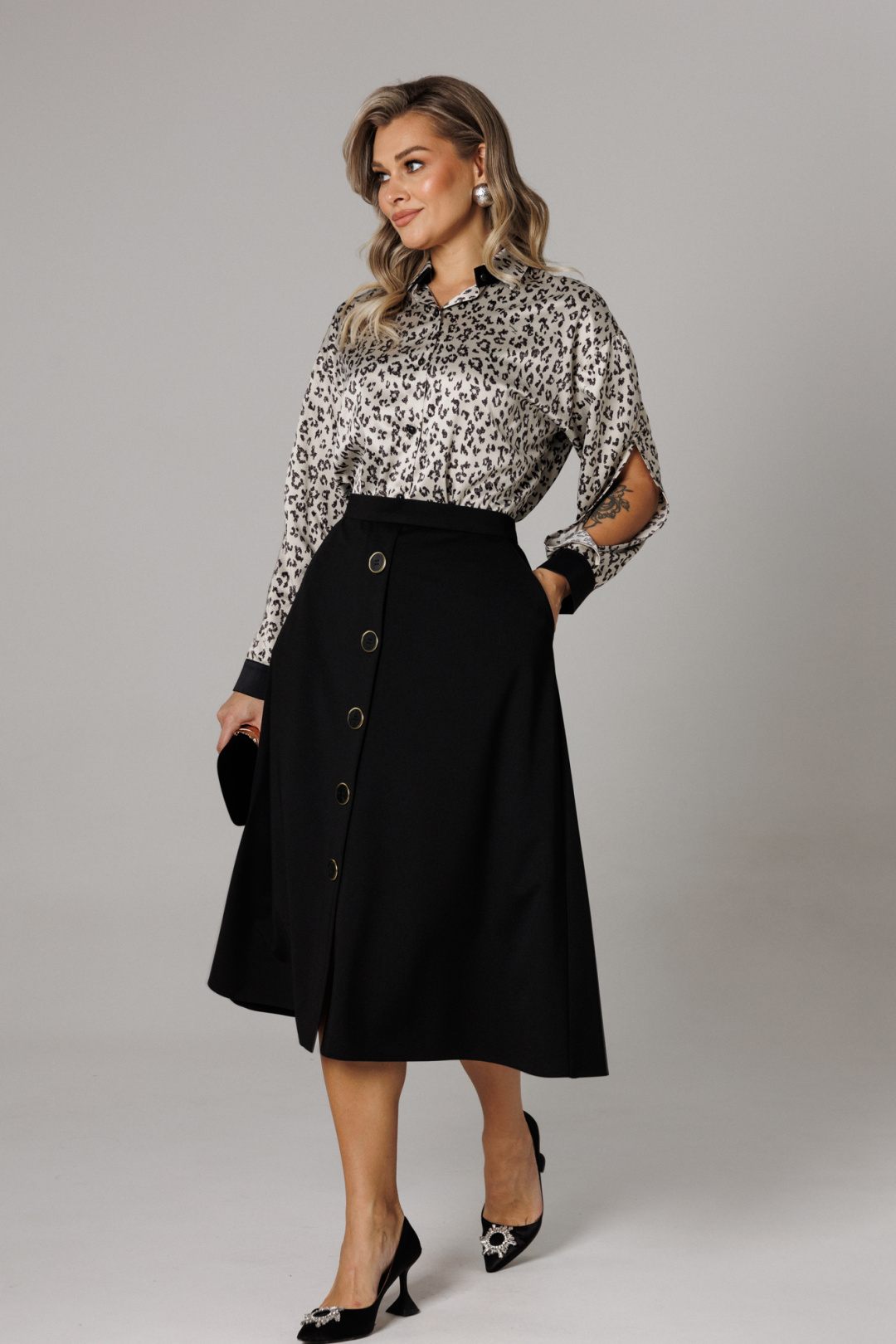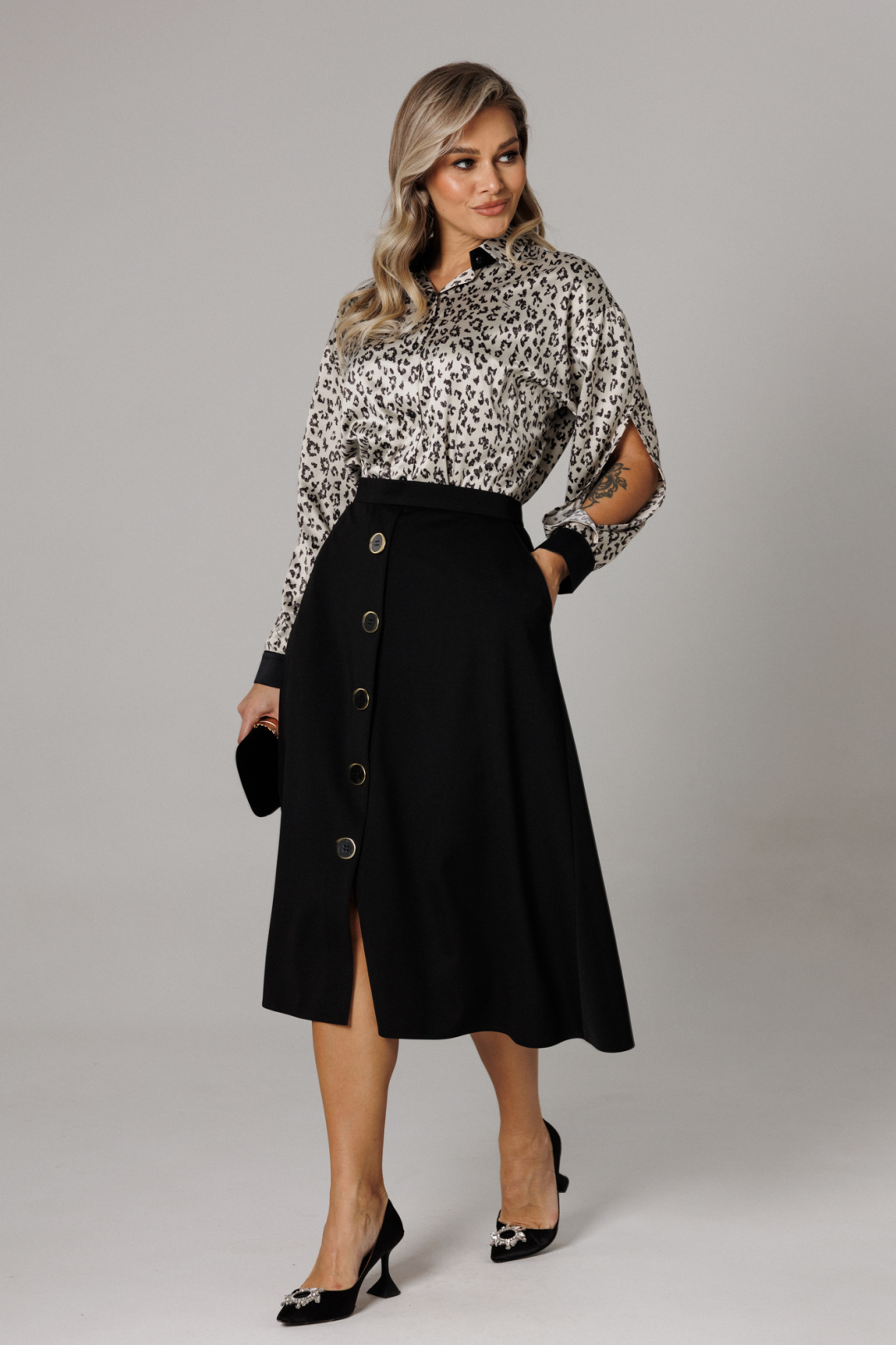 Оригинальный комплект женский 2-х пердментый (блузка, юбка) от бренда Anastasia, идеальный для любого случая. Этот комплект сочетает в себе элегантность и комфорт, что делает его подходящим как для повседновной носки, так и для праздничных мероприятий. Блузка из атласной ткани прямого силуэта со спущенным плечом. По бокам закругленные разрезы. Рукав с запахом и разрезом, на манжете. Застежка – планка на петли и пуговицы. Воротник на отрезной стойке. Стойка и манжета из отделочной ткани. По спинке идет отрезная кокетка. Такой женский офисный стиль можно носить, сочетая с другими вещами гардероба, создавая новые образы. Ткань атласная качественная и очень комфортная. Юбка А-силуэта, длинна миди. По передней части идет застежка-обманка с пуговицами. По бокам карманы. По спинке средний шов, переходящий в застежку молнию. Пояс отрезной . Длина по спинке: (48-52)-70 см, (54-58)-72 см. Длина рукава с манжетой: (48-52)-55 см, (54-58)-57 см. Длина юбки: (48-58)-80 см