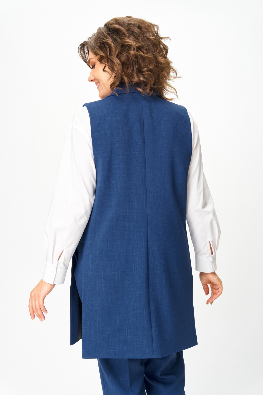 Жилет прямого силуэта, удлиненный. Полочка жилета с центральной застежкой на петли и пуговицы, вертикальными рельефами и прорезными карманами с клапанами. Горловина V-образной формы с отложными лацканами и воротником пиджачного типа. Спинка со средним швом. В боковых швах выполнен декоративный элемент в виде металлических колец крепящихся на петлях.