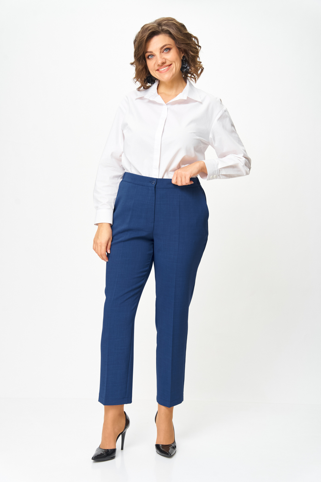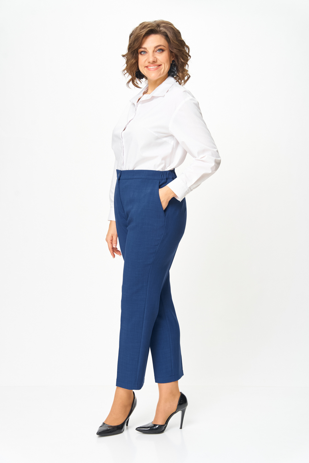 Брюки классические, длиной до косточки, со стрелками. Брюки прилегающие в области бедер и свободные в колене и по низу. По передним половинкам выполнены наклонные карманы, в среднем шве обработана застежка на молнию. По задним половинкам обработаны талиевые вытачки. Брюки на притачном поясе с эластичной тесьмой и застежкой на петлю и пуговицу.