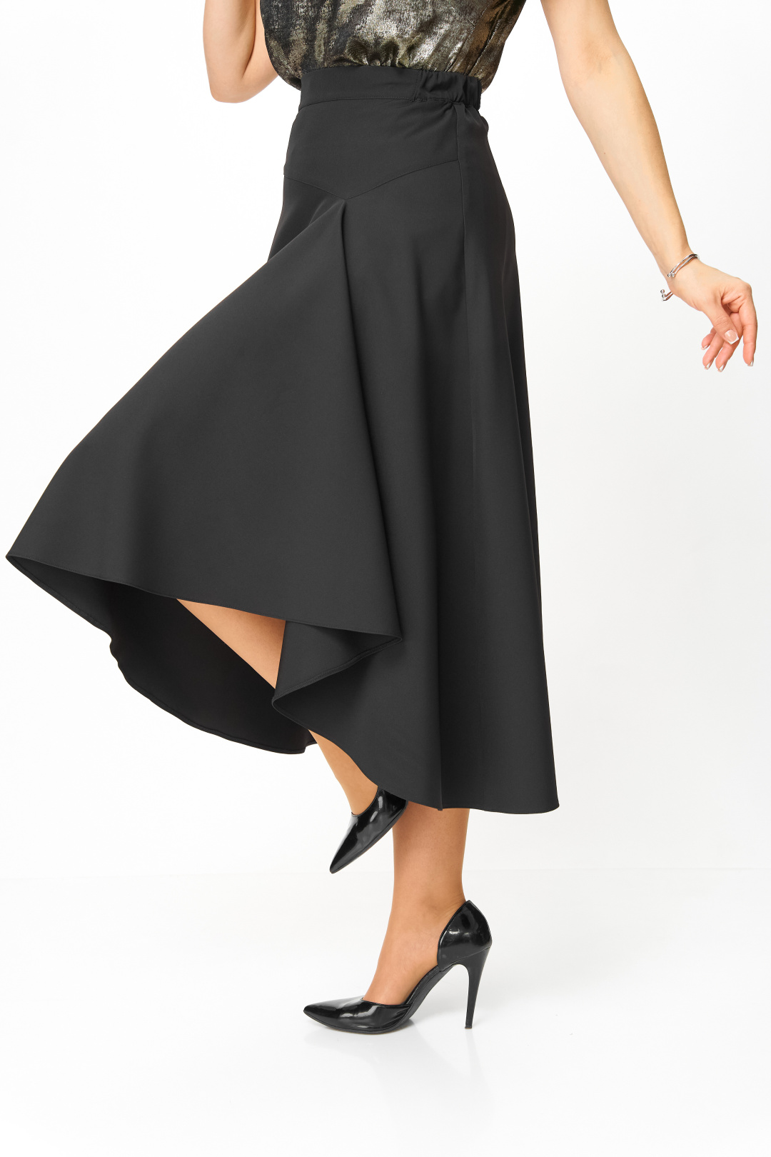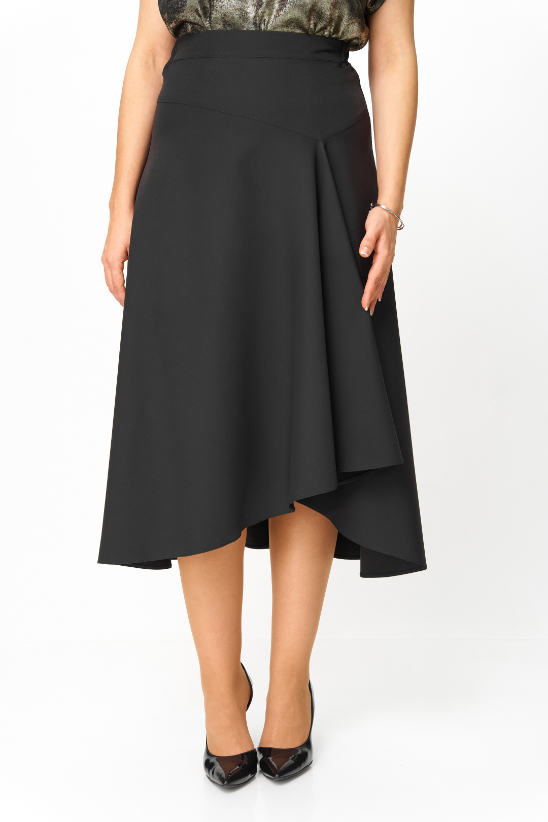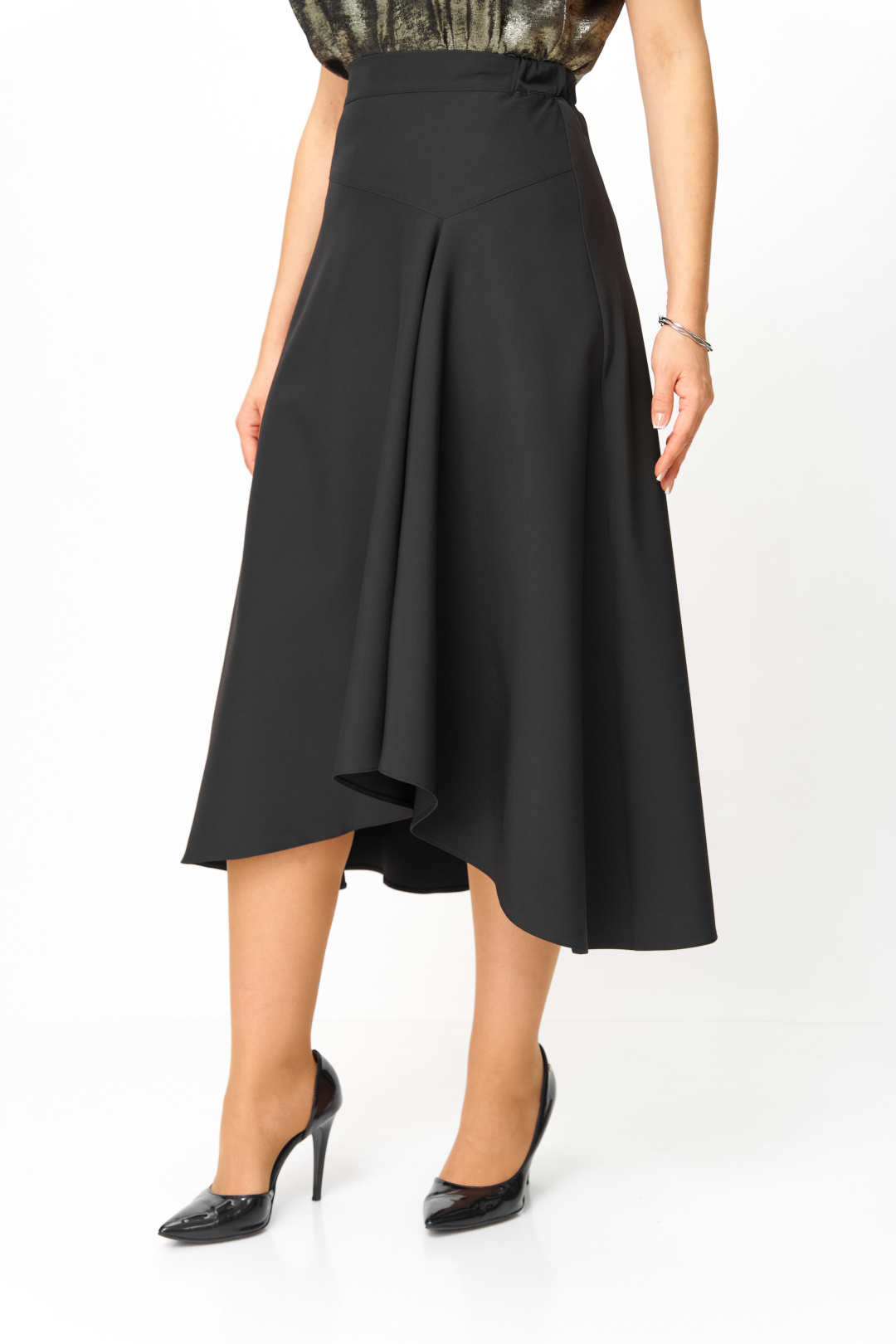 Передняя часть юбки с отрезной кокеткой и конструктивным элементом в виде драпировки и укороченного низа в области левой ноги. Задняя часть юбки со средним швом, в верхней части которго обработана потайная молния. Юбка на притачном поясе, с эластичной тесьмой и застежкой на петлю и пуговицу.