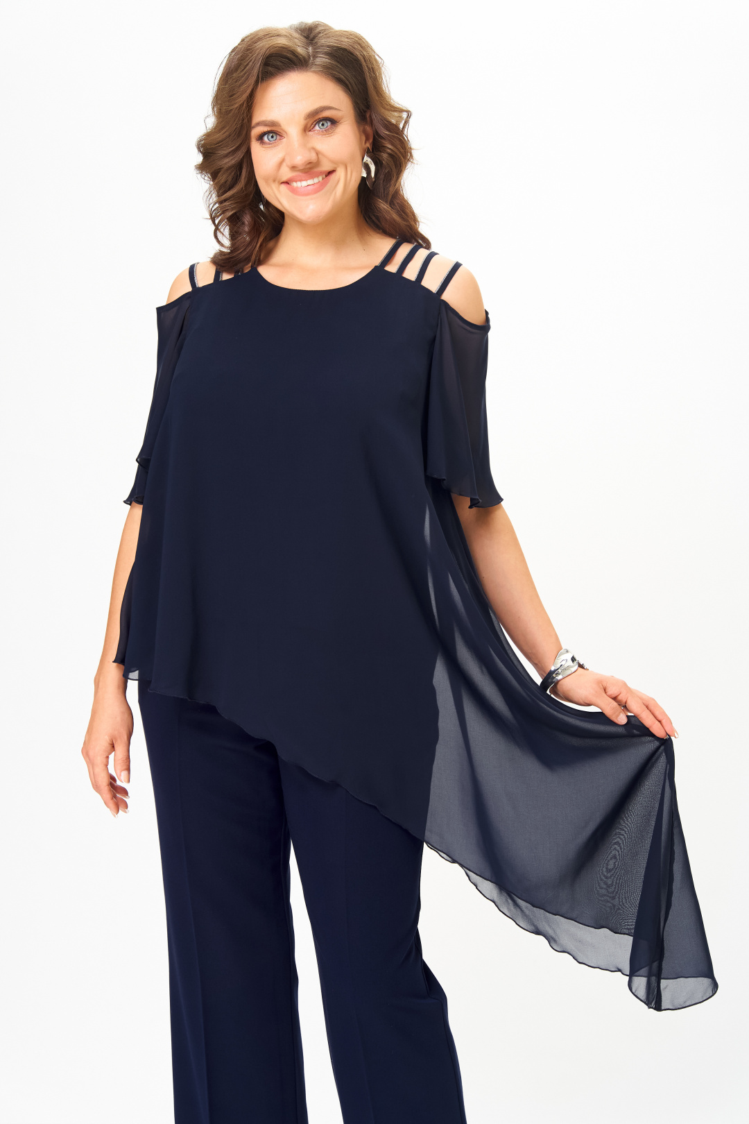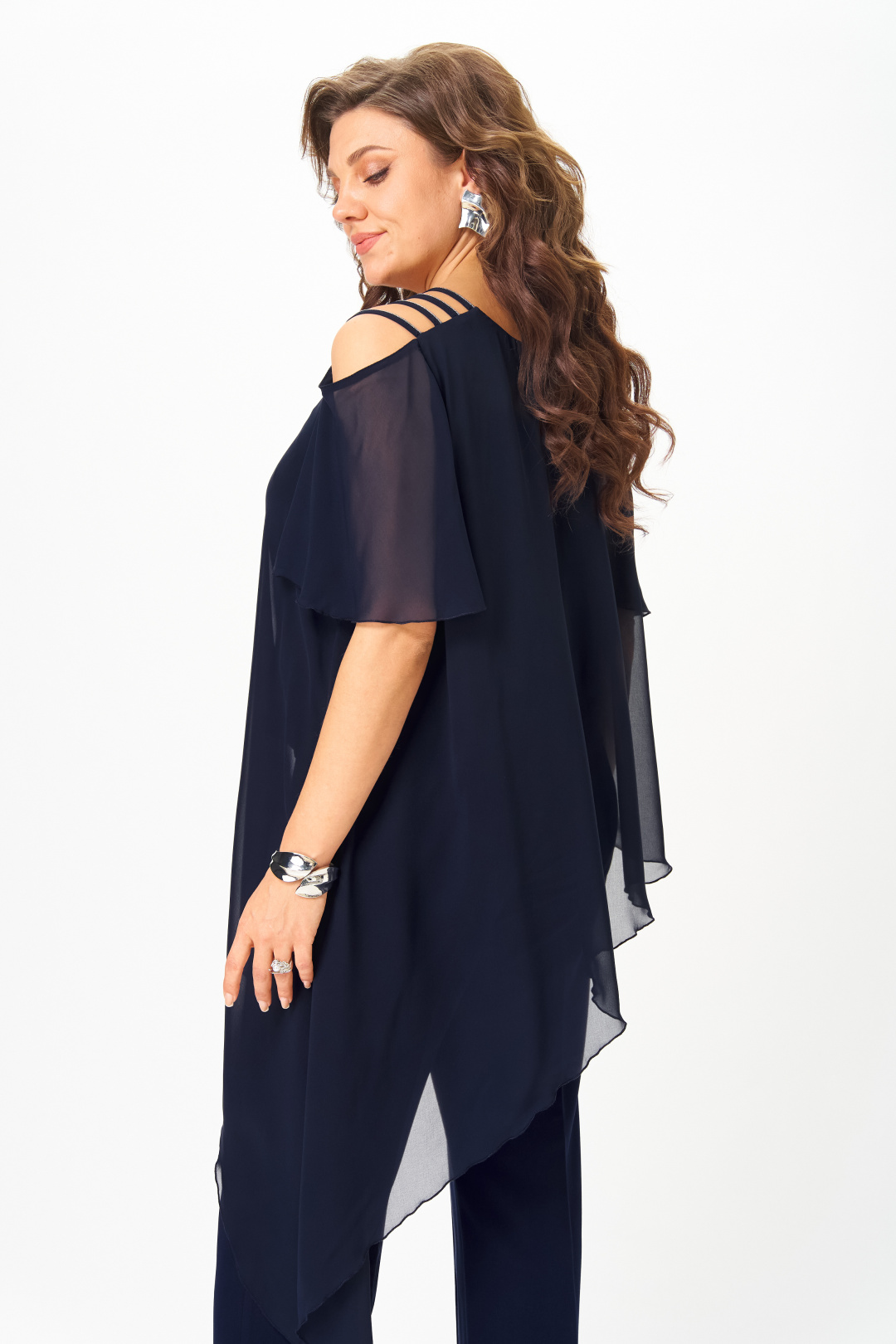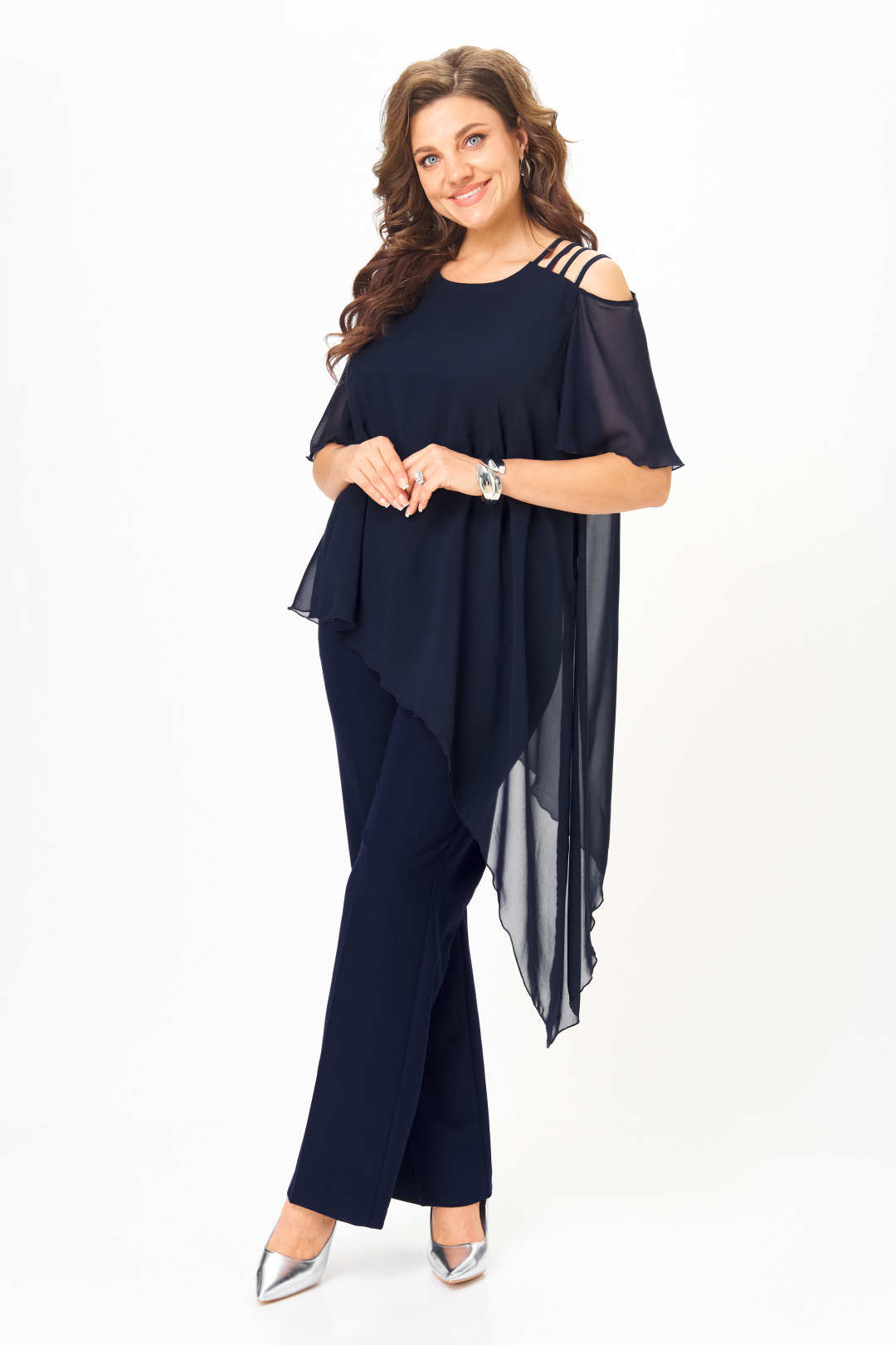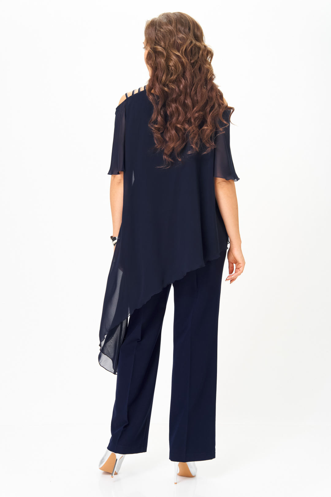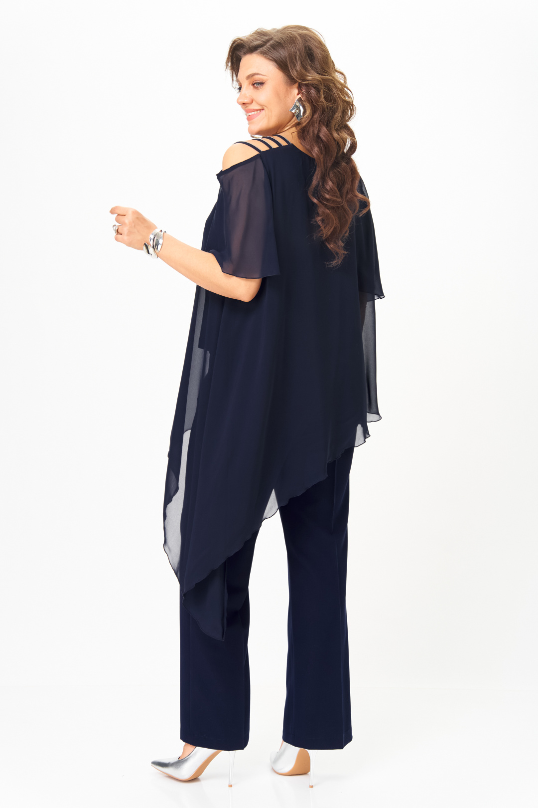 Комплект состоит из туники и брюк. Туника двухслойная, выполнена из однотонного полупрозрачного струящегося шифона (верхняя часть) и трикотажного однотонного полотна (нижняя часть). Брюки выполнены из костюмной однотонной ткани. Ткань брюк имеет механическое растяжение благодаря содержанию в ней эластана. Брючный костюм идеальный вариант на торжественные мероприятия.