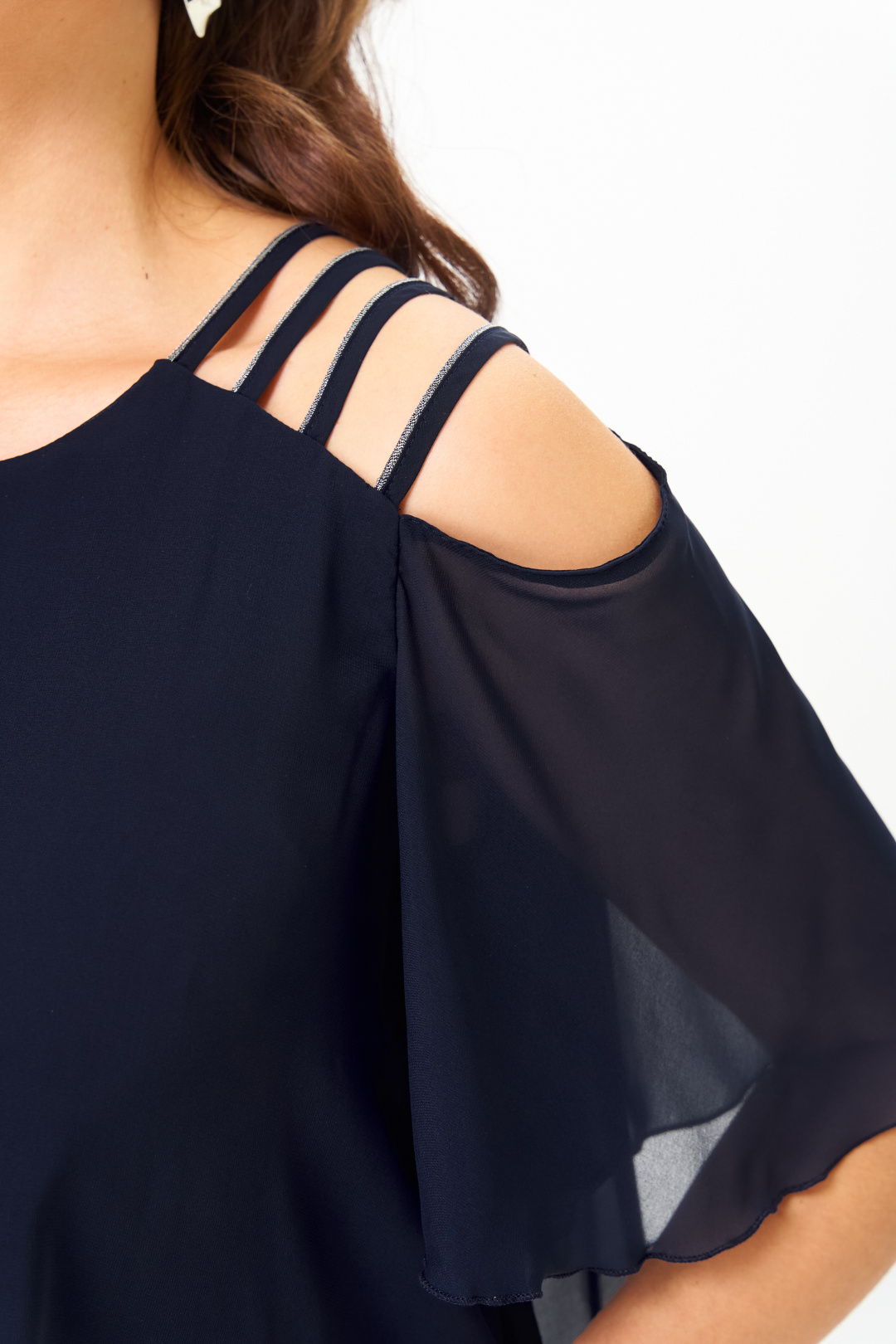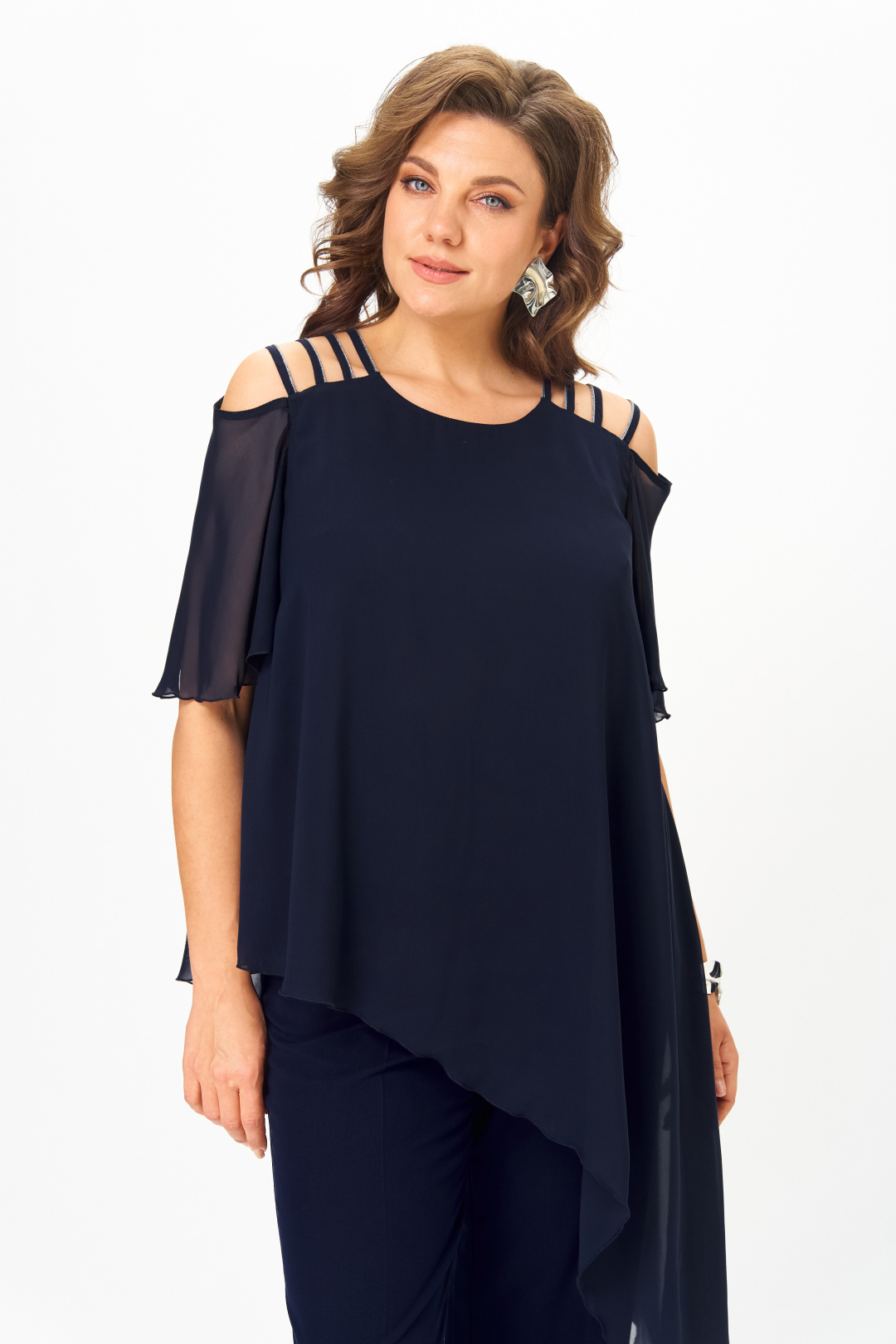 Туника А-образного силуэта с ассиметричным низом. Верхняя часть туники из шифона, полочка и спинка цельные, с круглой горловиной. Плечевой пояс на бретелях с декором из тесьмы с люрексом. Рукав в виде волана, длиной до локтя. Нижняя часть туники из трикотажного полотна, полочка с нагрудными вытачками, спинка цельная.
