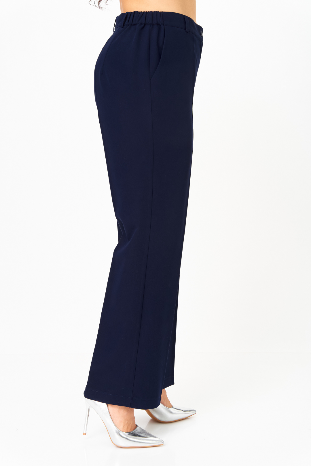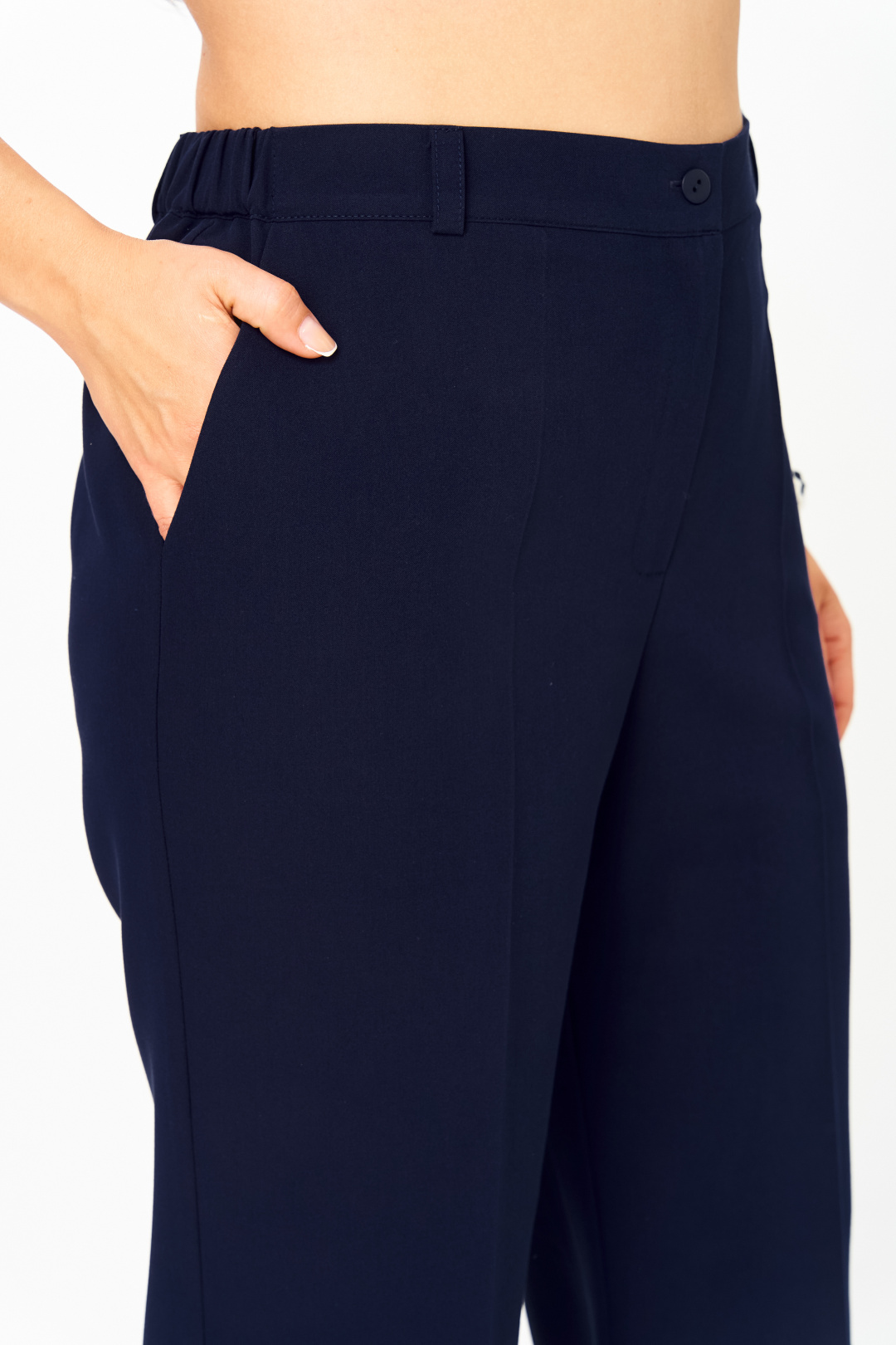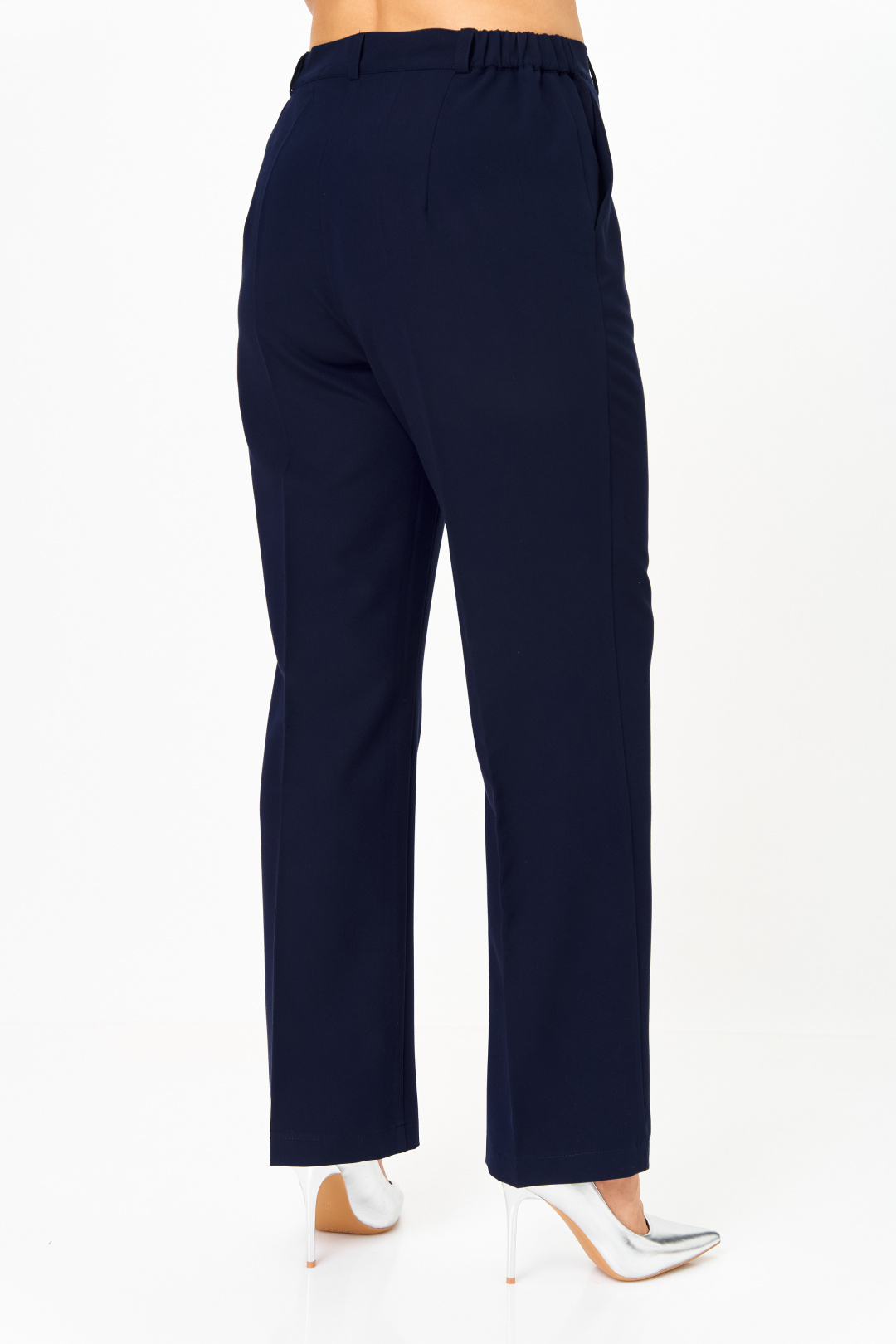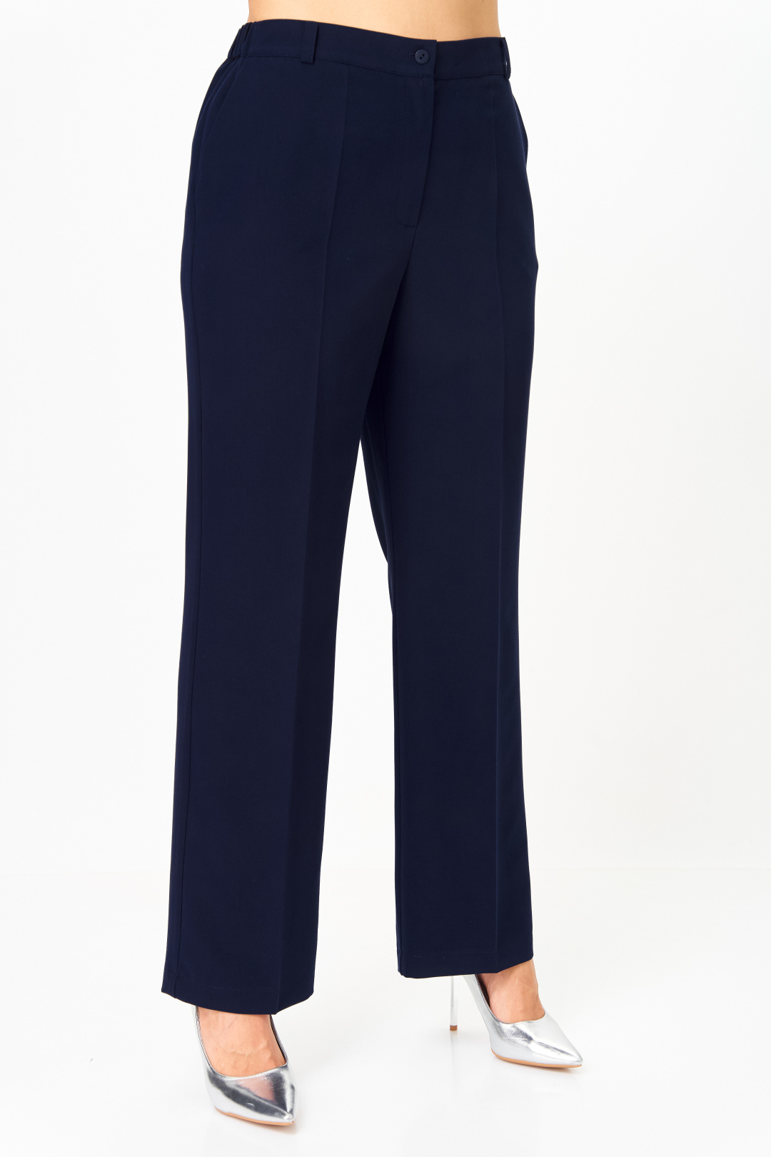 Брюки полной длины, прилегающие в области бедер и свободные в колене и по низу. Брюки со стрелками. По передним половинкам выполнены наклонные карманы. В среднем шве передней половинки обработана застежка на молнию. По задней половинке обработаны талиевые вытачки. По талии брюки на притачном поясе с эластичной тесьмой и застежкой на петлю и пуговицу. По поясу брюк обработаны шлевки под ремень.