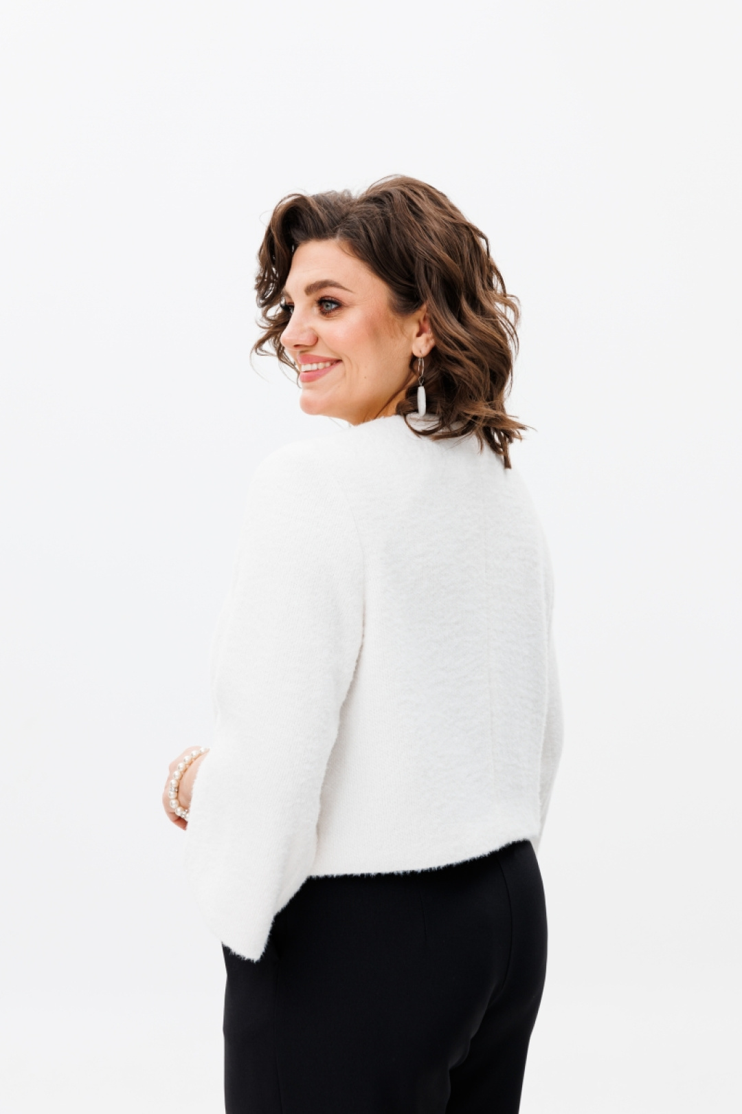 Фигурные рукава болеро, украшены красивыми бусинами. Благодаря мягкой текстуре и утепляющим свойствам, это болеро не только прекрасно держит форму, но и обеспечивает теплую и комфортную атмосферу в любое время года.
