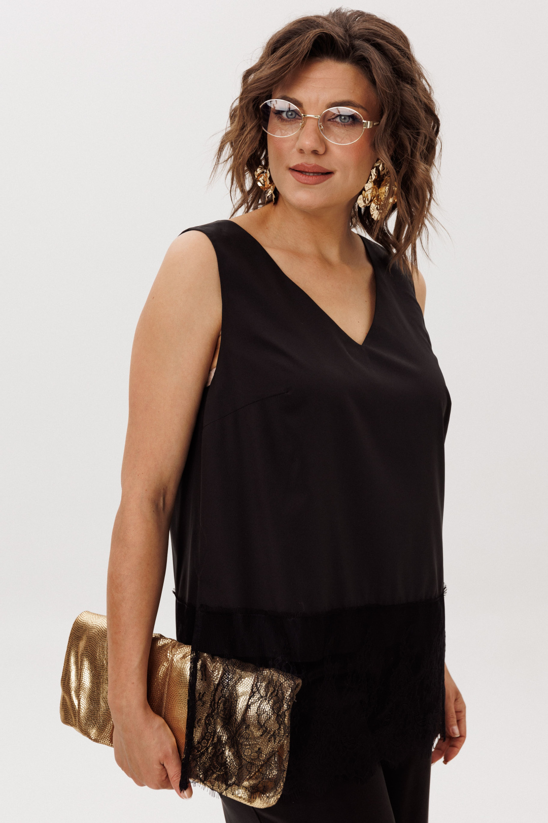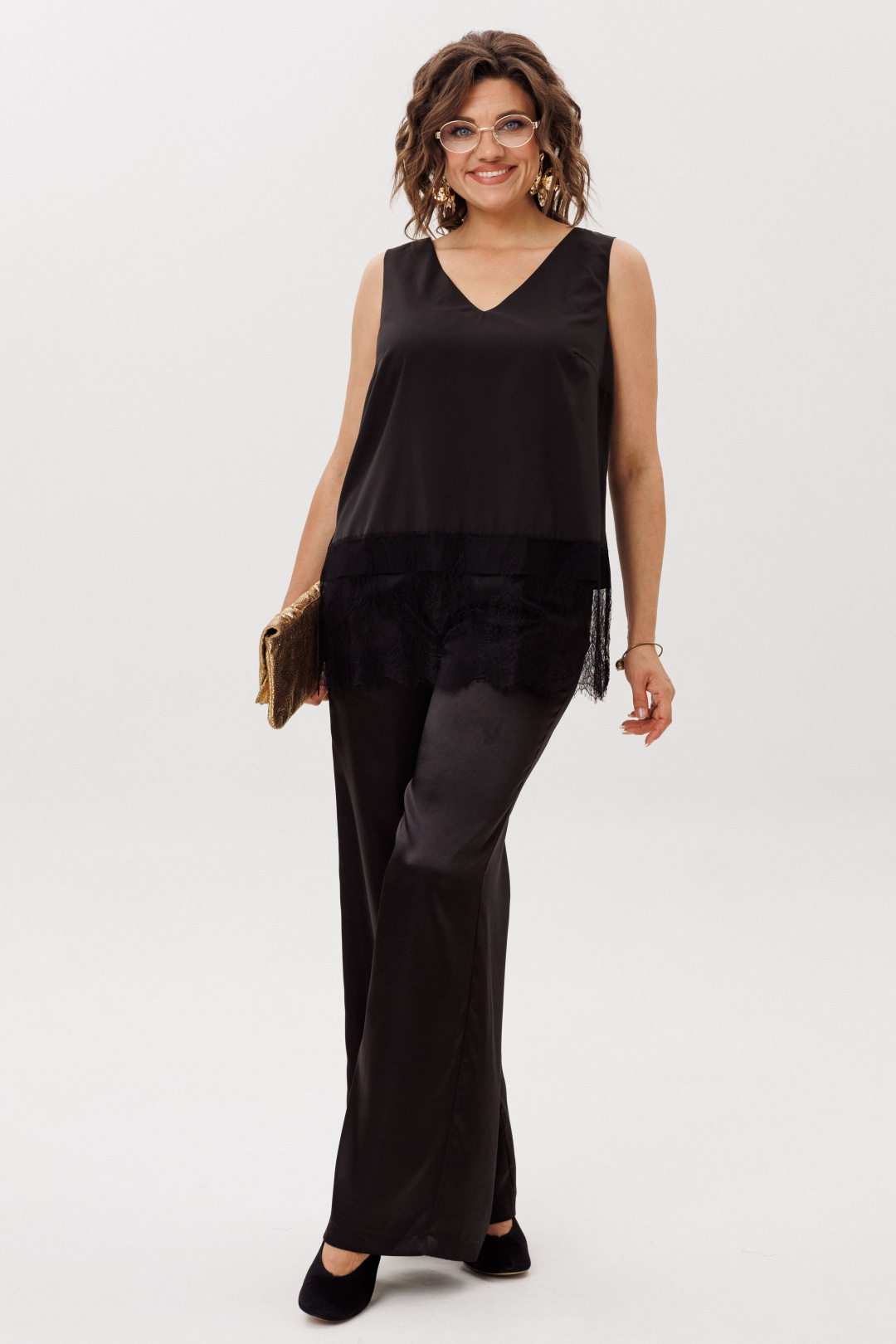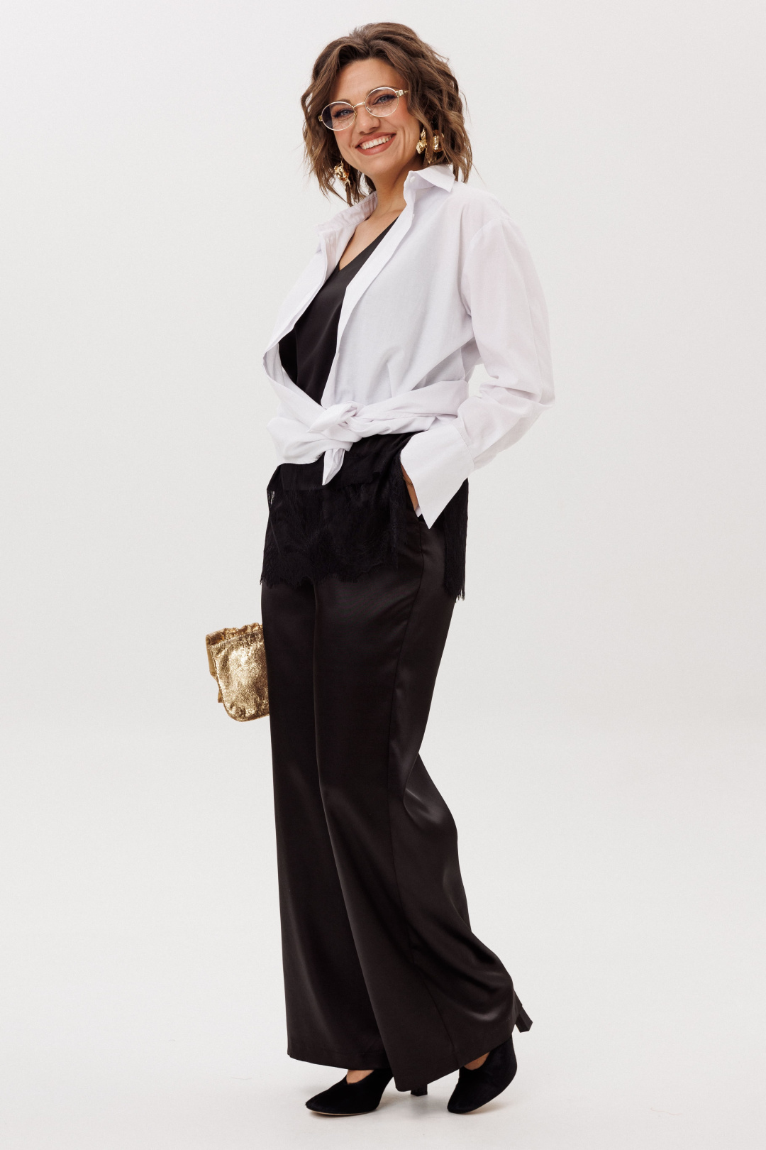 На модели в топе цвета «черный лед» атласные брюки 1737, юбка 1510, жакет 1661 и белая рубашка 1203.1.