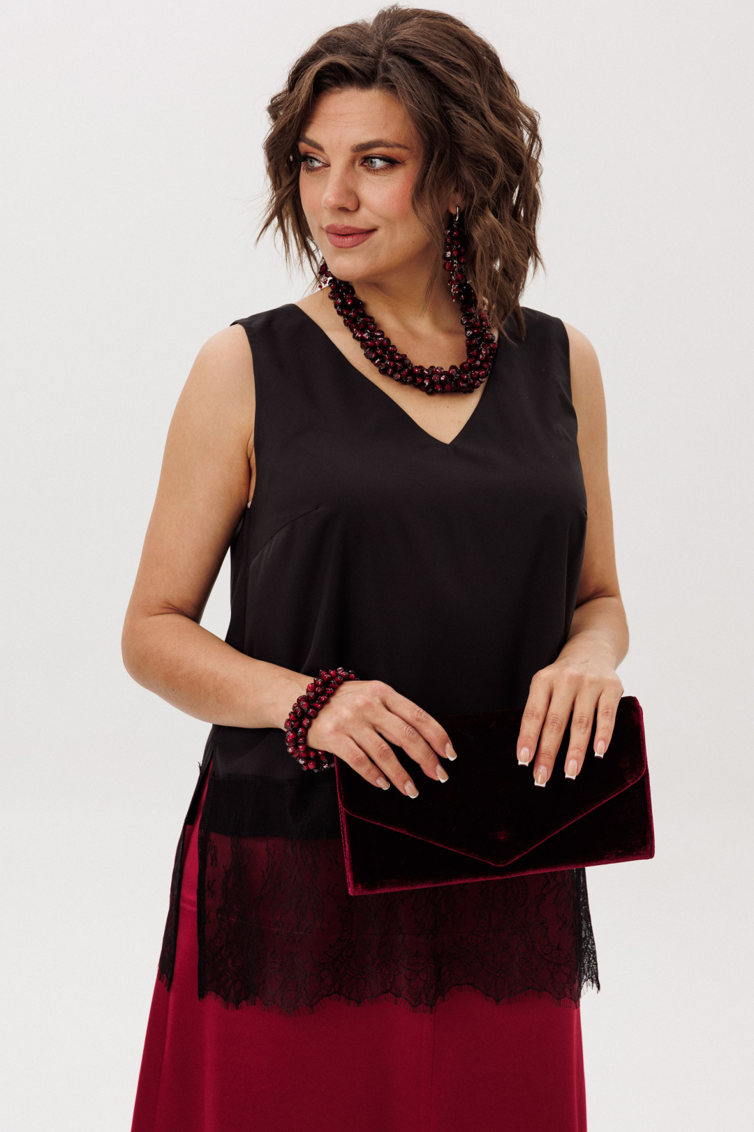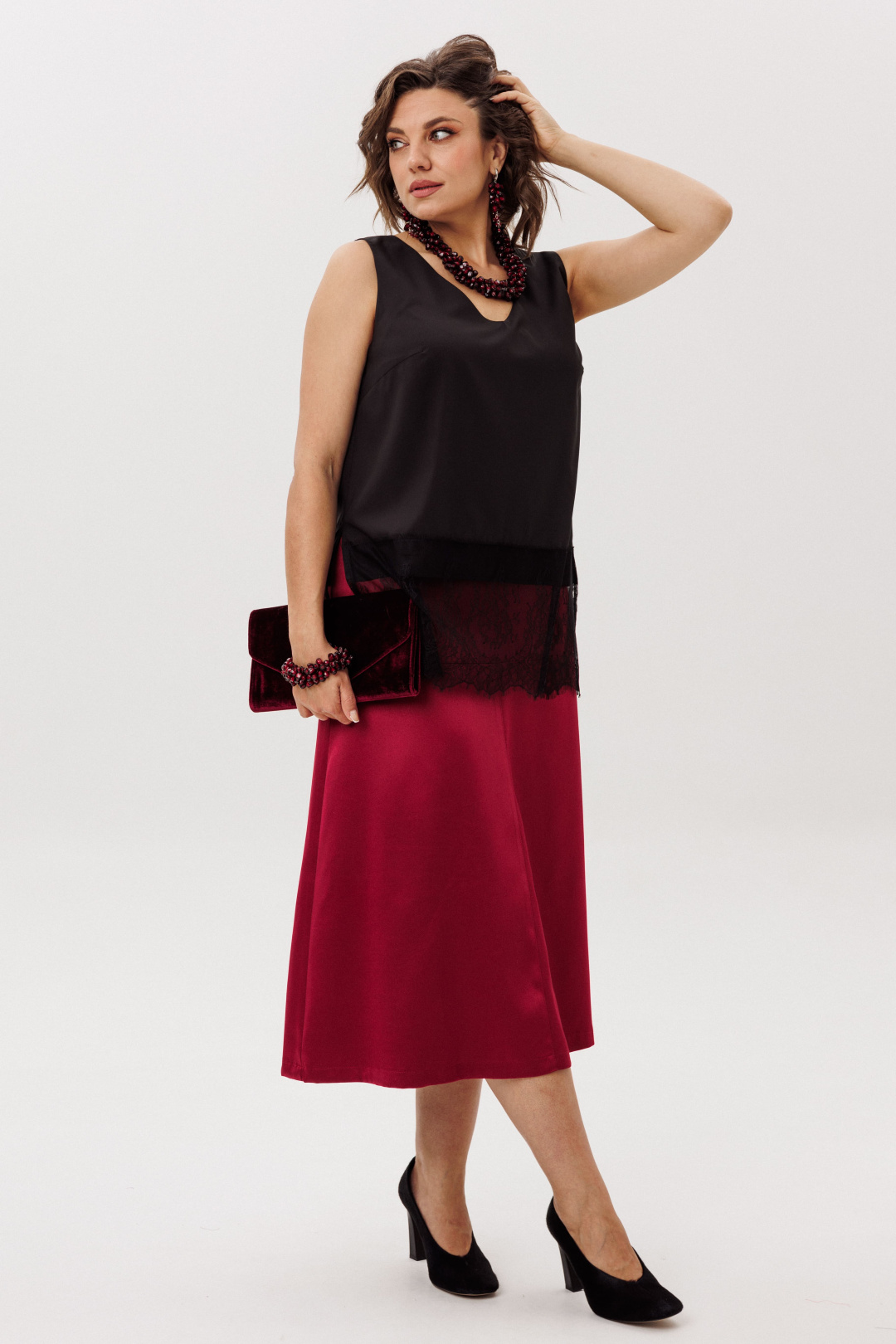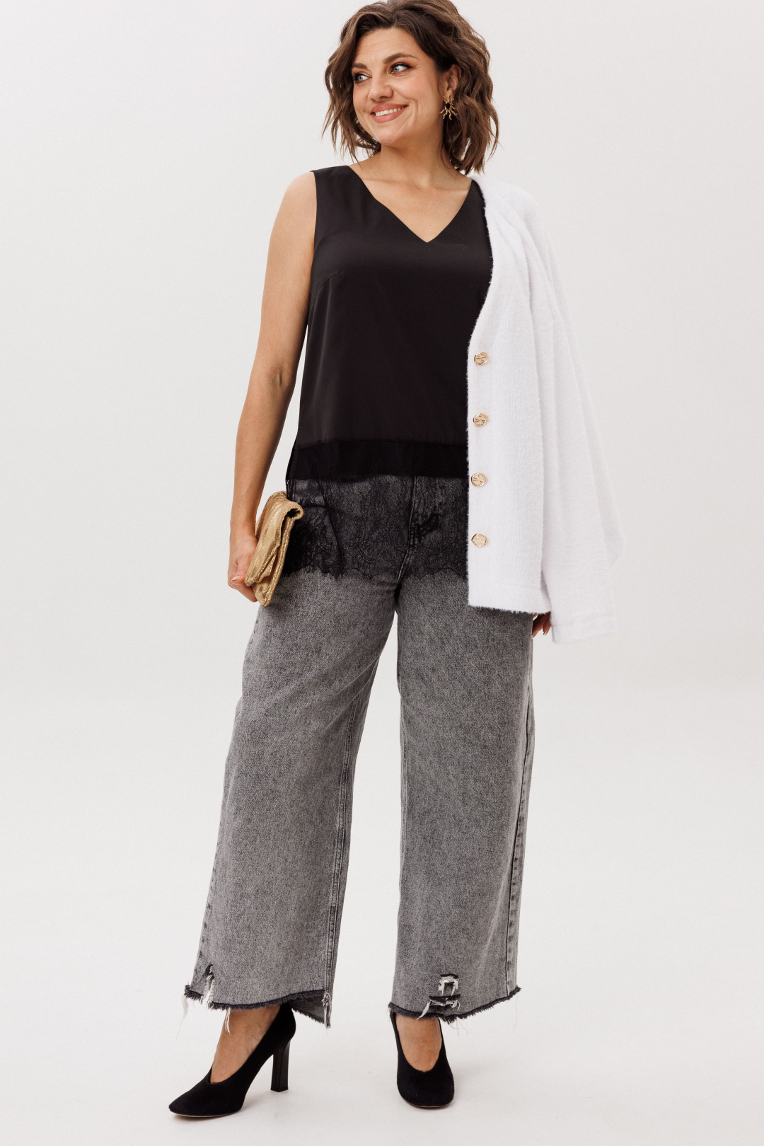 На модели в топе цвета «черный лед» атласные брюки 1737, юбка 1510, жакет 1661 и белая рубашка 1203.1.