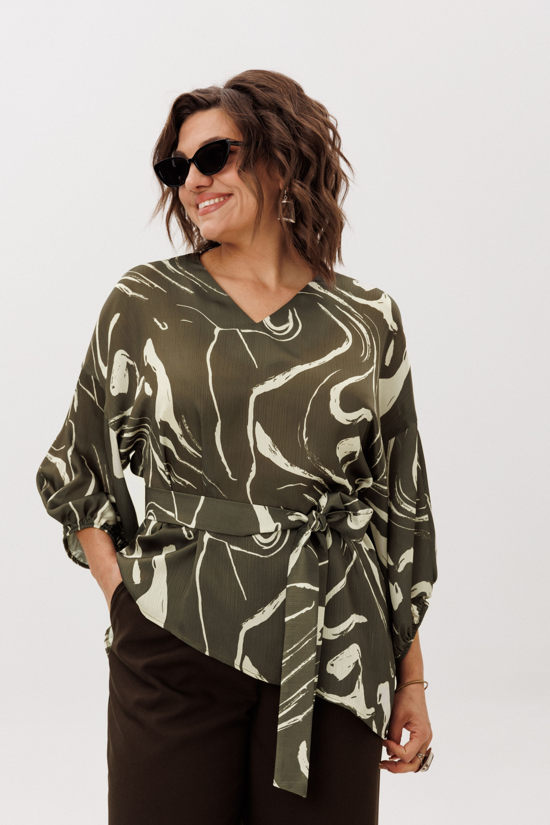 Главная особенность этой модели — продуманная многозадачность. Пояс в комплекте позволяет вам самостоятельно создавать нужный образ: затяните его, чтобы подчеркнуть талию и создать фигуру «песочные часы», или отпустите для расслабленного силуэта в стиле бохо. Завершает картину асимметричный низ с разрезом — деталь, которая делает блузу по-настоящему уникальной и визуально вытягивает силуэт.