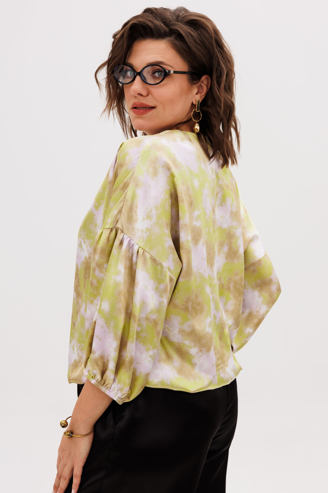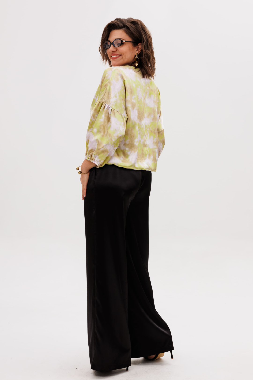 Но главная тайна этой модели скрыта в ее сердце — эластичная резинка, проходящая по всему низу блузы. Эта деталь полностью меняет правила игры. Теперь вы сами становитесь творцом своего образа: укоротите блузу для дерзкого современного вида или отпустите ее для струящегося, романтичного силуэта. Она послушно следует за вашим желанием, подстраиваясь под настроение и ситуацию.
