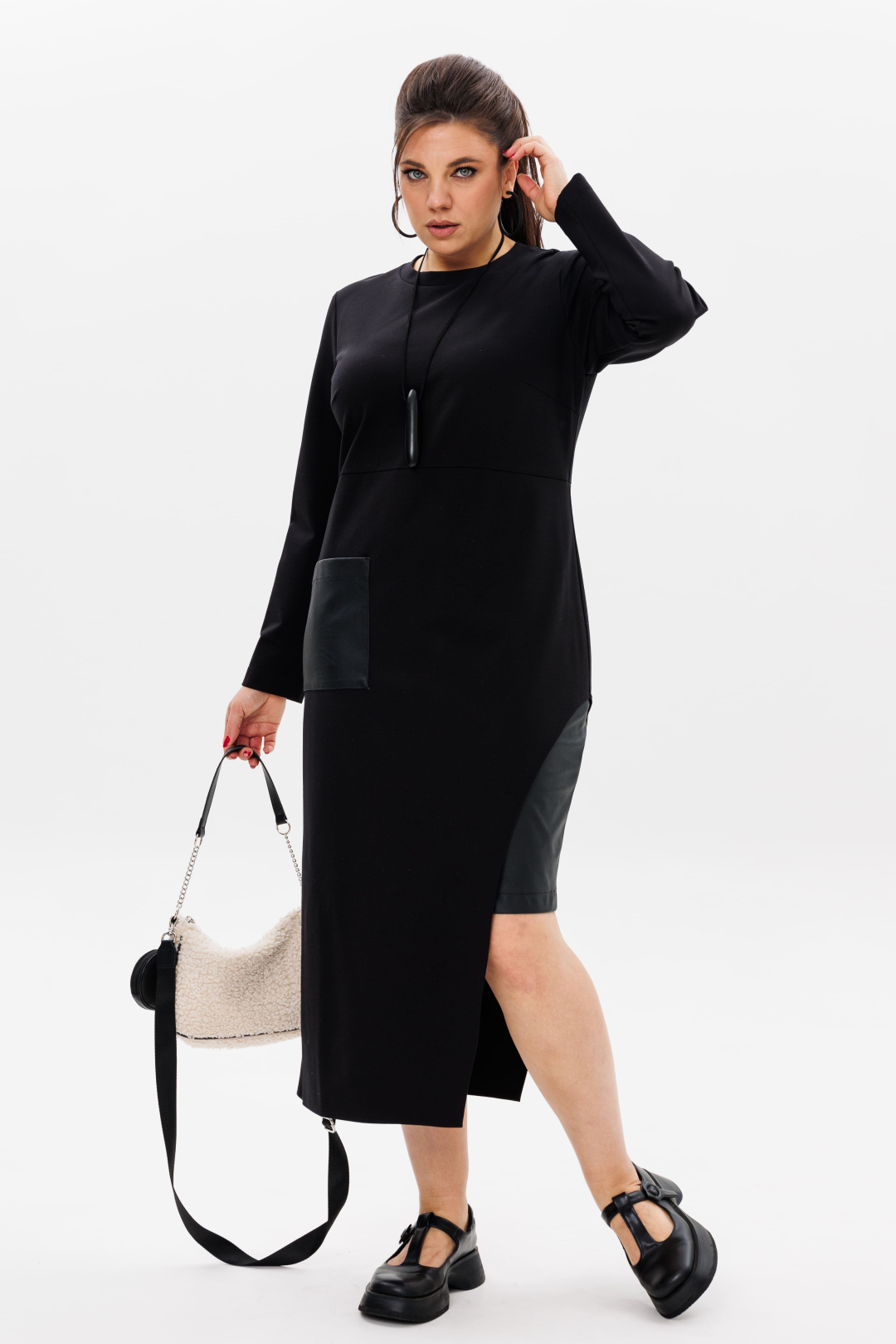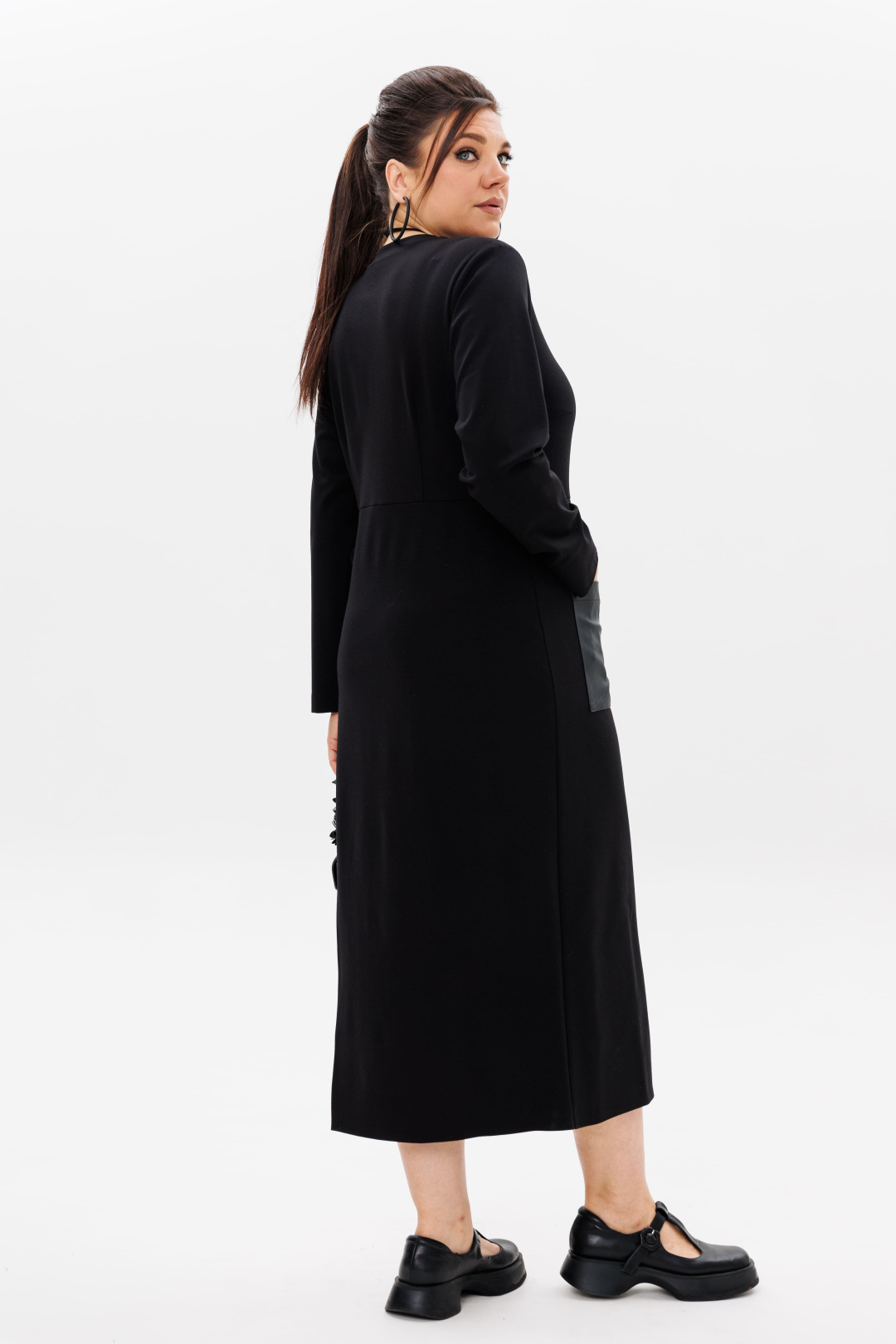 Нижняя юбка из эко кожи с оригинальным кроем создает динамичность, а накладной карман тоже из эко кожи добавляет нотку смелости и практичности. Длинные втачные рукава обеспечивают комфорт и стиль в любое время года.