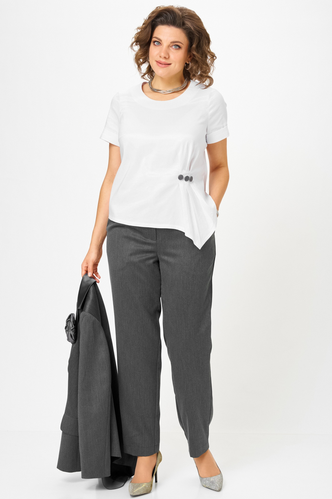 Блузка полуприлегающего силуэта с ассиметричным низом. Горловина округлой формы. Перед с нагрудной вытачкой, вертикальными защипами и декоративными пуговицами по талии. Спинка со средним швом. Рукав втачной короткий с манжетой.