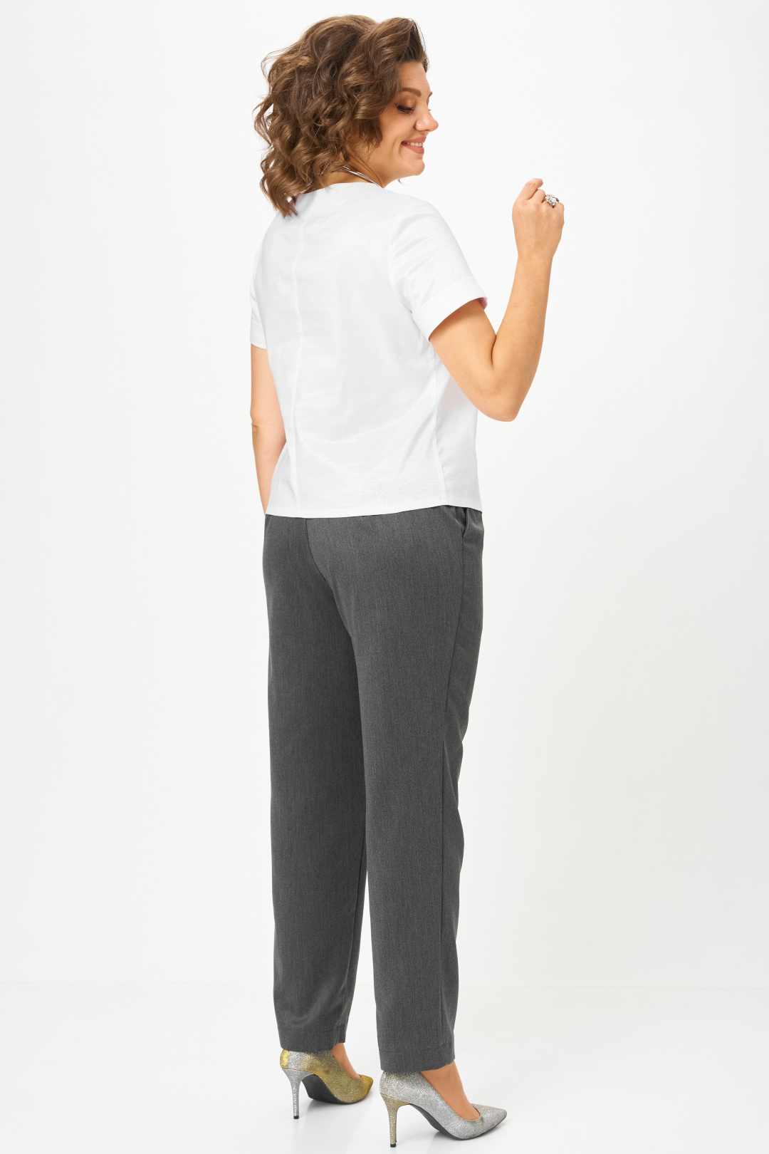 Брюки с высокой посадкой, слегка заужены книзу. Притачной пояс со шлевками и застежкой на молнию и пуговицу, по боковым — вставка из эластичной тесьмы. На задних половинках — вытачки. В боковых швах расположены функциональные косые карманы.