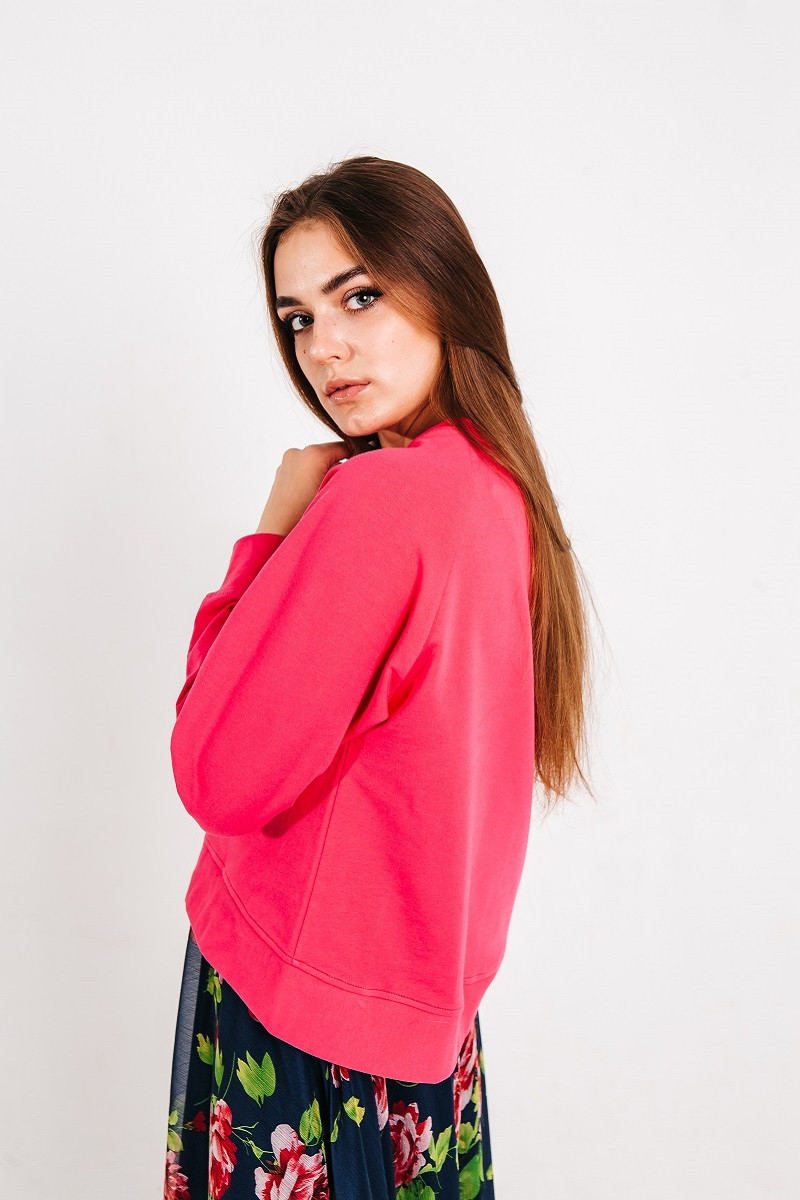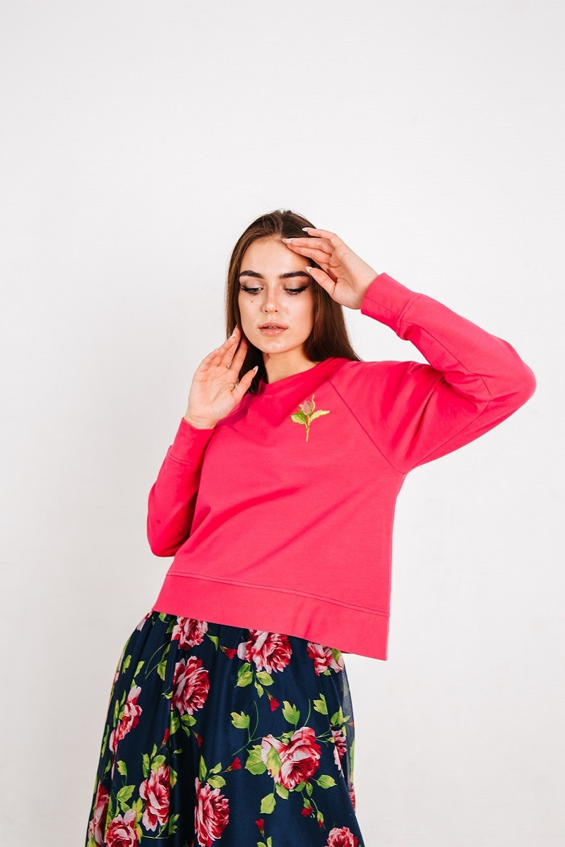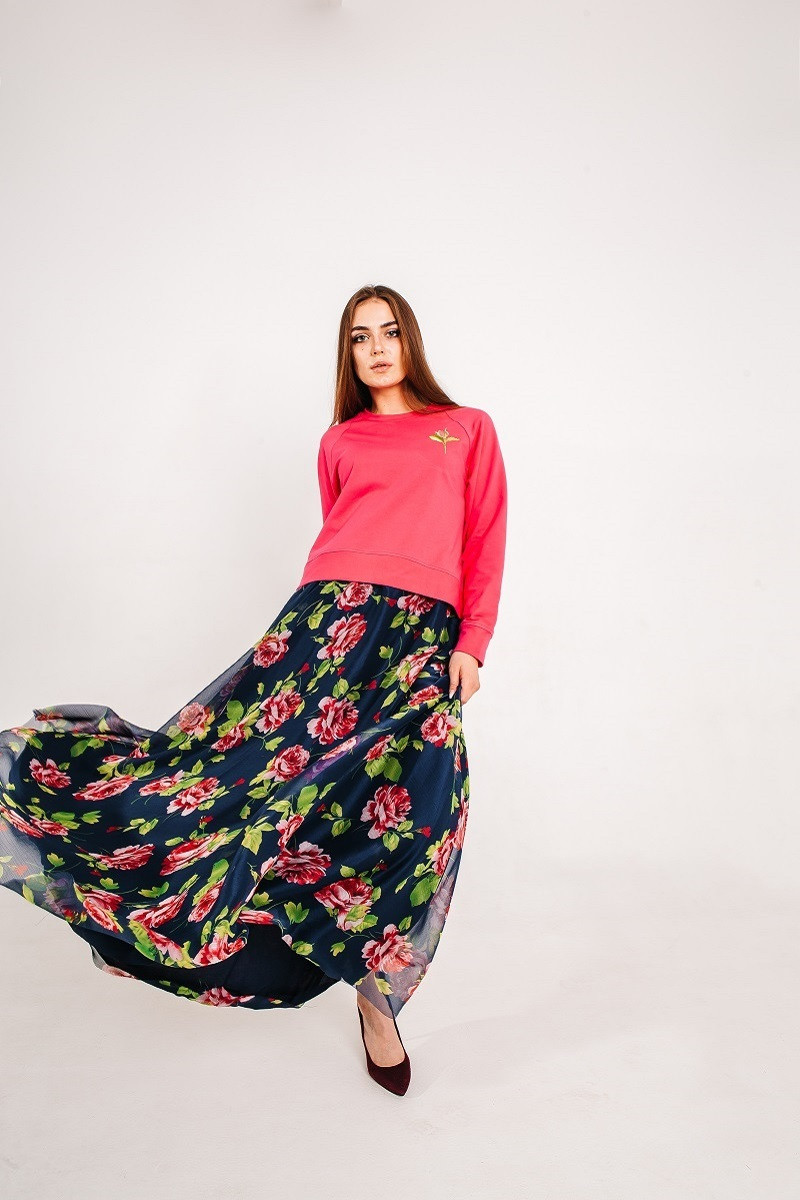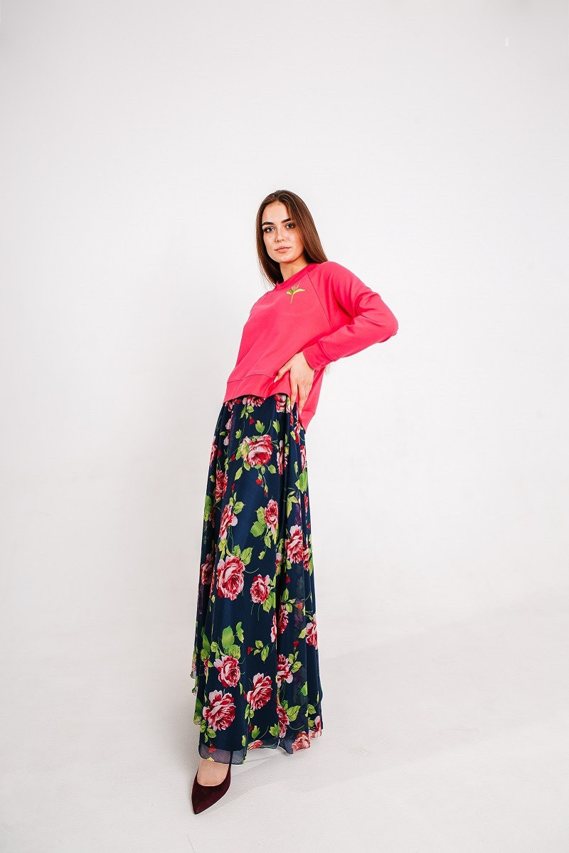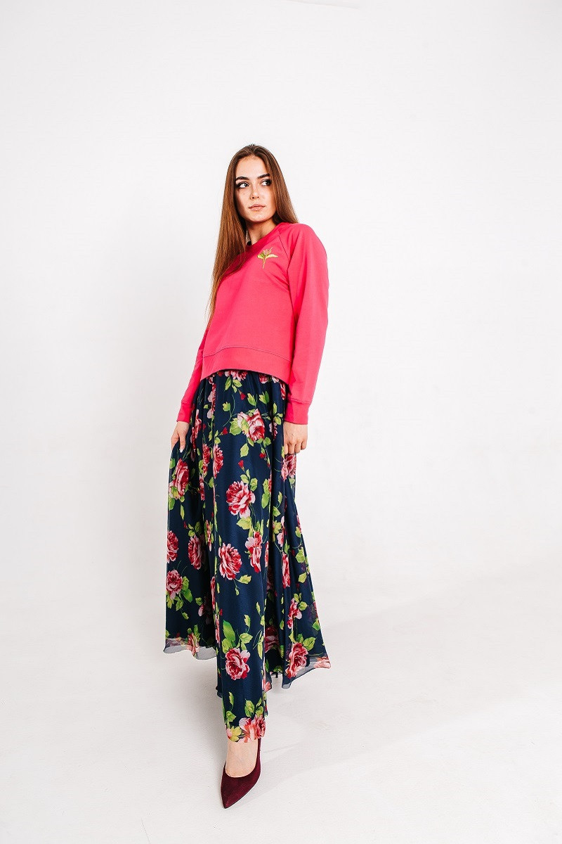 Костюм состоящий из юбки и свитшота. Свитшот прямого силуэта,рукав реглан.Понизу изделия и низу рукавов отделочные планки. По горловине узкая обтачка. По переду выполнена дизайнерская вышивка. Длина по спинке 48см , Длина рукава 56см. Юбка из шифона длинная миди, на вискозной подкладке. Пояс на резинке. Длина юбки 86см.