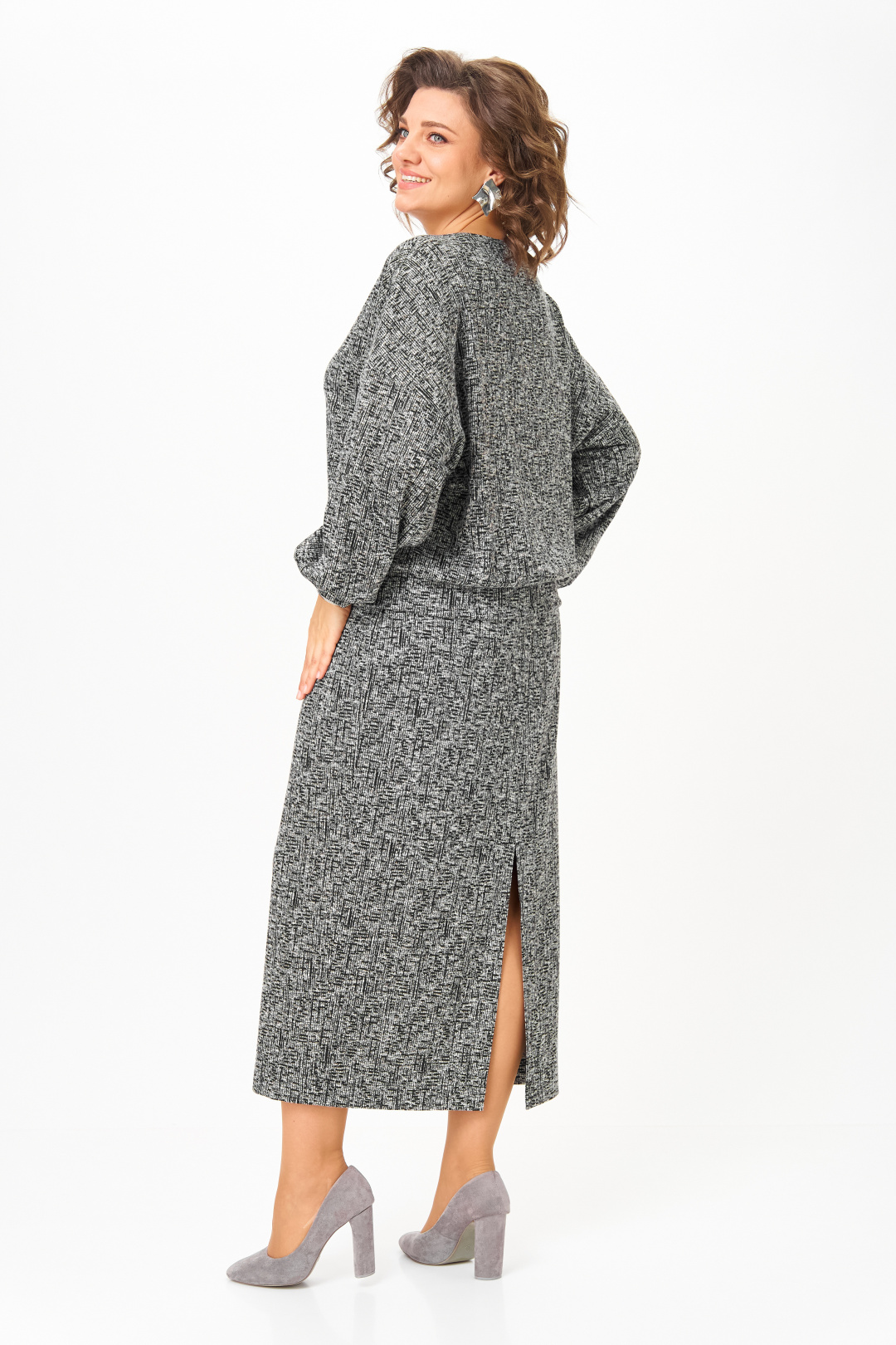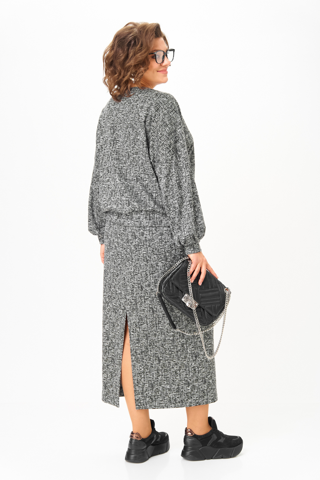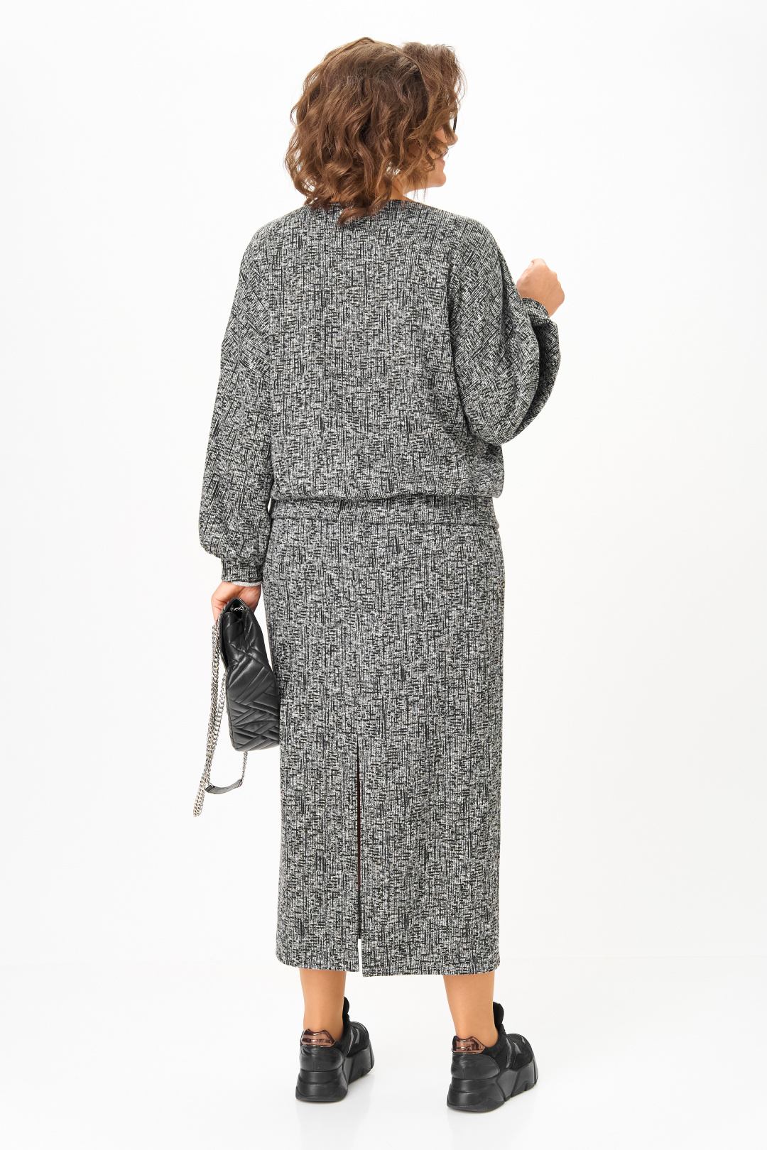 Спинка юбки со средним швом. Элегантный высокий разрез усиливает эффект стройности и создает комфорт при движении. К блузе прилагается съёмный стильный декор, что придает свою изюминку данному комплекту.