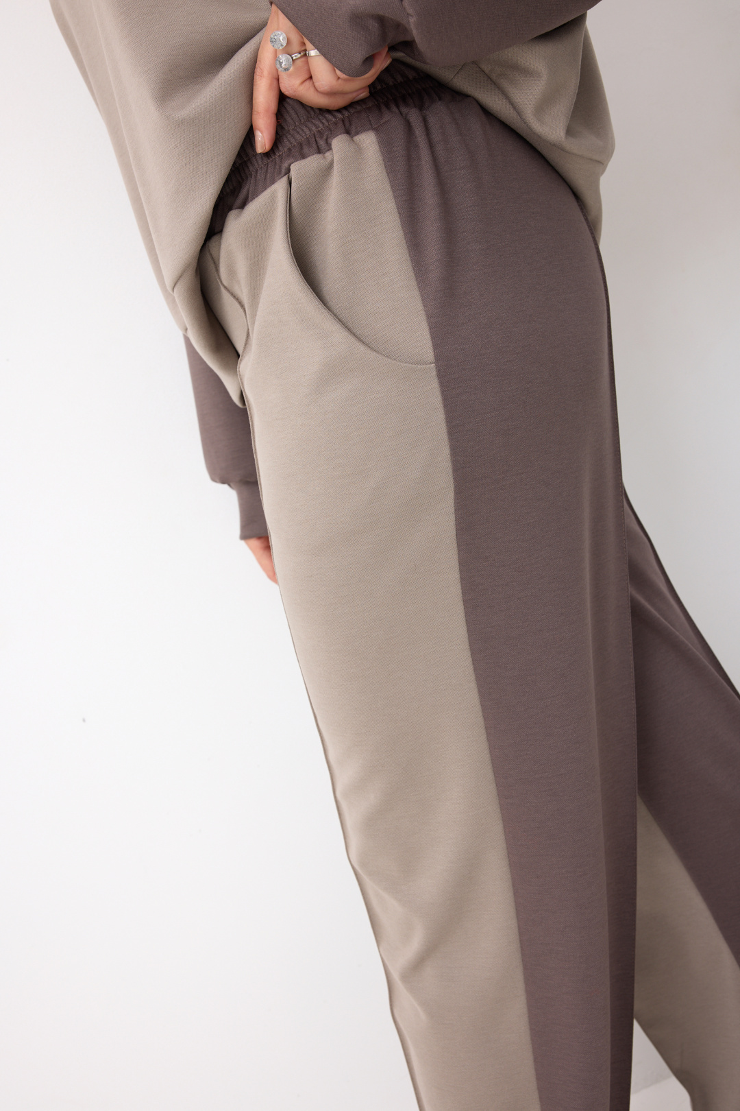Свитшот свободного силуэта, горловина полукруглой формы обработана притачной обтачкой из основного материала, декорирована металлической брошью. Рукав реглан с манжетой по низу. Низ изделия обработан обтачкой. Брюки свободного силуэта, с застроченными стрелками. Пояс на резинке с островком для Вашего удобства. В боковых швах карманы «Хулиганы». Низ обработан классическим способом вподгибку.
