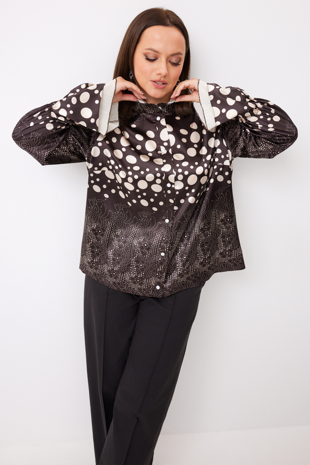 Если Вы мечтаете о блузе, которая подчеркнёт Вашу женственность и добавит образу элегантность, у нас есть готовое решение! Эта блуза из мягкой ткани с переливом в глубоком шоколадном цвете с нежной шифоновой отделкой – именно то, что Вам нужно! Мягкий блеск роскошной ткани, изящные элементы отделки придают Вашему образу утончённость и лоск во время вечернего выхода, деловой встречи либо отдыха с друзьями в любимом кафе.