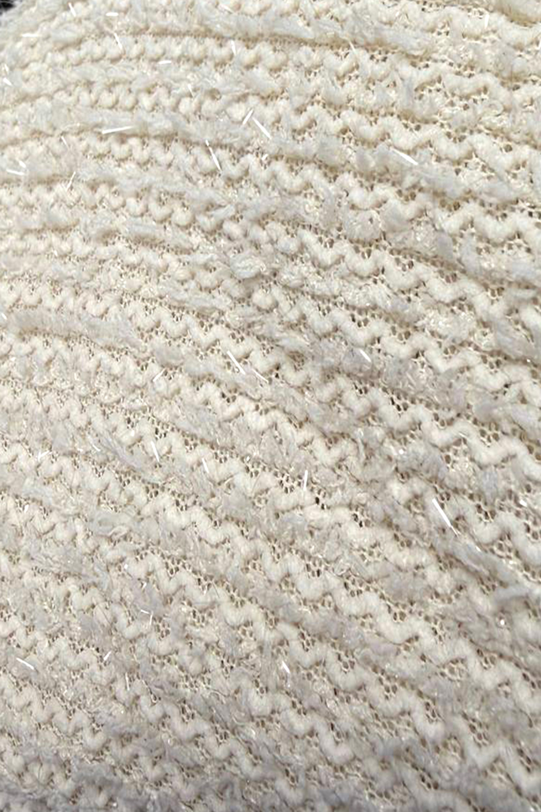 Нежный свитшот свободного кроя из фактурного трикотажа с вплетением мерцающих нитей в благородном оттенке топлёного молока - идеальный выбор для уютных и элегантных образов. Модель идеально впишется в Ваш гардероб, позволяя создавать множество современных сочетаний с жакетами, брюками, юбками и различной обувью.