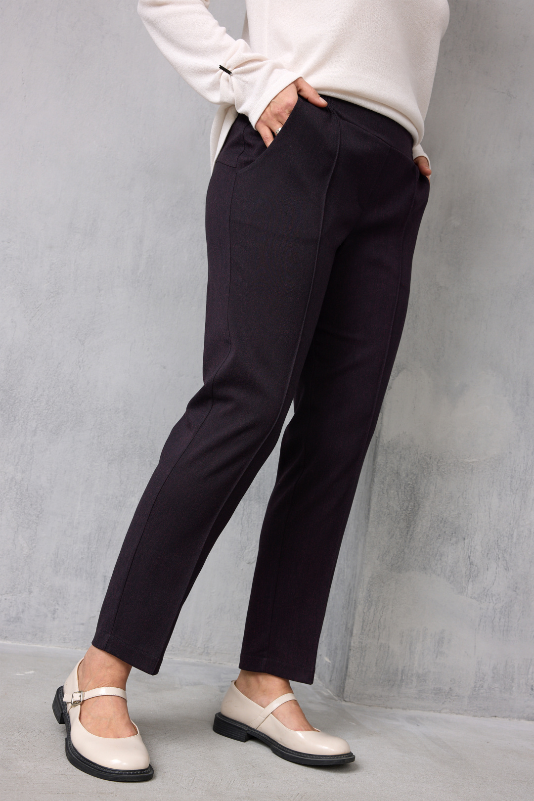 Классические брюки полуприлегающего силуэта выполнены из тактильно приятного слегка растяжимого текстиля, который Вам подарит невероятный комфорт! Красивая расцветка «чёрный баклажан» добавит образу изысканность и шарм. Модель прекрасно держит форму, стройнит и вытягивает силуэт, а застроченные стрелки визуально добавляют ножкам несколько сантиметров. Брюки с лёгкостью позволят создавать множество образов как элегантных – с блузой, жакетом и лодочками, так и спортивных - с любимой футболкой, худи и кедами. Пояс притачной, на эластичной резинке. По передней части на поясе выполнен «островок», что позволяет визуально скрыть животик. Для Вашего удобства выполнены карманы хулиганы. В боковых швах карманы «Хулиганы». Притачная кокетка по задней части, позволяет грамотно создавать нужные линии, что делает посадку брюк идеальной. Низ брюк обработан классическим способом в подгибку.