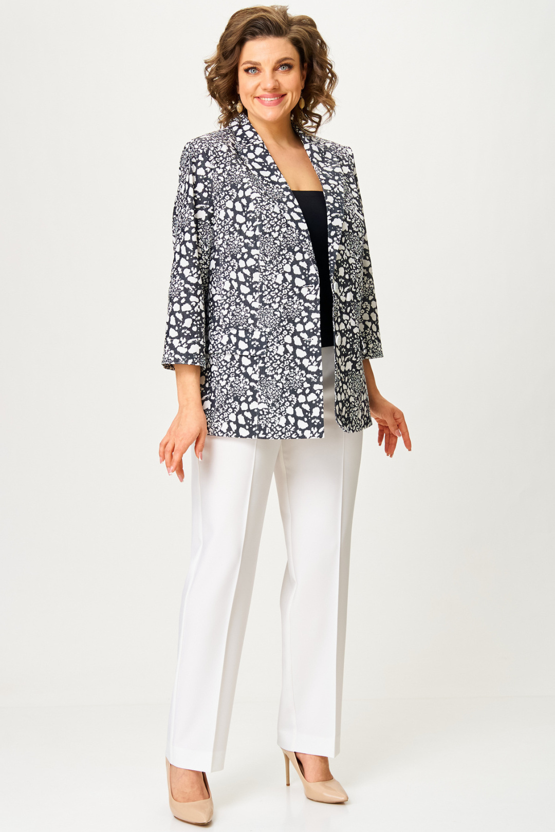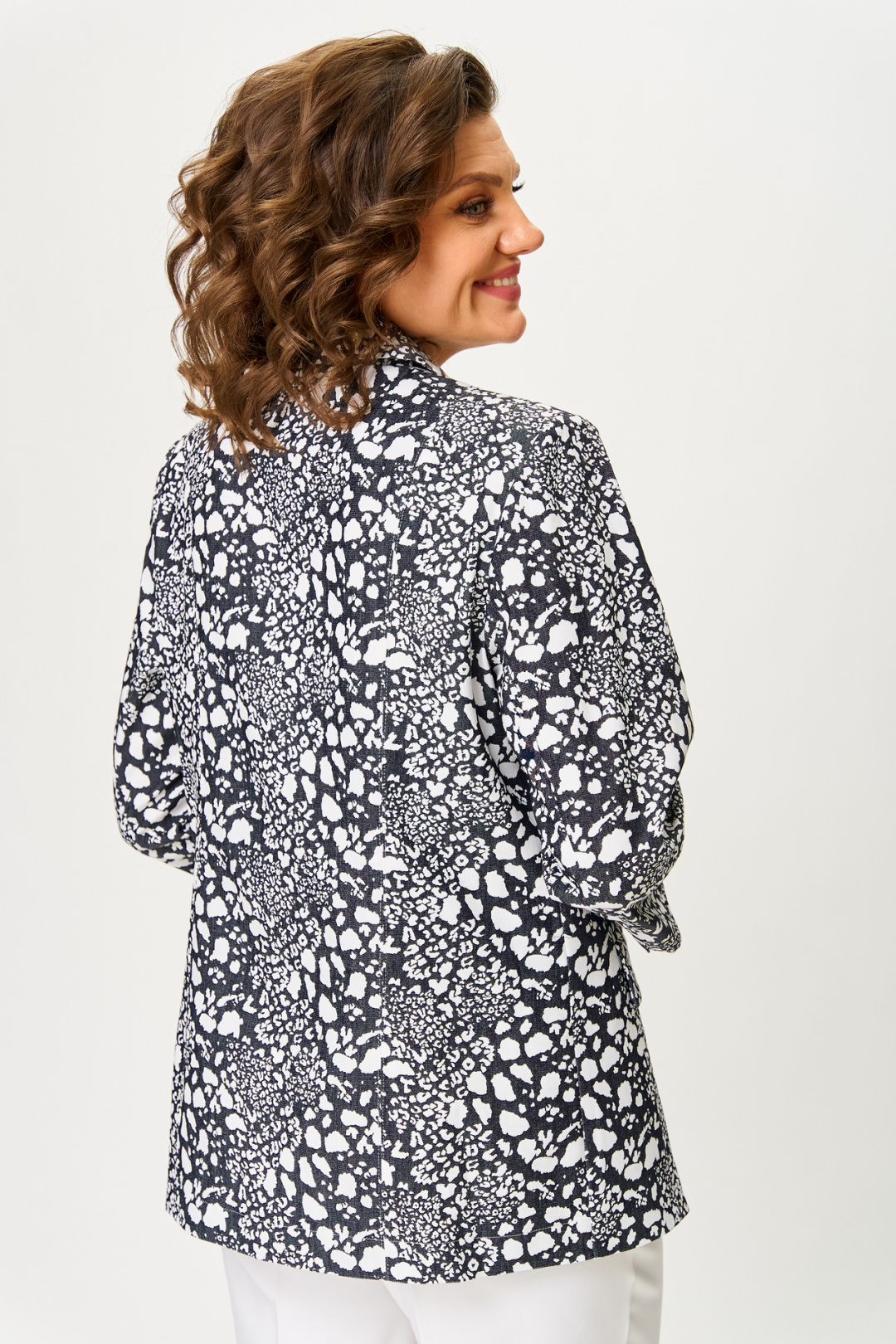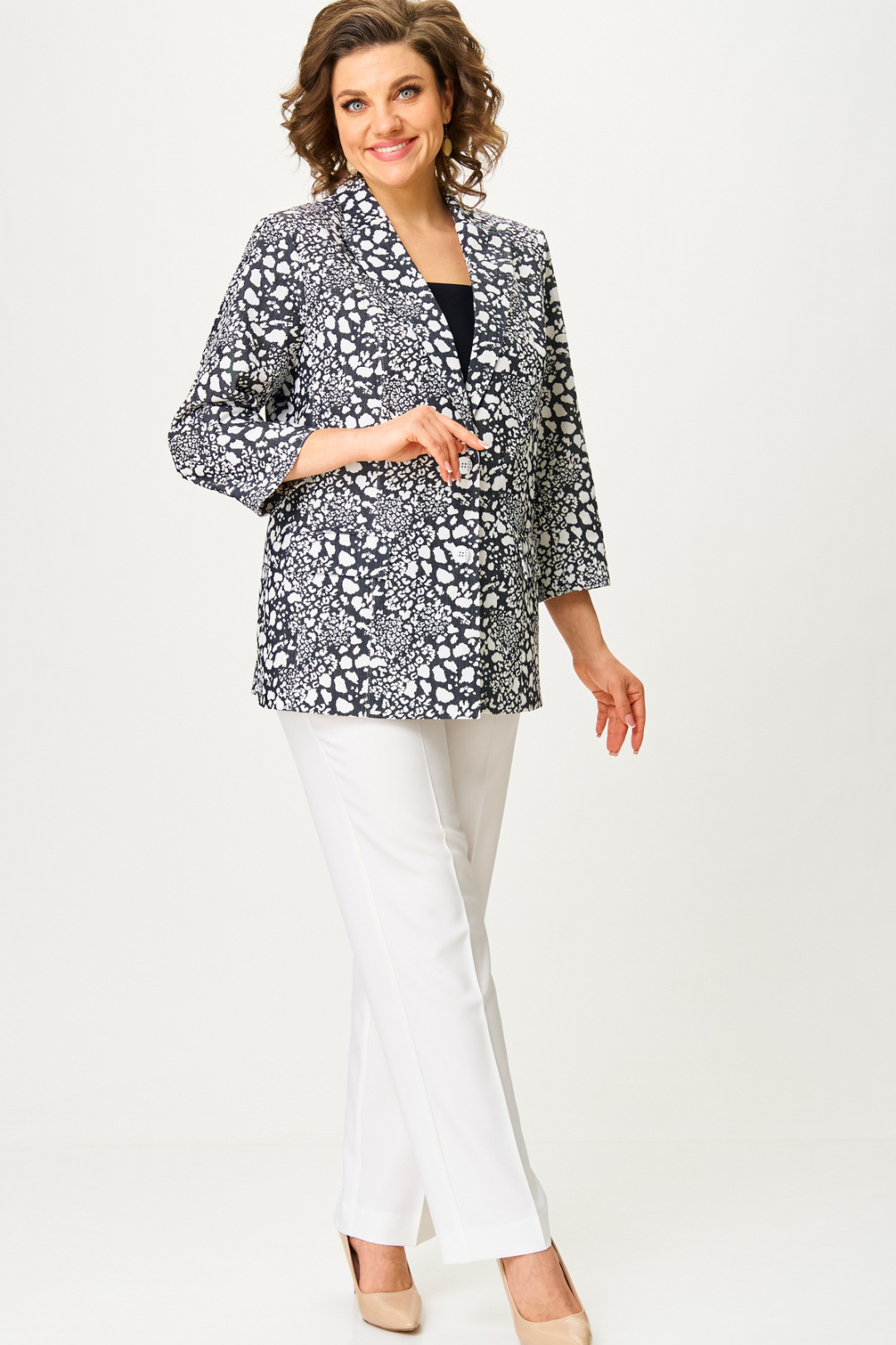 Жакет женский удлиненный, полуприлегающего силуэта с центральной бортовой застежкой на пуговицы до линии перегиба лацкана. Спереди рельефные швы от плечевого шва, отрезной бочок и карман с клапаном. Спинка с рельефами от плечевого шва. Рукав втачной, двухшовный, 3/4, с небольшим разрезом в локтевом шве. Воротник пиджачного типа. Жакет выполнен из джинсовой ткани. Перед жакета на подкладке. Длина рукава 50 см, длина по спинке 68 см
