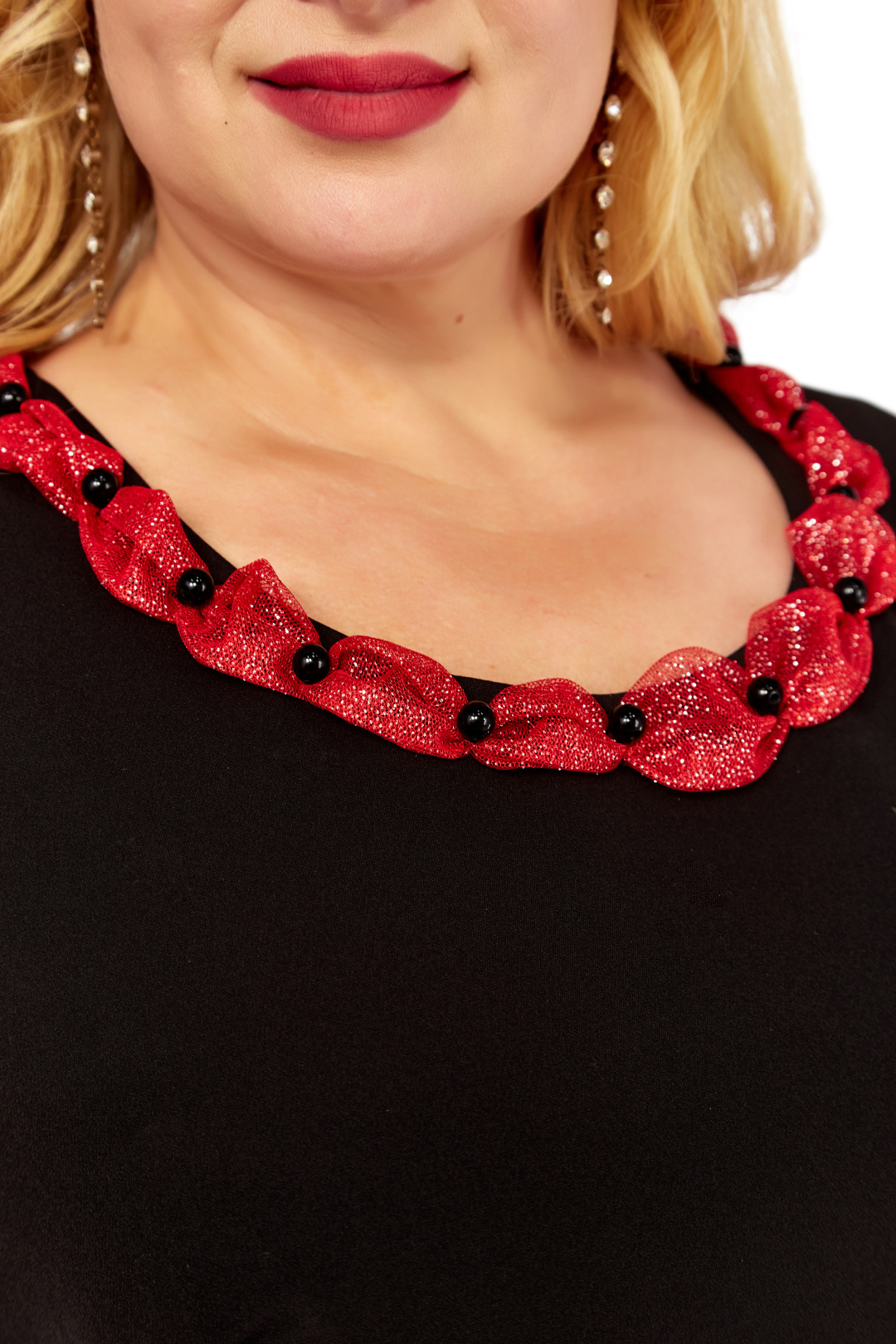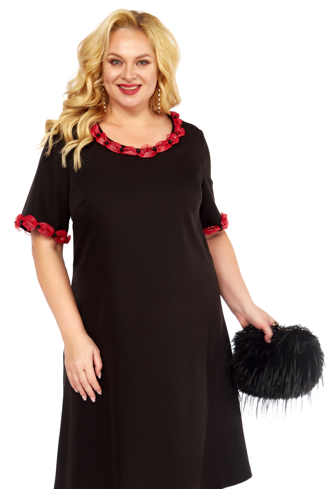 Женское А-образное платье черного цвета. Элегантный и утонченный дизайн, выделяющийся за счет контрастной красной отделки, украшающей горловину и концы коротких втачных рукавов. На спинке платья расположена удобная застежка на молнию для оптимальной посадки. Платье сочетает классический силуэт с изысканными деталями, подходит как для повседневных, так и для торжественных случаев.