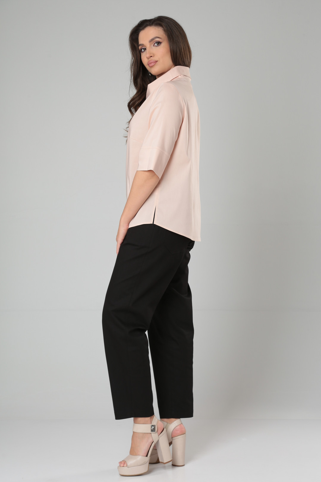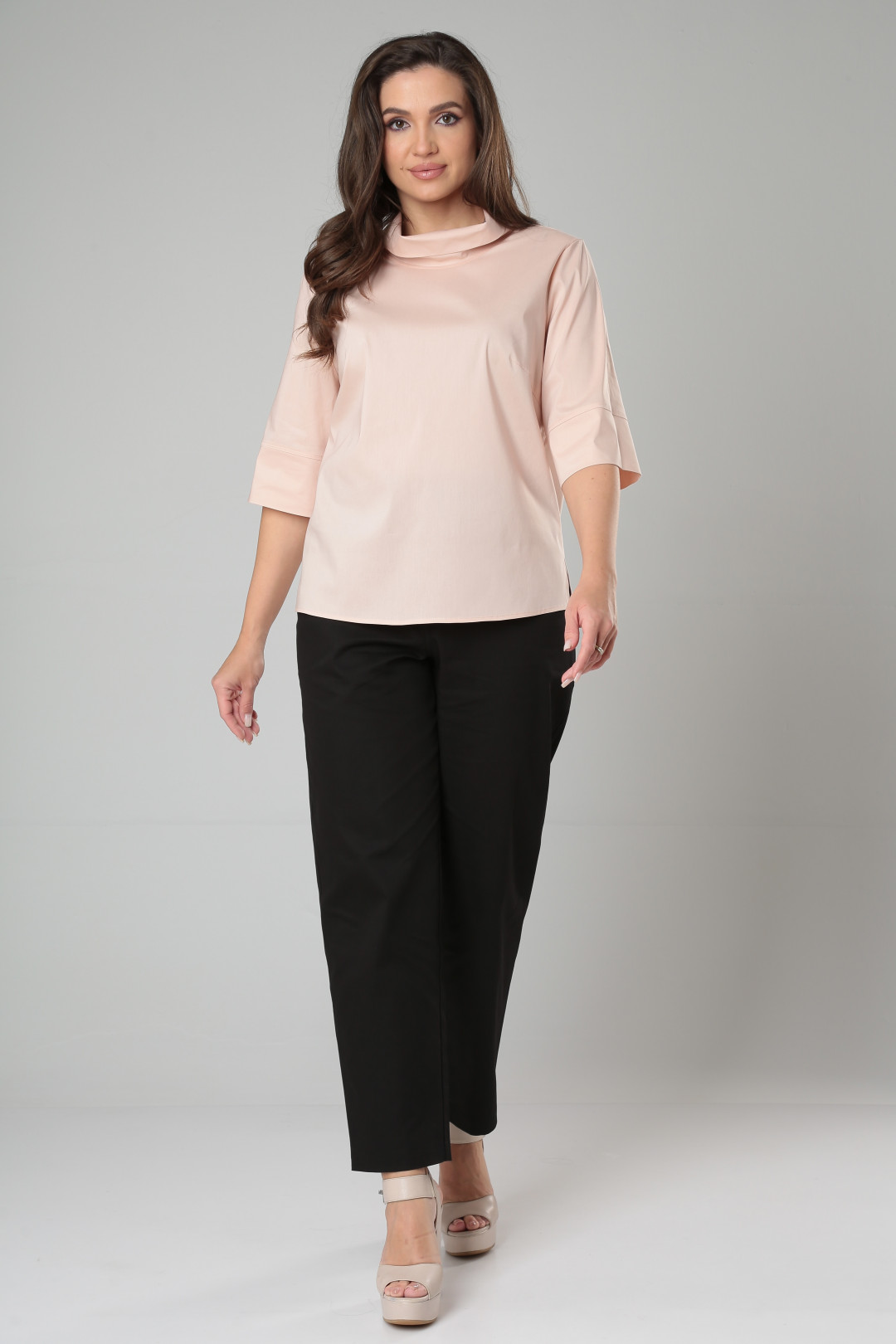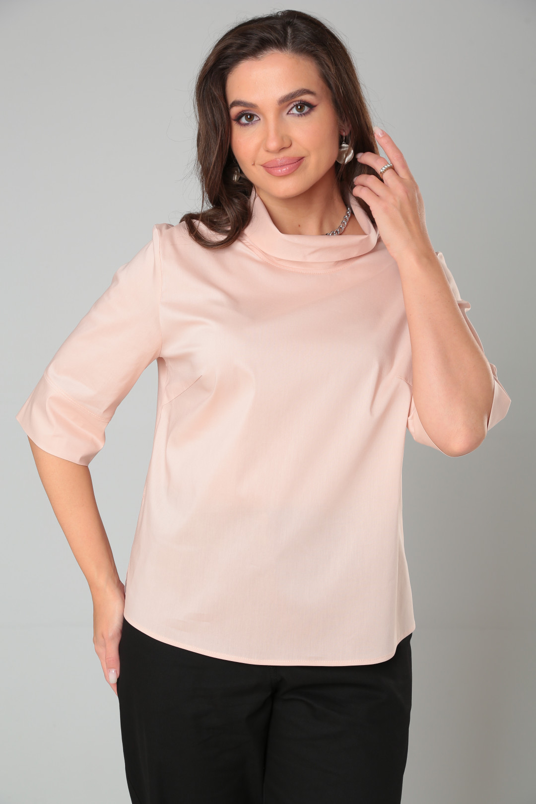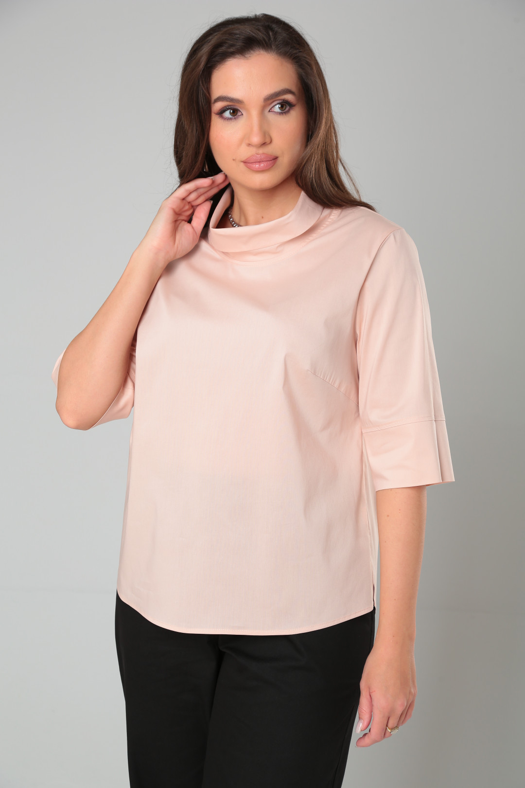 Блузка женская из хлопковой ткани, свободного кроя, отдельное внимание заслуживает двойной ворот-хомут. Модель отлично комбинируется с брюками и юбками, предавая образу деловой или вечерний стиль.