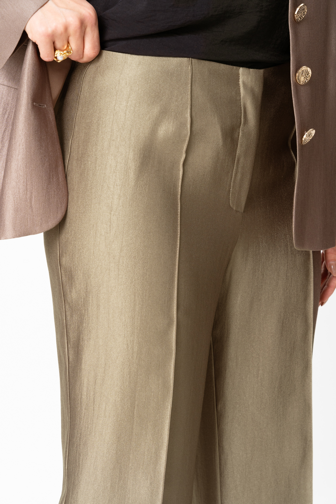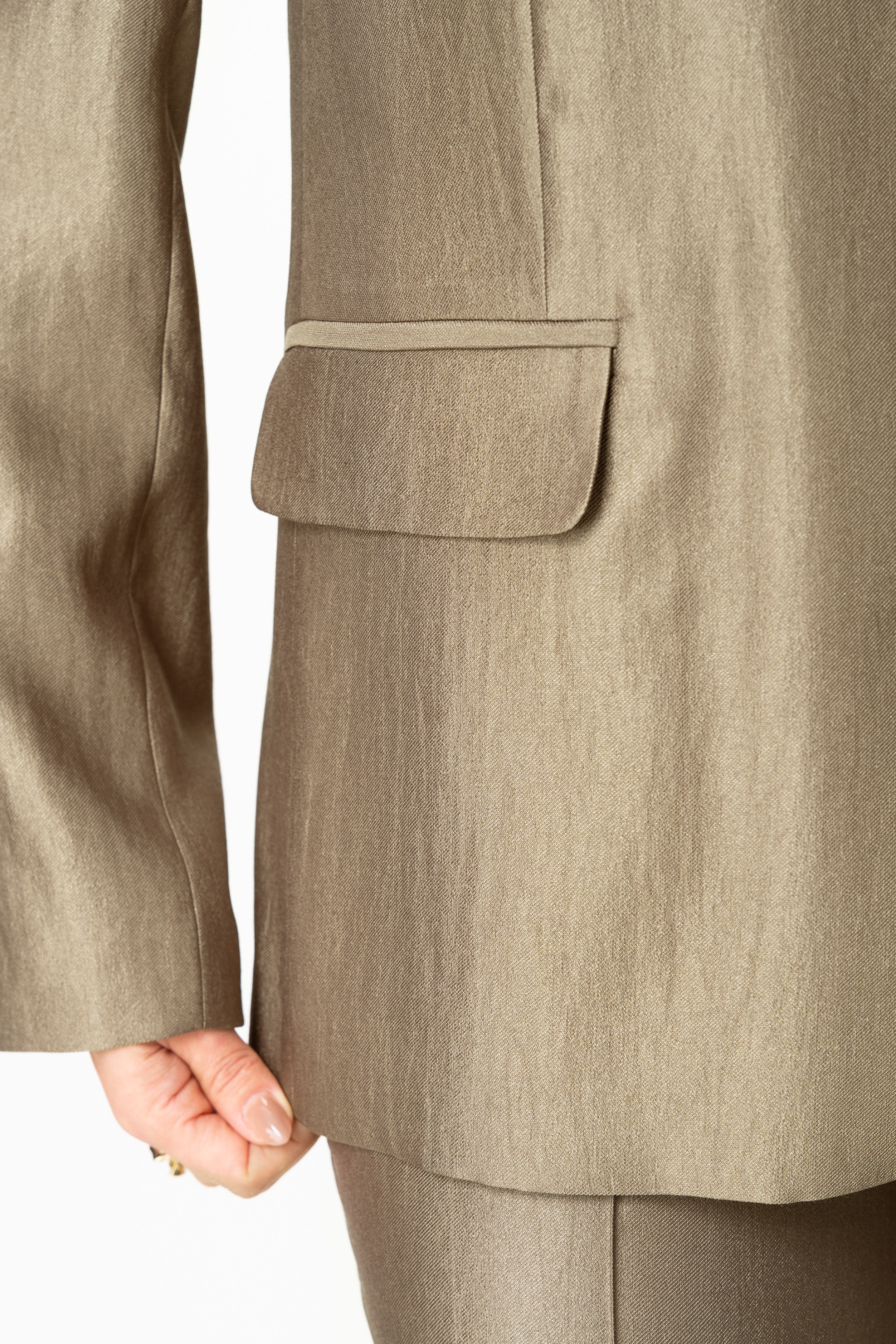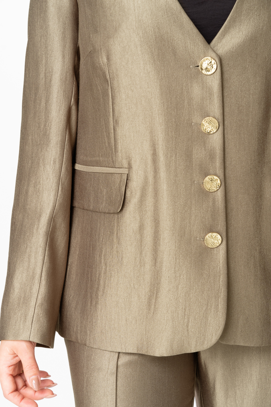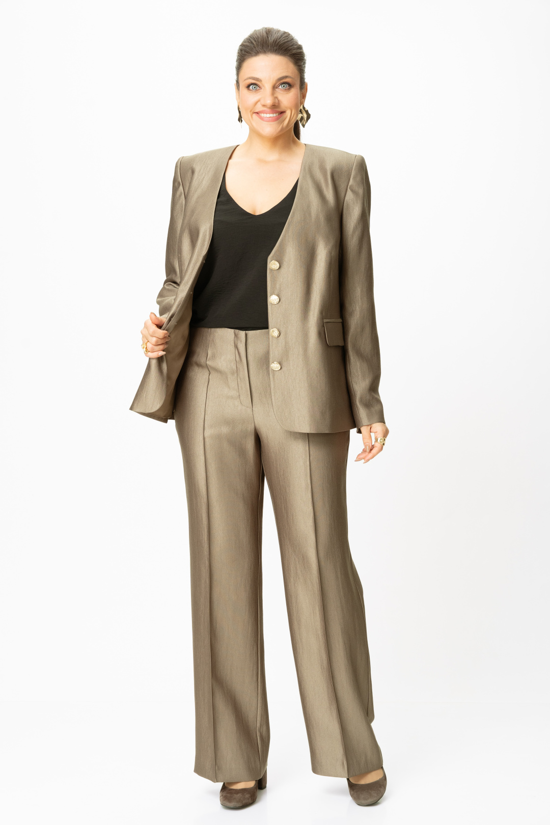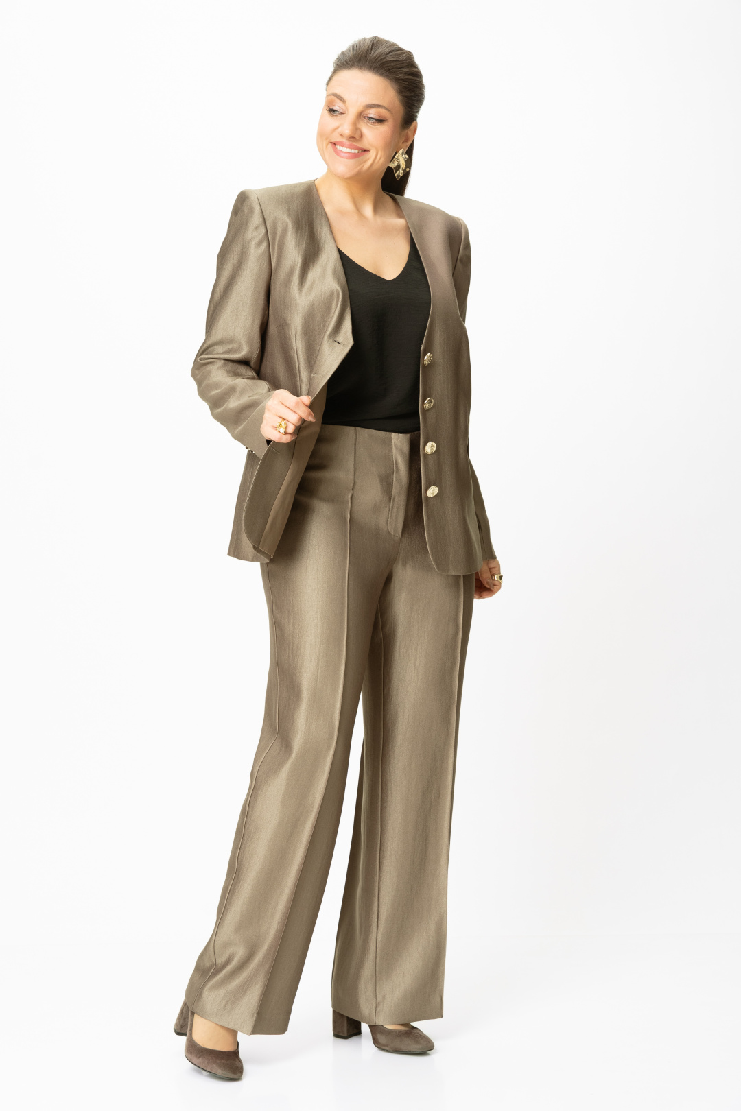 Стильный женский костюм, выполнен в классическом стиле из ткани с небольшим блеском. Костюм состоит из жакета и брюк. Жакет полуприлегающего силуэта, по переду прорезные карманы с клапаном. Горловина «V» образная, застежка центральная на петли-пуговицы. По спинке в центральном шве отлетная шлица по низу. Рукава втачные, по низу отлетная шлица с декором из пуговиц. Жакет на подкладке. Брюки прямые от бедра, с застроченными стрелками по переду и спинке. Застежка по линии банта на молнию и крючок. Верх брюк на обтачке. Длина жакета – 69 см Длина рукава – 63 см Длина брюк по боковому срезу – 109 см Длина брюк по шаговому шву – 82 см