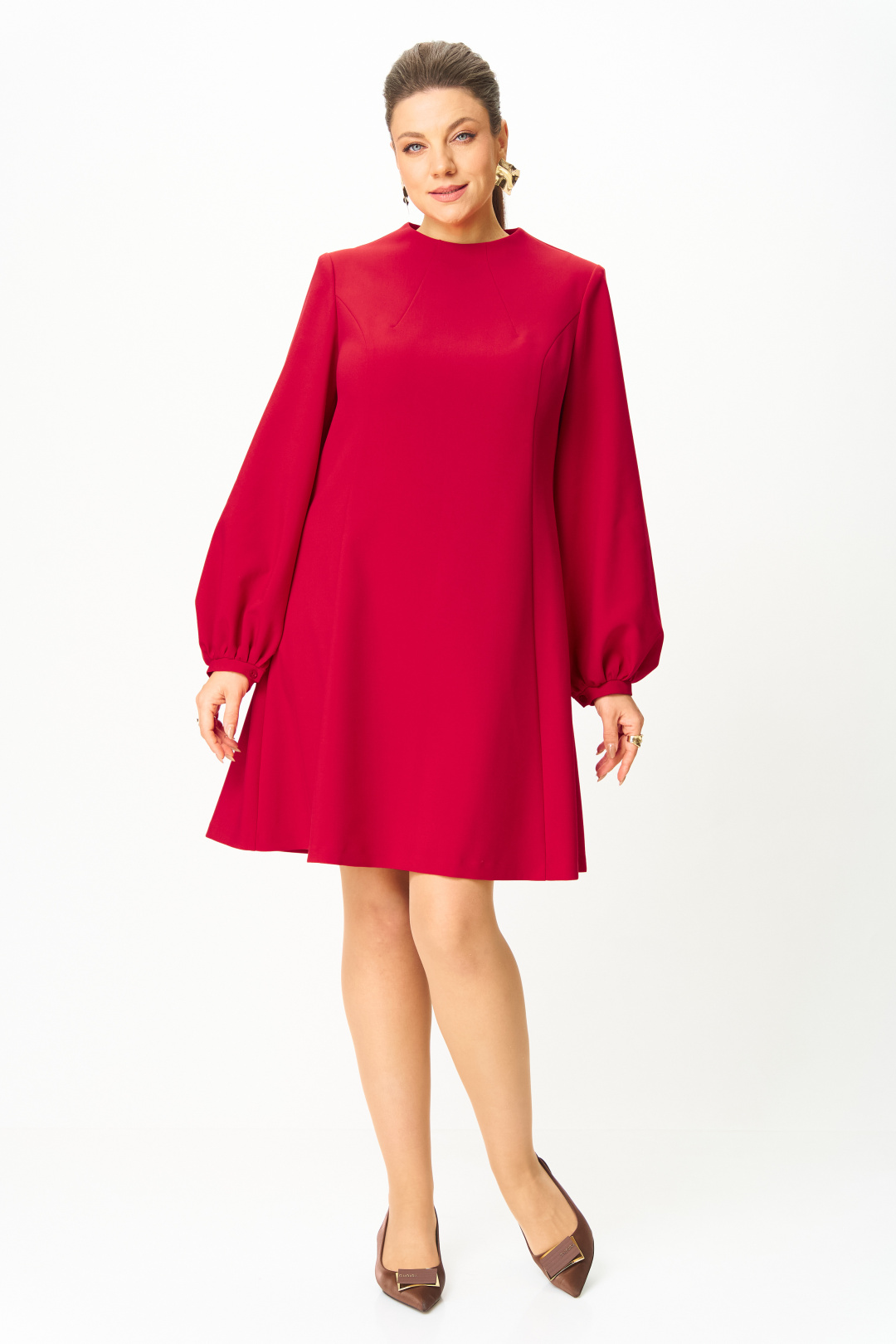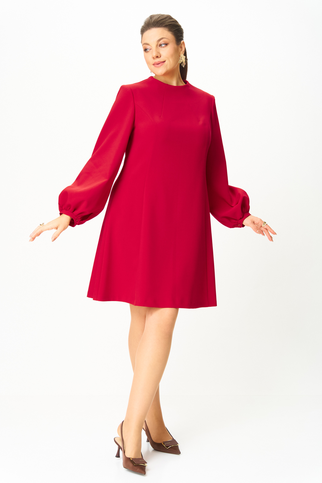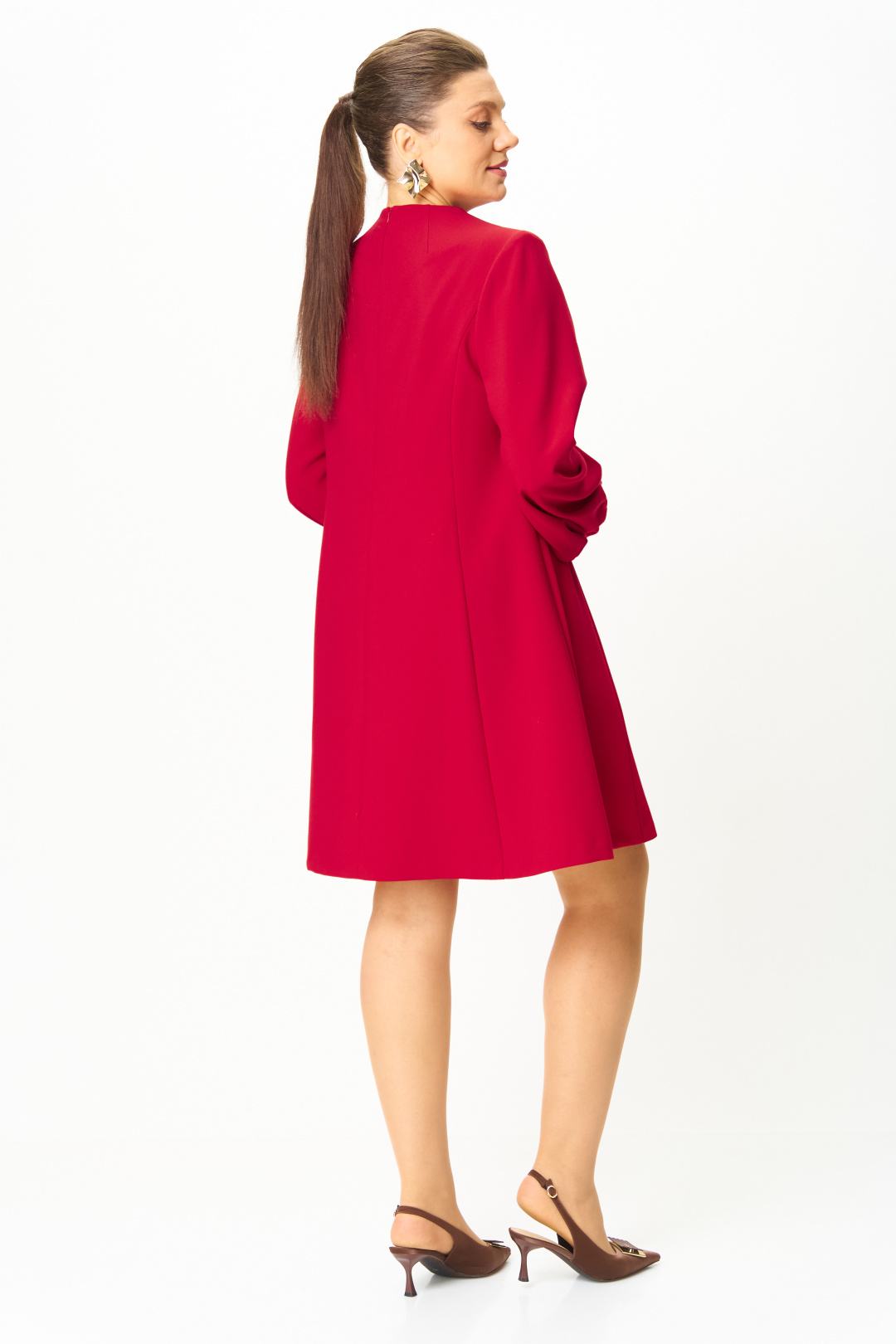 Платье «А» образного силуэта с рельефными швами по переду и спинке. Горловина круглая с цельновыкроенной стойкой. Застежка на тесьму молния в центральном шве спинки. Рукава втачные, со сборкой по низу, на узком манжете с застежкой на петлю и пуговицу.
