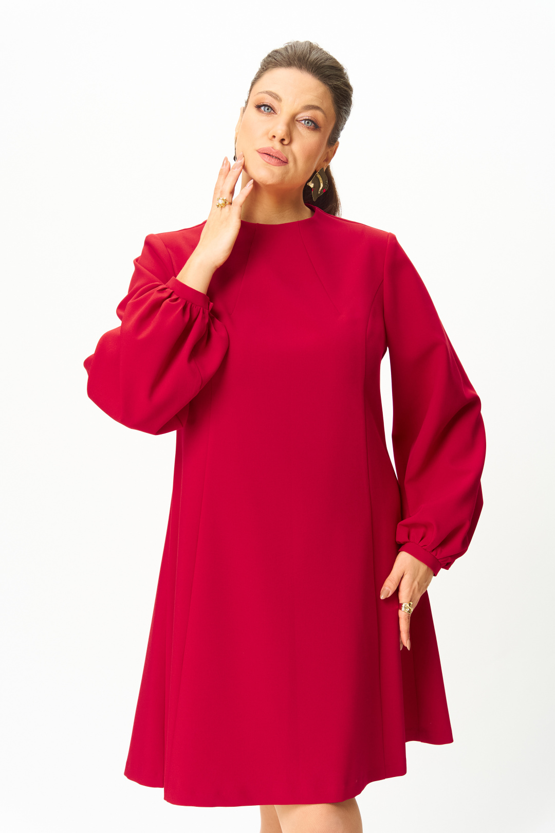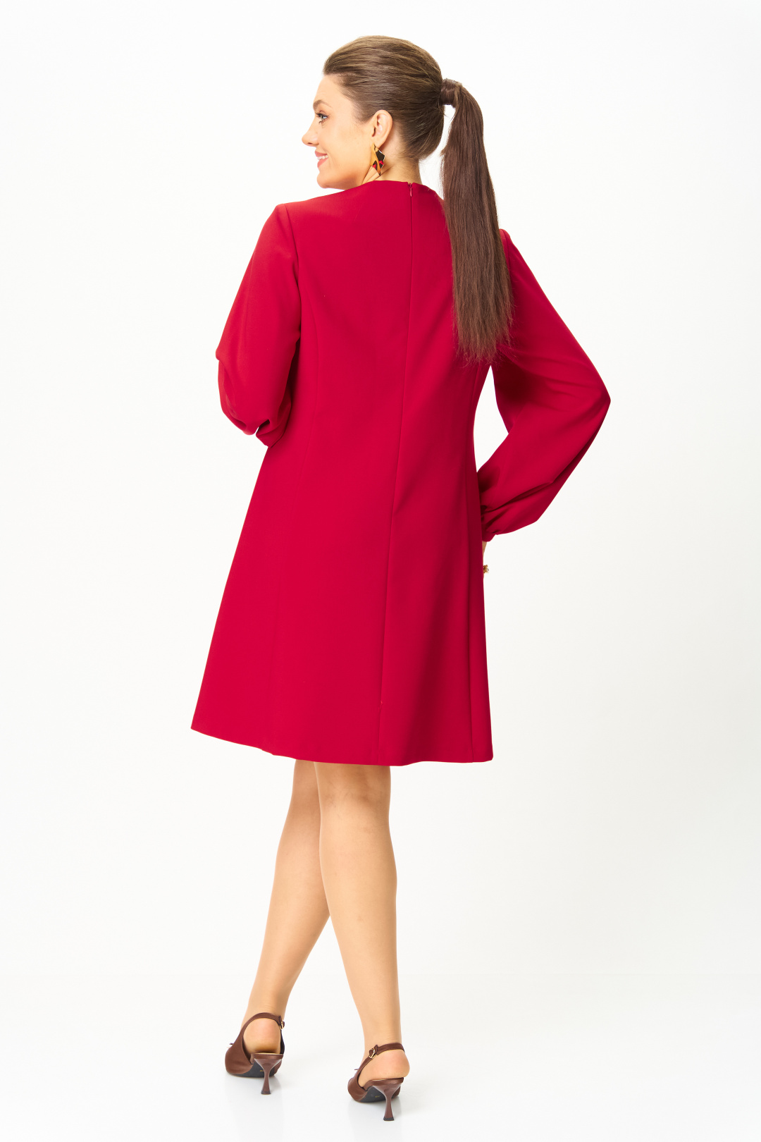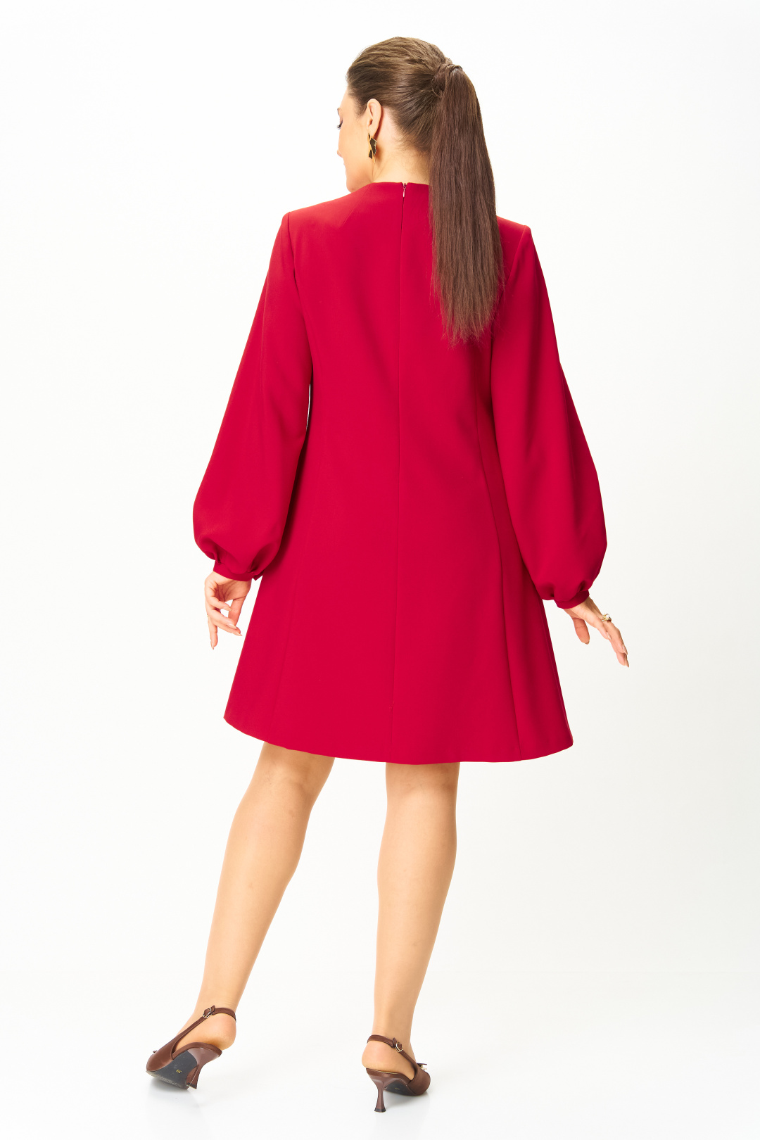 Платье «А» образного силуэта с рельефными швами по переду и спинке. Горловина круглая с цельновыкроенной стойкой. Застежка на тесьму молния в центральном шве спинки. Рукава втачные, со сборкой по низу, на узком манжете с застежкой на петлю и пуговицу.