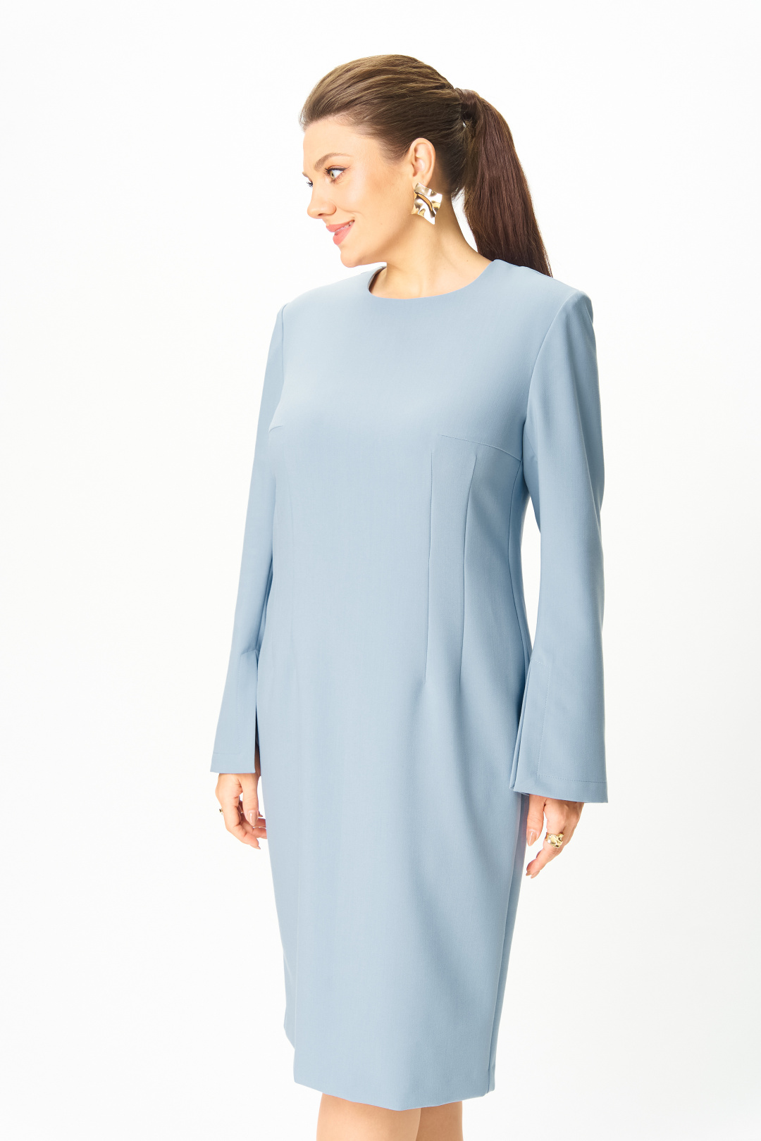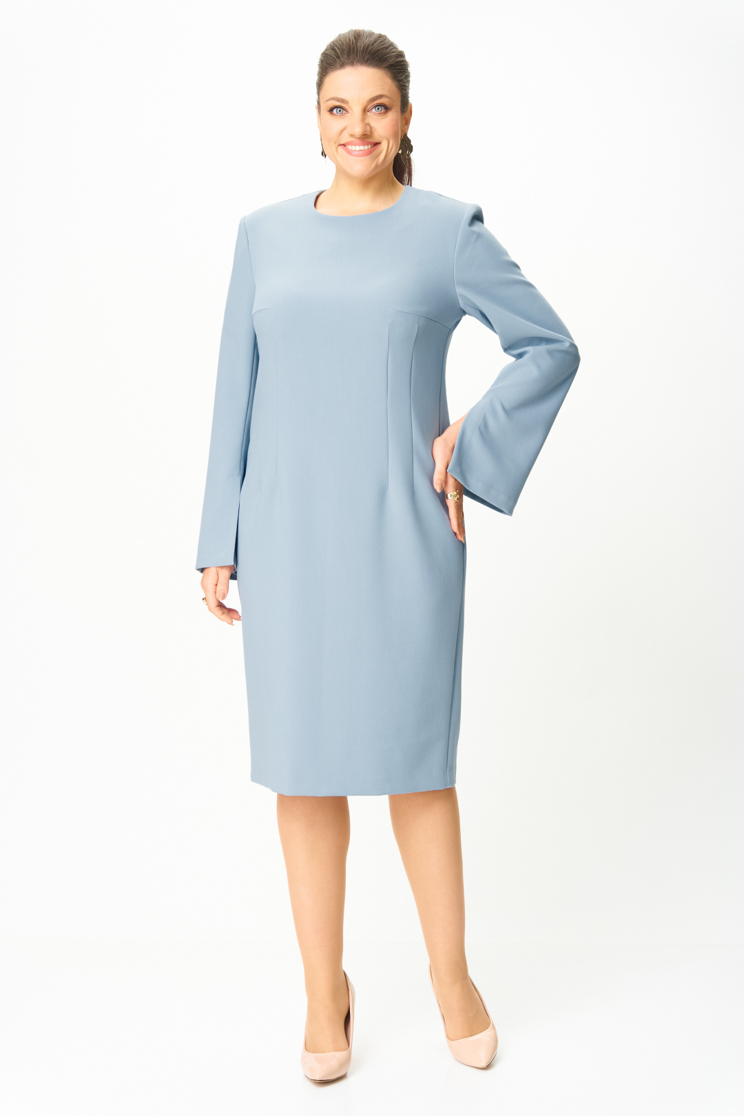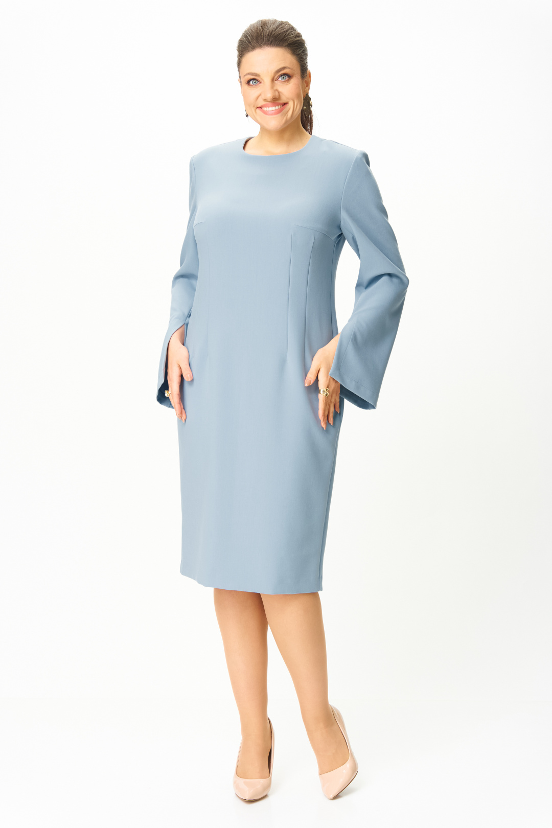 Элегантное женское платье, прилегающего силуэта: по переду и спинке вытачки по талии. Горловина круглая. Застежка на молнию в центральном шве спинки. Рукава втачные, двухшовные, расширенные к низу, в переднем шве, по низу, разрез.