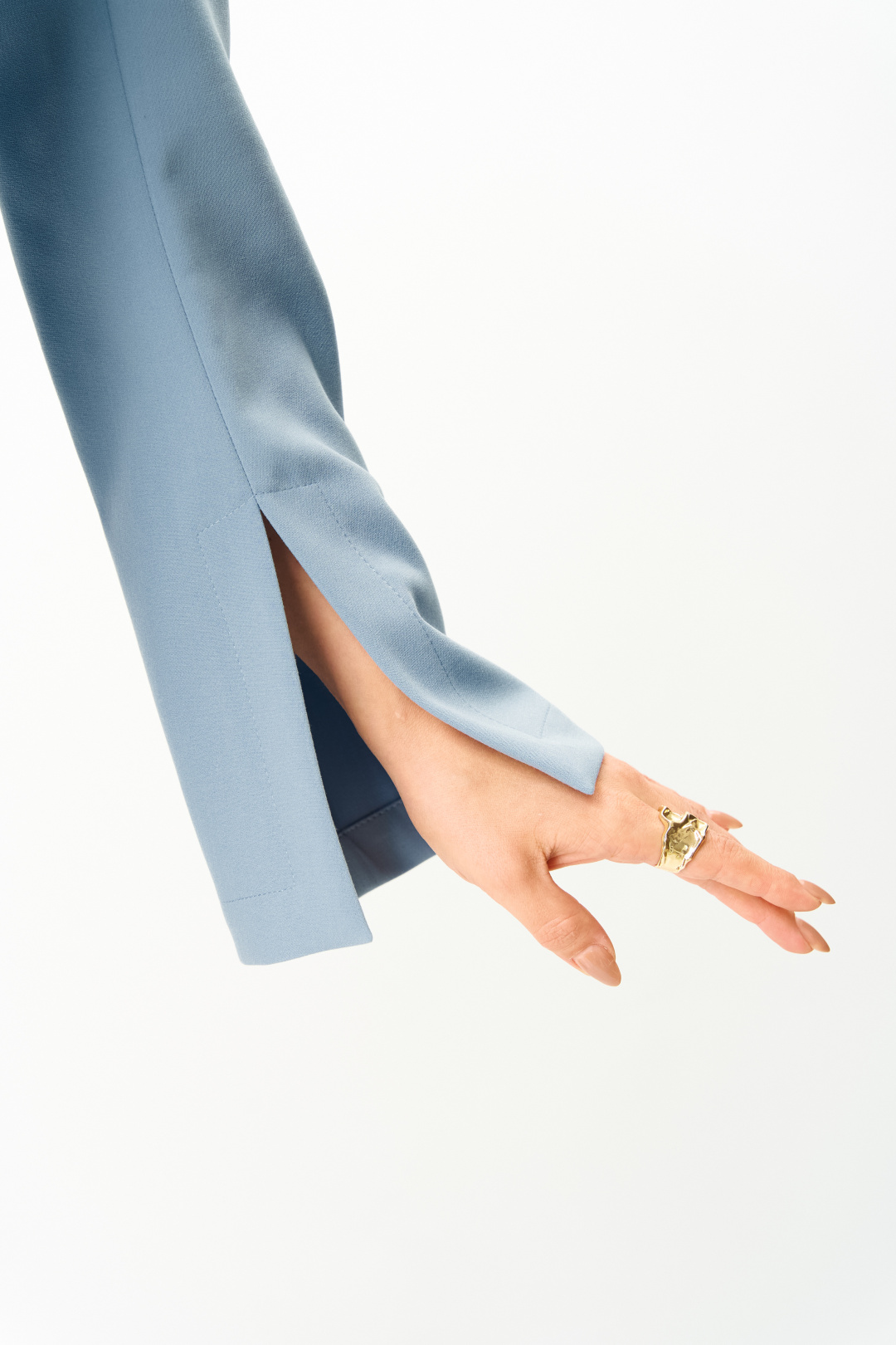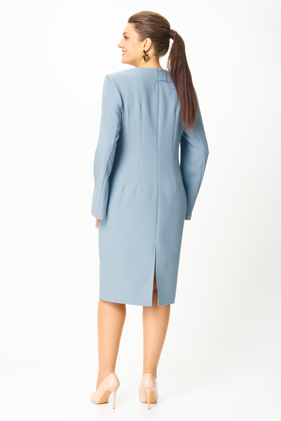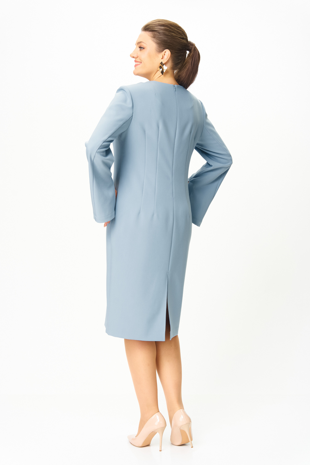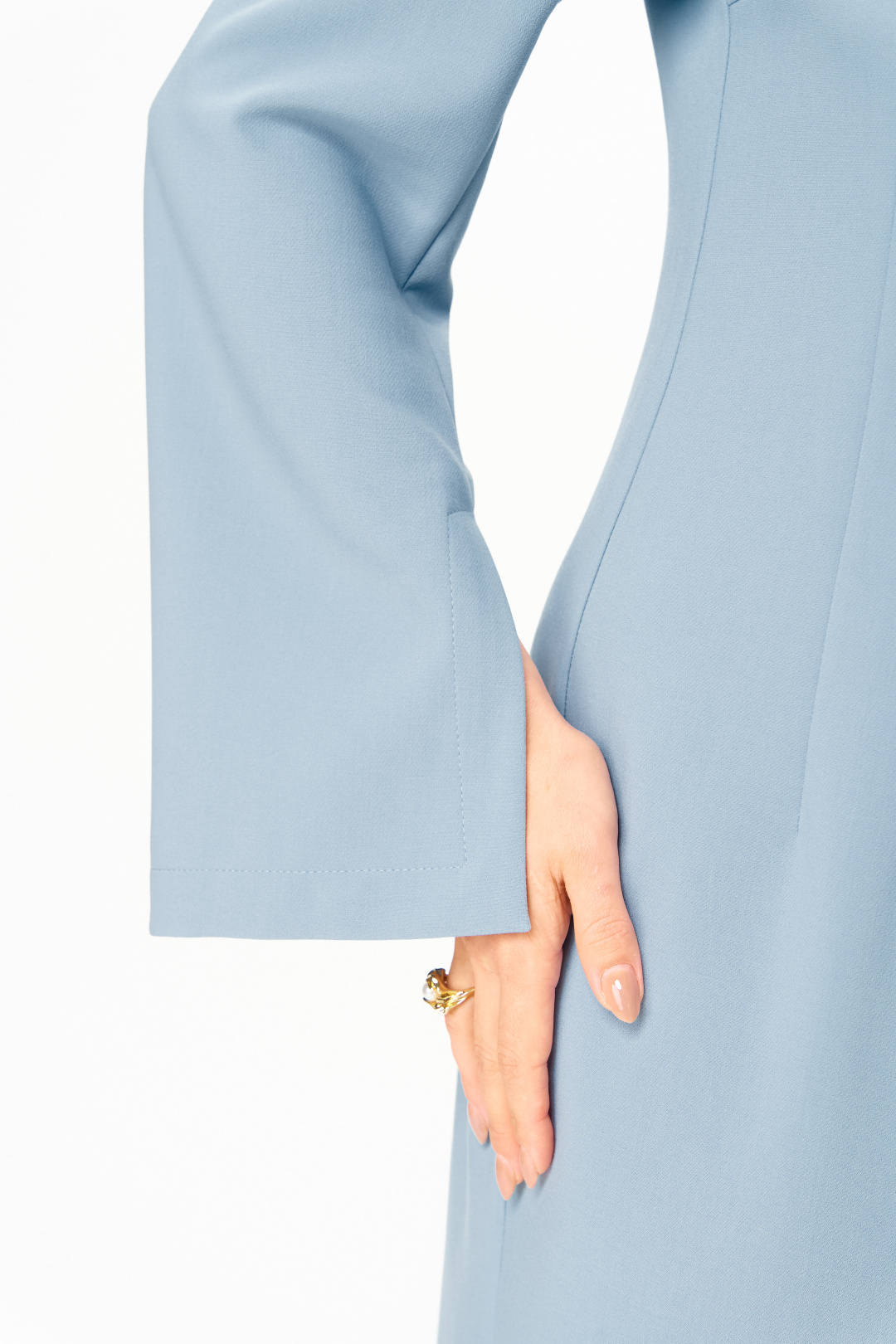 Элегантное женское платье, прилегающего силуэта: по переду и спинке вытачки по талии. Горловина круглая. Застежка на молнию в центральном шве спинки. Рукава втачные, двухшовные, расширенные к низу, в переднем шве, по низу, разрез.