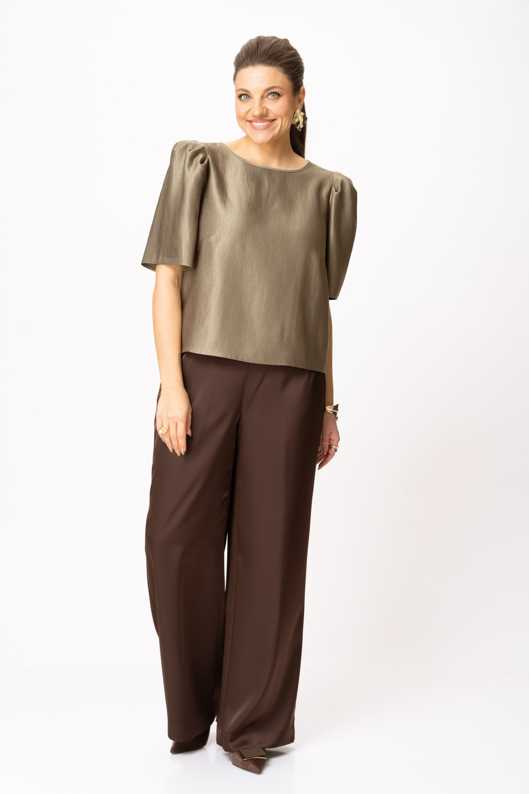 Брюки свободного силуэта, прямые к низу, выполнены из атласной ткани, брюки без застежки, верх брюк на поясе с резинкой.