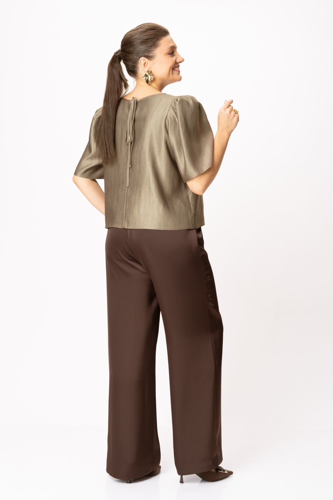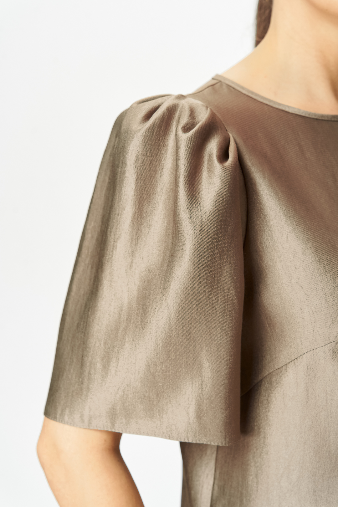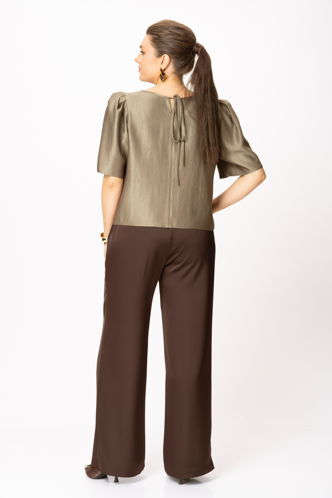 Блузка свободного силуэта из плательной ткани с блеском. Горловина круглая, по спинке в центральном шве разрез возле горловины с завязками.