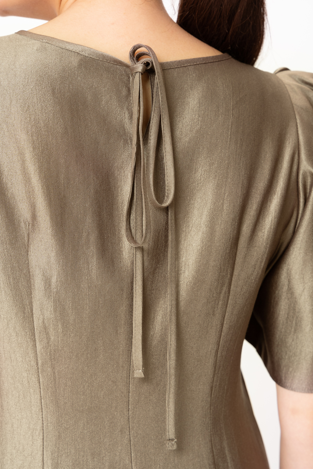 Платье полуприлегающего силуэта, горловина круглая. По спинке в центральном шве разрез возле горловины с завязкой и разрез по низу.