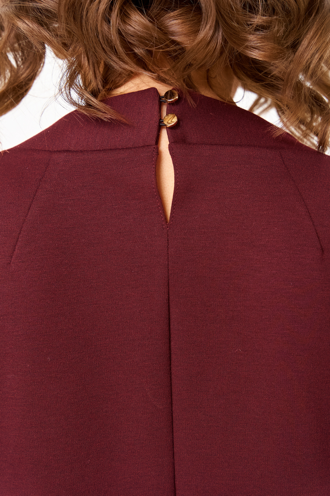 В верхнем шве рукава обработана декоративная планка с пуговицами и разрез по низу. Горловина широкая с воротником-стойка. Со стороны спинки в воротнике обработана застежка с навесными петлями и пуговцами. Вдоль шва горловины расположены декоративные пуговицы.